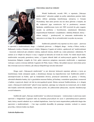 Zniewolony umysł na wolności Witold Szabłowski, rocznik 1981, w reportażu „Tańczące niedźwiedzie” odważnie podjął się próby nakreślenia portretu ludzi, którzy dobrze pamiętają transformację ustrojową w Europie Wschodniej. Sam autor pewnie zna ten okres głównie z książek, ale dla większości jego rozmówców był to przełomowy moment. Spokojne, ustabilizowane życie rok 1989 wywrócił do góry nogami, zaczęły się problemy z bezrobociem, zamykanymi fabrykami, niepotrzebnymi bunkrami i urzędnikami z dalekiej Brukseli, którzy – wbrew tradycji – przekonywali, że zmuszanie niedźwiedzia do tańczenia to coś złego. Bo to od niedźwiedzi wszystko się zaczyna. Szabłowski podzielił swój reportaż na dwie części – pierwsza to opowieść o niedźwiedziach, druga – o ludziach, pierwsza – o Bułgarii, druga – trochę o Polsce, trochę o Bałkanach, trochę o Ukrainie, nawet o Kubie. Bułgarscy Cyganie od wieków „opiekowali się” niedźwiedziami – tresowali, traktowali jak członków rodziny, nadawali imiona, dzielili się z nimi jedzeniem i alkoholem. W zamian za to wbijali im obręcze w nosy i ciągnęli na łańcuchu od wioski do wioski. Na widok innych ludzi, niedźwiedzie zaczynały groteskowy taniec, a Cyganie zbierali datki od zachwyconych gapiów. Po upadku komunizmu Bułgaria wstąpiła do Unii, gdzie stanowczo potępiono męczarnie niedźwiedzi, a organizacje walczące o prawa zwierząt odebrały Cyganom ich Wale, Isaury i Mimy. Jak jednak nauczyć zniewolone przez lata zwierzęta życia na wolności, jak oduczyć kłopotliwego nawyku tańczenia? Druga część „Tańczących niedźwiedzi” to już dziewięć krótszych reportaży głównie o życiu po transformacji, kiedy entuzjazm opada, a demokracja okazuje się niepozbawiona wad. Szabłowski jeździł z autostopowiczami na Kubie, spał na londyńskim dworcu, przemycał samochody na granicy z Ukrainą, odwiedził albańskie bunkry, był w gruzińskim muzeum Stalina, pił herbatę z estońskimi apatrydami, rozmawiał z ludźmi, wypytywał, drążył, nie bał się niewygodnych pytań. Można zarzucać Szabłowskiemu, że w drugiej części „Tańczących niedźwiedzi” spłycił swoje reportaże, opierając się wyłącznie na rozmowach, ale to dzięki nim książka zachowała dynamikę. Autor pisze prosto, ale jednocześnie plastycznie, zręcznie charakteryzuje swoich bohaterów. Szabłowski oparł „Tańczące niedźwiedzie” na ciekawym koncepcie – wykorzystana w pierwszej części opowieść o bułgarskich Cyganach stała się metaforą przywykłych do życia w paternalistycznym państwie ludzi, którzy musieli odnaleźć się w realiach kapitalizmu. Autor być może niepotrzebnie podkreślał drugie dno opowieści o niedźwiedziach – i bez tego czytelnik doszedłby do ponurego wniosku: wolność to czasem przywilej, z którym trudno się obejść. Gabriela Będkowska