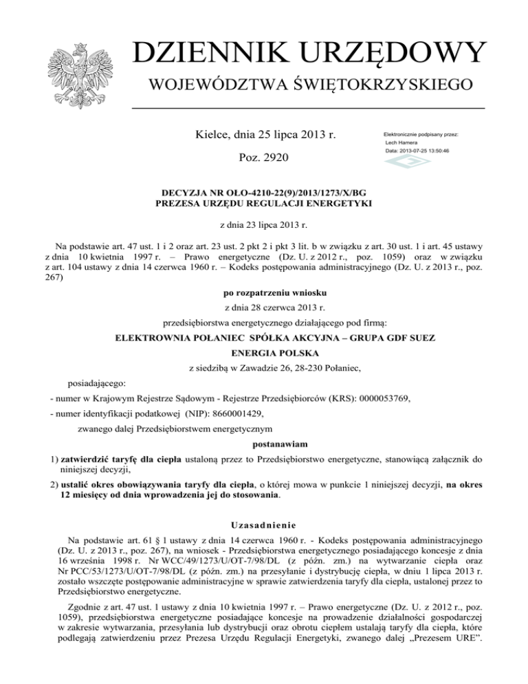 DZIENNIK URZĘDOWY WOJEWÓDZTWA ŚWIĘTOKRZYSKIEGO Kielce, dnia 25 lipca 2013 r. Elektronicznie podpisany przez: Lech Hamera Poz. 2920 Data: 2013-07-25 13:50:46 DECYZJA NR OŁO-4210-22(9)/2013/1273/X/BG PREZESA URZĘDU REGULACJI ENERGETYKI z dnia 23 lipca 2013 r. Na podstawie art. 47 ust. 1 i 2 oraz art. 23 ust. 2 pkt 2 i pkt 3 lit. b w związku z art. 30 ust. 1 i art. 45 ustawy z dnia 10 kwietnia 1997 r. – Prawo energetyczne (Dz. U. z 2012 r., poz. 1059) oraz w związku z art. 104 ustawy z dnia 14 czerwca 1960 r. – Kodeks postępowania administracyjnego (Dz. U. z 2013 r., poz. 267) po rozpatrzeniu wniosku z dnia 28 czerwca 2013 r. przedsiębiorstwa energetycznego działającego pod firmą: ELEKTROWNIA POŁANIEC SPÓŁKA AKCYJNA – GRUPA GDF SUEZ ENERGIA POLSKA z siedzibą w Zawadzie 26, 28-230 Połaniec, posiadającego: - numer w Krajowym Rejestrze Sądowym - Rejestrze Przedsiębiorców (KRS): 0000053769, - numer identyfikacji podatkowej (NIP): 8660001429, zwanego dalej Przedsiębiorstwem energetycznym postanawiam 1) zatwierdzić taryfę dla ciepła ustaloną przez to Przedsiębiorstwo energetyczne, stanowiącą załącznik do niniejszej decyzji, 2) ustalić okres obowiązywania taryfy dla ciepła, o której mowa w punkcie 1 niniejszej decyzji, na okres 12 miesięcy od dnia wprowadzenia jej do stosowania. Uzasadnienie Na podstawie art. 61 § 1 ustawy z dnia 14 czerwca 1960 r. - Kodeks postępowania administracyjnego (Dz. U. z 2013 r., poz. 267), na wniosek - Przedsiębiorstwa energetycznego posiadającego koncesje z dnia 16 września 1998 r. Nr WCC/49/1273/U/OT-7/98/DL (z późn. zm.) na wytwarzanie ciepła oraz Nr PCC/53/1273/U/OT-7/98/DL (z późn. zm.) na przesyłanie i dystrybucję ciepła, w dniu 1 lipca 2013 r. zostało wszczęte postępowanie administracyjne w sprawie zatwierdzenia taryfy dla ciepła, ustalonej przez to Przedsiębiorstwo energetyczne. Zgodnie z art. 47 ust. 1 ustawy z dnia 10 kwietnia 1997 r. – Prawo energetyczne (Dz. U. z 2012 r., poz. 1059), przedsiębiorstwa energetyczne posiadające koncesje na prowadzenie działalności gospodarczej w zakresie wytwarzania, przesyłania lub dystrybucji oraz obrotu ciepłem ustalają taryfy dla ciepła, które podlegają zatwierdzeniu przez Prezesa Urzędu Regulacji Energetyki, zwanego dalej „Prezesem URE”. Dziennik Urzędowy Województwa Świętokrzyskiego –2– Poz. 2920 Natomiast w myśl art. 23 ust. 2 pkt 2 i pkt 3 lit. b ustawy – Prawo energetyczne, do zakresu działania Prezesa URE należy zatwierdzanie i kontrolowanie stosowania taryf paliw gazowych, energii elektrycznej i ciepła pod względem zgodności z zasadami określonymi w art. 44- 46, w tym analizowanie i weryfikowanie kosztów przyjmowanych przez przedsiębiorstwo energetyczne jako uzasadnione do kalkulacji cen i stawek opłat zawartych w taryfach oraz ustalanie okresu obowiązywania taryf. Zgodnie z treścią art. 47 ust. 2f ustawy – Prawo energetyczne planowane przychody ze sprzedaży ciepła przyjmowane do kalkulacji cen i stawek opłat w taryfie dla ciepła dla jednostek kogeneracji, oblicza się przy zastosowaniu wskaźnika referencyjnego ustalanego przez Prezesa URE zgodnie z metodologią określoną w przepisach wydanych na podstawie art. 46 ust. 5 i 6 ustawy – Prawo energetyczne i średnich cen sprzedaży ciepła, o których mowa w art. 23 ust. 2 pkt 18 lit. c. W trakcie postępowania administracyjnego, zwrócono się do Przedsiębiorstwa energetycznego o złożenie dodatkowych wyjaśnień, dotyczących sposobu opracowania przedstawionej taryfy, wielkości rzeczowych i kosztów jakie Przedsiębiorstwo energetyczne przyjęło jako uzasadnione do skalkulowania cen i stawek opłat zawartych w tej taryfie. Na podstawie dostarczonej dokumentacji i złożonych wyjaśnień ustalono, że Przedsiębiorstwo energetyczne opracowało taryfę zgodnie z zasadami określonymi w art. 44 - 46 ustawy – Prawo energetyczne oraz zgodnie z przepisami rozporządzenia Ministra Gospodarki z dnia 17 września 2010 r. w sprawie szczegółowych zasad kształtowania i kalkulacji taryf oraz rozliczeń z tytułu zaopatrzenia w ciepło (Dz. U. Nr 194, poz. 1291), zwanego dalej „rozporządzeniem taryfowym”. Ustalone przez Przedsiębiorstwo energetyczne ceny ciepła skalkulowane zostały na podstawie uzasadnionych planowanych przychodów ze sprzedaży ciepła dla jednostek kogeneracji przy zastosowaniu wskaźnika referencyjnego ustalanego przez Prezesa URE zgodnie z metodologią określoną w przepisach rozporządzenia taryfowego i średnich cen sprzedaży ciepła, o których mowa w art. 23 ust. 2 pkt 18 lit. c ustawy – Prawo energetyczne. Stawki opłat za usługi przesyłowe zostały ustalone na podstawie uzasadnionego planowanego przychodu ze sprzedaży ciepła – określonego dla pierwszego roku stosowania taryfy - obejmującego uzasadnione roczne koszty wykonywania działalności gospodarczej w zakresie przesyłania i dystrybucji ciepła. Oceny kosztów dokonano przez porównanie kosztów jednostkowych planowanych na pierwszy rok stosowania taryfy z kosztami jednostkowymi poniesionymi przez przedsiębiorstwo energetyczne w roku kalendarzowym 2012 w zakresie przesyłania i dystrybucji ciepła. Wprowadzenie do rozliczeń z odbiorcami cen i stawek opłat ustalonych w zatwierdzonej taryfie skutkuje przewidywanym średnim wzrostem opłat dla odbiorców w wysokości 7,24 %. Ustalony zgodnie z wnioskiem Przedsiębiorstwa energetycznego i treścią § 13 ust. 8 rozporządzenia taryfowego, jednoroczny okres obowiązywania taryfy nie powoduje konieczności ustalania współczynnika korekcyjnego Xr, o którym mowa w § 27 ust. 2 ww. rozporządzenia taryfowego. W tym stanie rzeczy postanowiłem orzec, jak w sentencji. POUCZENIE 1. Od niniejszej decyzji przysługuje odwołanie do Sądu Okręgowego w Warszawie – Sądu Ochrony Konkurencji i Konsumentów - za pośrednictwem Prezesa URE, w terminie dwutygodniowym od dnia jej doręczenia (art. 30 ust. 2 i 3 ustawy – P
