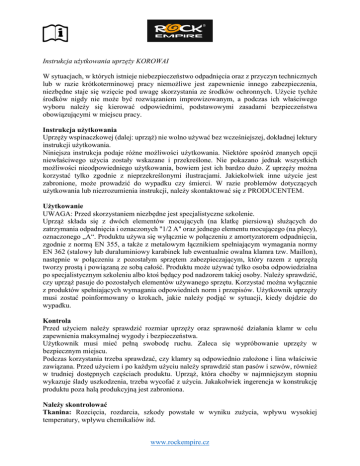 Instrukcja użytkowania uprzęży KOROWAI W sytuacjach, w których istnieje niebezpieczeństwo odpadnięcia oraz z przyczyn technicznych lub w razie krótkoterminowej pracy niemożliwe jest zapewnienie innego zabezpieczenia, niezbędne staje się wzięcie pod uwagę skorzystania ze środków ochronnych. Użycie tychże środków nigdy nie może być rozwiązaniem improwizowanym, a podczas ich właściwego wyboru należy się kierować odpowiednimi, podstawowymi zasadami bezpieczeństwa obowiązującymi w miejscu pracy. Instrukcja użytkowania Uprzęży wspinaczkowej (dalej: uprząż) nie wolno używać bez wcześniejszej, dokładnej lektury instrukcji użytkowania. Niniejsza instrukcja podaje różne możliwości użytkowania. Niektóre spośród znanych opcji niewłaściwego użycia zostały wskazane i przekreślone. Nie pokazano jednak wszystkich możliwości nieodpowiedniego użytkowania, bowiem jest ich bardzo dużo. Z uprzęży można korzystać tylko zgodnie z nieprzekreślonymi ilustracjami. Jakiekolwiek inne użycie jest zabronione, może prowadzić do wypadku czy śmierci. W razie problemów dotyczących użytkowania lub niezrozumienia instrukcji, należy skontaktować się z PRODUCENTEM. Użytkowanie UWAGA: Przed skorzystaniem niezbędne jest specjalistyczne szkolenie. Uprząż składa się z dwóch elementów mocujących (na klatkę piersiową) służących do zatrzymania odpadnięcia i oznaczonych "1/2 A" oraz jednego elementu mocującego (na plecy), oznaczonego „A“. Produktu używa się wyłącznie w połączeniu z amortyzatorem odpadnięcia, zgodnie z normą EN 355, a także z metalowym łącznikiem spełniającym wymagania normy EN 362 (stalowy lub duraluminiowy karabinek lub ewentualnie owalna klamra tzw. Maillon), następnie w połączeniu z pozostałym sprzętem zabezpieczającym, który razem z uprzężą tworzy prostą i powiązaną ze sobą całość. Produktu może używać tylko osoba odpowiedzialna po specjalistycznym szkoleniu albo ktoś będący pod nadzorem takiej osoby. Należy sprawdzić, czy uprząż pasuje do pozostałych elementów używanego sprzętu. Korzystać można wyłącznie z produktów spełniających wymagania odpowiednich norm i przepisów. Użytkownik uprzęży musi zostać poinformowany o krokach, jakie należy podjąć w sytuacji, kiedy dojdzie do wypadku. Kontrola Przed użyciem należy sprawdzić rozmiar uprzęży oraz sprawność działania klamr w celu zapewnienia maksymalnej wygody i bezpieczeństwa. Użytkownik musi mieć pełną swobodę ruchu. Zaleca się wypróbowanie uprzęży w bezpiecznym miejscu. Podczas korzystania trzeba sprawdzać, czy klamry są odpowiednio założone i lina właściwie zawiązana. Przed użyciem i po każdym użyciu należy sprawdzić stan pasów i szwów, również w trudniej dostępnych częściach produktu. Uprząż, która choćby w najmniejszym stopniu wykazuje ślady uszkodzenia, trzeba wycofać z użycia. Jakakolwiek ingerencja w konstrukcję produktu poza halą produkcyjną jest zabroniona. Należy skontrolować Tkanina: Rozcięcia, rozdarcia, szkody powstałe w wyniku zużycia, wpływu wysokiej temperatury, wpływu chemikaliów itd. www.rockempire.cz Szwy: Przetarte, rozcięte lub prujące się nici. Klamry: Właściwe działanie klamer. Elementy metalowe: korozja, zużycie itp. Duże odpadnięcie Po dużym odpadnięciu produkt należy wycofać z użycia. W przypadku wątpliwości prześlij produkt do kontroli. Nie zapominaj o tym, że Twoje życie i bezpieczeństwo mają o wiele wyższą cenę niż nowa uprząż. Materiały Uprząż została wyprodukowana z włókien syntetycznych PA i PES. Stalowe klamry i elementy mocujące są na swej powierzchni zabezpieczone zgodnie z normą EN 362. Czyszczenie Ubrudzoną uprząż można myć czystą wodą lub delikatnymi środkami piorącymi (maks. 30°C), po czym dobrze ususzyć w ciemnym pomieszczeniu z dostępem powietrza. Uprząż trzeba suszyć w sposób naturalny, bez użycia ognia czy innych źródeł ciepła. Dezynfekcja Jeżeli dezynfekcja jest niezbędna, należy użyć odpowiedniego środka przeznaczonego do poliamidu i poliestru. Rozpuszczony w wodzie (maks. temperatura 30°C) środek dezynfekujący nanieś na uprząż i pozwól, by działał godzinę. Następnie wypierz produkt w czystej wodzie i wysusz go w słabo ogrzewanym, ciemnym pomieszczeniu z dostępem powietrza. Uprząż trzeba suszyć w sposób naturalny, bez użycia ognia czy innych źródeł ciepła. Chemikalia Chroń produkt przed kontaktem z substancjami żrącymi i rozpuszczalnikami (kwasami). Te chemikalia są bardzo niebezpieczne dla włókien syntetycznych. Transport i przechowywanie Uprząż należy przechowywać w suchym, ciemnym pomieszczeniu z dostępem powietrza. Unikaj długotrwałego oddziaływania promieni UV. Nie przechowuj ani nie susz w bezpośredniej bliskości źródeł ciepła. Podczas przechowywania uprząż nie może być powykręcana i przygnieciona. Producent dostarcza uprząż w wykonanym z tkaniny worku, który jest jednocześnie bardzo dobrym opakowaniem przeznaczonym do przechowywania i transportu produktu. Temperatura Zalecane jest korzystanie z uprzęży w temperaturach od -40°C do +80 °C. W tym zakresie temperatur produkt zachowuje niezbędną wytrzymałość. Żywotność produktu i przeglądy Produkty tekstylne mają żywotność 10 + 5 lat (5 lat przechowywania zgodnie z instrukcją, 10 lat od pierwszego użycia). Jeżeli uprawniona osoba stwierdzi, że taki wyrób nie nadaje się już do bezpiecznego użytkowania, to ma prawo zalecić wycofanie tego produktu z użycia, nawet przed upłynięciem okresu żywotności. Wyroby tekstylne muszą być co najmniej 1 raz na 12 miesięcy kontrolowane przez producenta lub osobę uprawnioną do kontroli ŚOI kategorii III – proste konstrukcje (dalej osoba www.rockempire.cz uprawniona), np. IRATA i SPRAT LEVEL 3 itd. Kontrole te powinny być przeprowadzane również w razie zaistnienia wyjątkowych okolicz