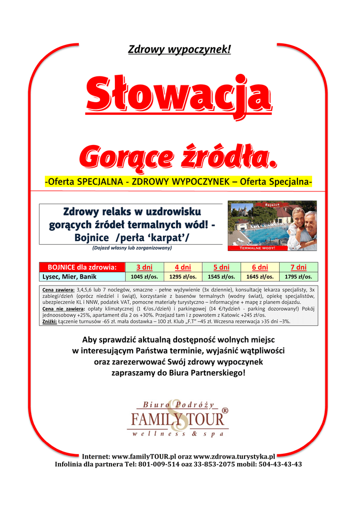 Zdrowy wypoczynek! Słowacja Gorące źródła. -Oferta SPECJALNA - ZDROWY WYPOCZYNEK – Oferta Specjalna- Zdrowy relaks w uzdrowisku gorących źródeł termalnych wód! Bojnice /perła ‘karpat’/ (Dojazd własny lub zorganizowany) BOJNICE dla zdrowia: Lysec, Mier, Banik 3 dni 4 dni 5 dni 6 dni 7 dni 1045 zł/os. 1295 zł/os. 1545 zł/os. 1645 zł/os. 1795 zł/os. Cena zawiera: 3,4,5,6 lub 7 noclegów, smaczne - pełne wyżywienie (3x dziennie), konsultację lekarza specjalisty, 3x zabiegi/dzień (oprócz niedziel i świąt), korzystanie z basenów termalnych (wodny świat), opiekę specjalistów, ubezpieczenie KL i NNW, podatek VAT, pomocne materiały turystyczno – informacyjne + mapę z planem dojazdu. Cena nie zawiera: opłaty klimatycznej (1 €/os./dzień) i parkingowej (14 €/tydzień - parking dozorowany!) Pokój jednoosobowy +25%, apartament dla 2 os +30%. Przejazd tam i z powrotem z Katowic +245 zł/os. Zniżki: Łączenie turnusów -65 zł. mała dostawka – 100 zł. Klub „F.T” –45 zł. Wczesna rezerwacja >35 dni –3%. Aby sprawdzić aktualną dostępność wolnych miejsc w interesującym Państwa terminie, wyjaśnić wątpliwości oraz zarezerwować Swój zdrowy wypoczynek zapraszamy do Biura Partnerskiego! Internet: www.familyTOUR.pl oraz www.zdrowa.turystyka.pl Infolinia dla partnera Tel: 801-009-514 oaz 33-853-2075 mobil: 504-43-43-43
