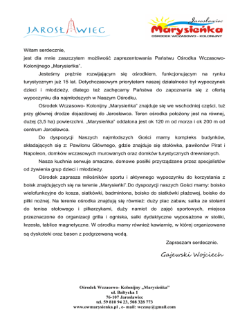 Witam serdecznie, jest dla mnie zaszczytem możliwość zaprezentowania Państwu Ośrodka WczasowoKolonijnego „Marysieńka”. Jesteśmy prężnie rozwijającym się ośrodkiem, funkcjonującym na rynku turystycznym już 15 lat. Dotychczasowym priorytetem naszej działalności był wypoczynek dzieci i młodzieży, dlatego też zachęcamy Państwa do zapoznania się z ofertą wypoczynku dla najmłodszych w Naszym Ośrodku. Ośrodek Wczasowo- Kolonijny „Marysieńka” znajduje się we wschodniej części, tuż przy głównej drodze dojazdowej do Jarosławca. Teren ośrodka położony jest na równej, dużej (3,5 ha) powierzchni. „Marysieńka” oddalona jest ok 120 m od morza i ok 200 m od centrum Jarosławca. Do dyspozycji Naszych najmłodszych Gości mamy kompleks budynków, składających się z: Pawilonu Głównego, gdzie znajduje się stołówka, pawilonów Pirat i Napoleon, domków wczasowych murowanych oraz domków turystycznych drewnianych. Nasza kuchnia serwuje smaczne, domowe posiłki przyrządzane przez specjalistów od żywienia grup dzieci i młodzieży. Ośrodek zaprasza miłośników sportu i aktywnego wypoczynku do korzystania z boisk znajdujących się na terenie „Marysieńki”.Do dyspozycji naszych Gości mamy: boisko wielofunkcyjne do kosza, siatkówki, badmintona, boisko do siatkówki plażowej, boisko do piłki nożnej. Na terenie ośrodka znajdują się również: duży plac zabaw, salka ze stołami do tenisa stołowego i piłkarzykami, duży namiot do zajęć sportowych, miejsca przeznaczone do organizacji grilla i ogniska, salki dydaktyczne wyposażone w stoliki, krzesła, tablice magnetyczne. W ośrodku mamy również kawiarnię, w której organizowane są dyskoteki oraz basen z podgrzewaną wodą. Zapraszam serdecznie. Gajewski Wojciech Ośrodek Wczasowo- Kolonijny „Marysieńka” ul. Bałtycka 1 76-107 Jarosławiec tel. 59 810 94 23, 508 328 773 www.owmarysienka.pl , e- mail: [email protected] OFERTA ZIELONEJ SZKOŁY W OŚRODKU WCZASOWO- KOLONIJNYM „MARYSIEŃKA” ZAKWATEROWANIE: BUDYNEK NAPOLEON PIRAT HOTELOWIEC DOMKI 4 OSOBOWE OPIS POKOJU 4-6 osobowe z łazienką, TV (możliwość dostawienia łóżek piętrowych) 4-6 osobowe z łazienką, TV (możliwość dostawienia łóżek piętrowych) Pokoje 2-3 osobowe z TV, wspólne łaźnie na korytarzu W domkach znajdują się 2 łóżka piętrowe, łazienka, TV CENA osoba/ dzień 50,00 zł 50,00 zł 47,00 zł 47,00 zł KILKA SŁÓW O OŚRODKU: Ośrodek Wczasowo- Kolonijny „Marysieńka” położony jest w małej, malowniczej nadmorskiej miejscowości Jarosławiec. Ośrodek „Marysieńka” znajduje się we wschodniej części tuż przy głównej drodze dojazdowej do miejscowości. Teren ośrodka położony jest na równej, dużej (3,5 ha) powierzchni, jest ogrodzony, a w nocy oświetlony i dozorowany. „Marysieńka” oddalona jest ok 120 m od morza i 200 m od centrum Jarosławca. W ośrodku znajduje się stołówka o powierzchni 250 m 2, (miesząca 200 osób) w której kelnerki podają 3 posiłki dziennie + podwieczorek. Menu ustalamy z fachowcami od żywienia grup dzieci. Gwarantujemy, że smak i jakość posiłków przez nas podawanych jest godny nagrody, jaką zdobyliśmy „I Miejsce dla najlepszej stołówki” dla OW „Marysieńka”. Ośrodek Wczasowo- Kolonijny „Marysieńka” ul. Bałtycka 1 76-107 Jarosławiec tel. 59 810 94 23, 508 328 773 www.owmarysienka.pl , e- mail: [email protected] Na terenie ośrodka do dyspozycji grupy znajduje się: kawiarnią z pełnym nagłośnieniem (bezprzewodowe mikrofony, bum-box, laptop), 3 salki dydaktyczne o powierzchni 70 m 2, dwie salki- domki o powierzchni 25 m2 (wszystkie salki wyposażone w klimatyzację, tablice magnetyczne,stoliki i krzesła) , boisko wielofunkcyjne do kosza, siatkówki, badmintona, boisko do piłki nożnej, boisko siatkówki plażowej, basen z podgrzewaną wodą, oczko wodne, place zabaw, miejsce na organizację ogniska i grilla, biesiadnik mieszczący 70 osób, padok do przejażdżek konnych, namiot do zajęć sportowych. GRATIS PROPONUJEMY: • Opiekuna na każde 15 osób. • Zajęcia animacyjne prowadzone przez animatorów i opiekunów, • Opiekę medyczną (lekarz doraźnie). • Rowery, sprzęt plażowy, kijki Nordic Walking, • Ognisko z muzyką i kiełbaskami, • Kompasy do surwiwalu lub spacerów • Dyskoteki (muz. Mechaniczna). • Korzystanie z salek dydaktycznych Ośrodek Wczasowo- Kolonijny „Marysieńka” ul. Bałtycka 1 76-107 Jarosławiec tel. 59 810 94 23, 508 328 773 www.owmarysienka.pl , e- mail: [email protected]