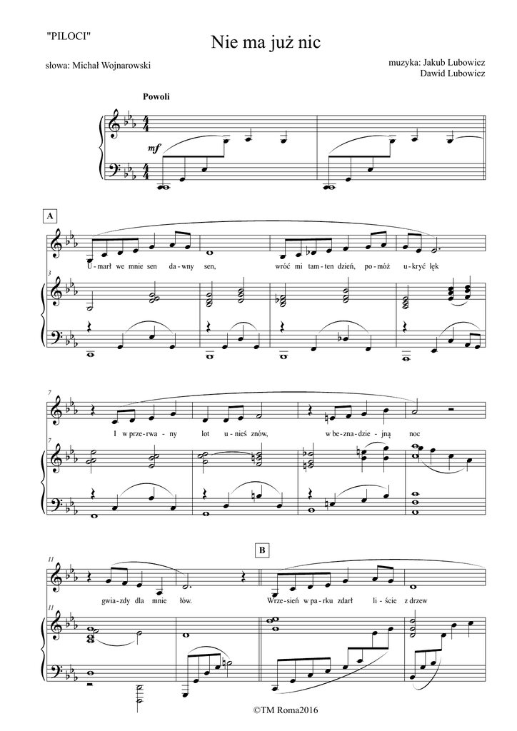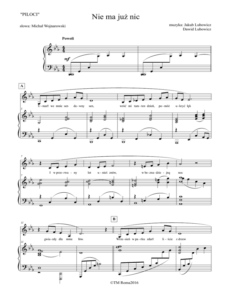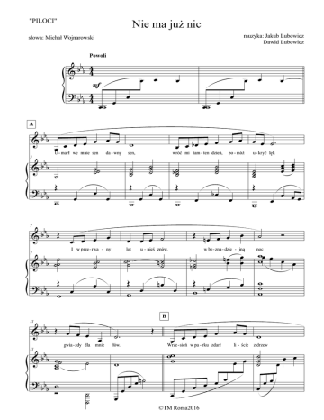 "PILOCI" Nie ma już nic muzyka: Jakub Lubowicz Dawid Lubowicz słowa: Michał Wojnarowski Powoli b 4 &bb 4 F ? b b 44 b œ œw œ œ œ œ œw œ œ œ œ œ A b &bb b &bb 3 ? bb b œ œ œ œ w œ œ œU - marł we mnie sen da - wny sen, ˙˙˙ ˙ Œ w b &bb Œ 7 b ˙ & b b ˙˙ 7 œ œ œ œ œ ˙˙ ˙ Œ œ w œ lot ˙˙˙ ˙˙˙ ? b Œ œ bb w œ b &bb Œ œ œ œ œ ˙˙ ˙ b & b b ww˙ w ? bb w b Ó gwia - zdy dla ˙ ˙ ˙ mnie b ˙˙˙ Œ œ œ œ w u - nieś znów, n ˙˙˙ Œ w œ œ ˙. łów. w œ nœ Œ 11 11 wróć mi tam - ten dzień, œ œ œ ˙ I w prze - rwa - ny œ n˙ œ œ œ œ œ œ bœ œ œ ˙˙ ˙ bœ œ œ Œ w nœ œ œ œ w be - zna - dzie - jną œ œœ œœœ œ œ œœ œ w œ n œœ u - kryć lęk ˙˙˙ Œ Œ nœ œ œ b ˙˙ n˙ œ po - móż œ œ ˙. Ó ˙ wœ œ w œ œ noc ww w B œ œ œ œ œ Wrze - sień w pa - rku zdarł www œ œ œ œ œ œ ©TM Roma2016 œ œ li - ście œ œ w z drzew ˙˙ ˙ œ œœ œ œ œ 2 b &bb 15 œ œ œ œ ˙. œ œ b œ œ œ za - lał ca - ły swiat b & b b b ww. Œ 15 ? b bb œ 19 & bbb Œ nœ œ œ œ C b &bb ˙ le bb b ˙˙˙ & 23 ko, bo œœ œ œœ œ ? b œ œ œ œ bb œ œ J b &bb ˙ 27 dy b & b b ˙˙˙ - 27 ? bb b œ œ œ œ œ my i ˙˙˙ ˙ œœ ... œ œ œ œ œ œ œœ œ œœ œ œ Za j œ œ œ œ ˙˙˙ œ ˙ œ œ 3 œ - bierz mnie ˙ cze - kam, cze - kam na cie - bie ˙˙ ˙ n ˙˙˙ ˙˙ ˙ ˙ mgły n ww w nw w ˙ Nie ma U ˙ ˙˙ œ œ œ œ Za - bierz mnie da - "œ œ œ œ n˙ U Ó œ Œ œ Ó œ œ Tu, gdzie ˙˙ ˙ ˙˙ ˙ ˙ œ œ œ œ œ Œ ˙ œ œ œ ˙ ˙ œ œ œ 3 stąd... ˙. nœ œ œ œ nœ œ œ J œ " ˙ U œœ œ œ œ œ œ ˙˙ œ J nœ œ ˙ œ œ˙ Œ nn œœ U œ œ bi - je dzwon... n œœœ ... œ œ œœ œ ˙ Ó serc œ œœ œœ œœ œœ œ œ œ Œ œ œ ˙ œ Nad gru - za - mi œ œœ œœ j œ œ œ. - œ mam: œ b œœœ œœœœ w w b ww ww ˙ Pro - śbę je - dną b nœ & b b b œœœ n œœœœ Œ po - to - ka - mi łez œ œ œ œ J œ b˙ œ œ 19 ? bb Nie ma już nic œ œ na - stę - pnych wẇ Ó w ©TM Roma2016 ˙ Ó dni ˙ ˙ 3 nœ œ œ nie nw w w ma już D b &bb ∑ w bb œ œ œ œ œ œ w b & œ w 31 Nie ma już nic œ b &bb ∑ 35 œ Œ œ w œ ∑ b b Œ œ˙ œ œ œ n œw œ œ ˙ b . & Œ œ ∑ œ Œ n œ˙ .œ 35 ? bb Œ œ œ œ b w œ bœ œ w ∑ œ w w Œ œ ∑ b w & b b ww 41 ? b bb b &bb Œ 45 b &bb Œ 45 ? bb œ œ œ œ œ œ œ œ œ œ Czy mi nie dasz œœ œœ œœ œœœ œ œ œ œ œ œ œ œ b œ ˙ œ œ ˙˙ œ œ wpaść ˙ ˙ œ œ œ œ Œ n˙ œ œ œ œ ˙. œ œ b œ œ œ ci - sza two - ich słów, do - tyk œœ two - ich rąk... œ œ b ww œ Œ. w œ œ œ œ www œ J b˙ œœ œœ œ œ œ œ œ œ œ Œ nœ œ œ œ œ œ ˙ w mę - tną toń? Nie chcę iść œ ˙˙ œ J nœ œ ˙ œ˙ œ Œ nn œœ n œœœ ... ∑ œ Œ ˙ œ œ œ n ˙˙˙ ... Œ nœ Œ œ Œ œ œ œ œ n œ œ w w w w œ Ó œ œ œ œ w œ œ œ Gdzie ten za - pach bzów, za - pach łąk œ œ œ œ w E b &bb ∑ œ œ œ œ ˙. w œ œ bœ œ œ nic ? bb Œ b w ∑ 3 b n œœœœ œœœ nœ w w ©TM Roma2016 œ b œœœ na œœœ œ ˙ Ó dno œœœ ... j œœ œœœ œ œœ œœ œ Nie ma już nic 4 b &bb ˙ U œ œ 49 Za - ˙ bierz mnie b & b b ˙˙˙˙ stąd... b &bb œ œ œ œ œ œ œ œ œœ œ œ œ f n˙ U Ó Œ œ œ Ó ˙. œ ƒ cie - bie Tu, b ˙ & b b ˙˙ ˙˙ ˙ 53 ? bb œ œ œ œ b œ b &bb œ 57 stę - œ pnych b & b b ˙˙˙ œ œ Œ ˙ ˙ œ ˙ ˙ ˙ Ó dni ˙˙ ˙˙ 57 ? bb Œ b w ˙˙ ˙ ˙˙ œ gdzie œ j œ œ œ. - ˙˙ ˙ " ˙ ˙˙ œœ œ ? b œ bb œ œ 53 ˙ Za - bierz mnie da - le U ˙ 49 " F ko, bo 3 œ nœ œ œ cze - kam, cze - kam na œœ œœ œ œ ˙˙ ˙ n ˙˙˙ œ œ my i ˙ œ œ œ nœ ˙ œ œœ œ œ œ J J œ œ œœ ˙ dy - ˙˙ ˙ œ œ ˙˙ ˙ ˙ œ nœ œ Nie ma n www nw ww w 3 mgły Ó n ww w nw ww œ w już nic! ww ww ww w ©TM Roma2016 3 Nie ma na - œœ œœ œœ œ œ œ 3