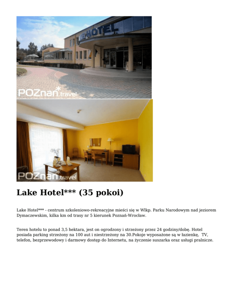 Lake Hotel*** (35 pokoi) Lake Hotel*** - centrum szkoleniowo-rekreacyjne mieści się w Wlkp. Parku Narodowym nad jeziorem Dymaczewskim, kilka km od trasy nr 5 kierunek Poznań-Wrocław. Teren hotelu to ponad 3,5 hektara, jest on ogrodzony i strzeżony przez 24 godziny/dobę. Hotel posiada parking strzeżony na 100 aut i niestrzeżony na 30.Pokoje wyposażone są w łazienkę, TV, telefon, bezprzewodowy i darmowy dostęp do Internetu, na życzenie suszarka oraz usługi pralnicze.