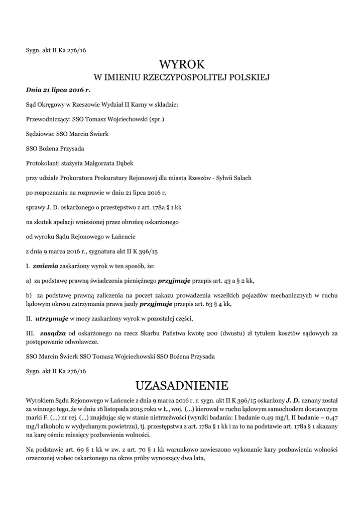 Sygn. akt II Ka 276/16 WYROK W IMIENIU RZECZYPOSPOLITEJ POLSKIEJ Dnia 21 lipca 2016 r. Sąd Okręgowy w Rzeszowie Wydział II Karny w składzie: Przewodniczący: SSO Tomasz Wojciechowski (spr.) Sędziowie: SSO Marcin Świerk SSO Bożena Przysada Protokolant: stażysta Małgorzata Dąbek przy udziale Prokuratora Prokuratury Rejonowej dla miasta Rzeszów - Sylwii Salach po rozpoznaniu na rozprawie w dniu 21 lipca 2016 r. sprawy J. D. oskarżonego o przestępstwo z art. 178a § 1 kk na skutek apelacji wniesionej przez obrońcę oskarżonego od wyroku Sądu Rejonowego w Łańcucie z dnia 9 marca 2016 r., sygnatura akt II K 396/15 I. zmienia zaskarżony wyrok w ten sposób, że: a) za podstawę prawną świadczenia pieniężnego przyjmuje przepis art. 43 a § 2 kk, b) za podstawę prawną zaliczenia na poczet zakazu prowadzenia wszelkich pojazdów mechanicznych w ruchu lądowym okresu zatrzymania prawa jazdy przyjmuje przepis art. 63 § 4 kk, II. utrzymuje w mocy zaskarżony wyrok w pozostałej części, III. zasądza od oskarżonego na rzecz Skarbu Państwa kwotę 200 (dwustu) zł tytułem kosztów sądowych za postępowanie odwoławcze. SSO Marcin Świerk SSO Tomasz Wojciechowski SSO Bożena Przysada Sygn. akt II Ka 276/16 UZASADNIENIE Wyrokiem Sądu Rejonowego w Łańcucie z dnia 9 marca 2016 r. r. sygn. akt II K 396/15 oskarżony J. D. uznany został za winnego tego, że w dniu 16 listopada 2015 roku w Ł., woj. (...) kierował w ruchu lądowym samochodem dostawczym marki F. (...) nr rej. (...) znajdując się w stanie nietrzeźwości (wyniki badania: I badanie 0,49 mg/l, II badanie – 0,47 mg/l alkoholu w wydychanym powietrzu), tj. przestępstwa z art. 178a § 1 kk i za to na podstawie art. 178a § 1 skazany na karę ośmiu miesięcy pozbawienia wolności. Na podstawie art. 69 § 1 kk w zw. z art. 70 § 1 kk warunkowo zawieszono wykonanie kary pozbawienia wolności orzeczonej wobec oskarżonego na okres próby wynoszący dwa lata, Na podstawie art. 42 § 2 kk orzeczono wobec oskarżonego środek karny w postaci zakazu prowadzenia wszelkich pojazdów mechanicznych w ruchu lądowym na okres czterech lat, Na podstawie art. 63 § 2 kk zaliczono oskarżonemu na poczet orzeczonego zakazu prowadzenia pojazdów mechanicznych okres zatrzymania prawa jazdy od dnia 16 listopada 2015 roku do daty prawomocności niniejszego wyroku, Na podstawie art. 49 § 2 orzeczono wobec oskarżonego świadczenie pieniężne w kwocie 5.300 zł płatne na rzecz Funduszu Pomocy Pokrzywdzonym oraz Pomocy Postpenitencjarnej, Na podstawie art. 627 kpk i art. 2 ust. 2 pkt 3 ustawy z dnia 23 czerwca 1973 r. – o opłatach w sprawach karnych zasądzono od oskarżonego na rzecz Skarbu Państwa kwotę 110,00 zł tytułem zwrotu wydatków i opłatę w wysokości 180,00 zł. Apelację od powyższego wyroku złożył obrońca oskarżonego, zaskarżając go w części dotyczącej orzeczenia o karze i środkach karnych oraz kosztach sądowych, zarzucając: 1. mającą wpływ na treść orzeczenia obrazę przepisów postępowania, a to art. 335 § 1 kpk w zw. z art. 343 § 7 kpk poprzez uwzględnienie wniosku Prokuratora o skazanie oskarżonego bez przeprowadzenia postępowania dowodowego w sytuacji, w której nie można uznać, iż kara i środki karne ujęte w tym wniosku zostały pomiędzy oskarżonym i Prokuratorem uzgodnione, co w konsekwencji doprowadziło do uchybień opisanych niżej, 2. naruszenie przepisu prawa materialnego, a to art. 49 § 2 kk poprzez jego niezasadne zastosowanie i orzeczenie wobec oskarżonego określonego w nim środka karnego, mimo że przepis ten od 1 lipca 2015 roku nie obowiązuje, 3. rażącą niewspółmierność wymierzonych oskarżonemu: kary pozbawienia wolności, środków karnych w postaci zakazu prowadzenia wszelkich pojazdów mechanicznych oraz w postaci świadczenia pieniężnego na rzecz Funduszu Pomocy Pokrzywdzonym oraz Pomocy Postpenitencjarnej w sytuacji, w której kara i wymienione środki jako całość reakcji prawnokarnej w sposób oczywisty nie odpowiada stopniowi winy i społecznej szkodliwości czynu popełnionego przez oskarżonego, 4. mająca wpływ na treść orzeczenia obrazę przepisów postępowania, a to art. 627 kpk i art. 2 ust. 2 pkt 3 ustawy o opłatach w sprawach karnych poprzez ich zastosowanie oraz art. 624 § 1 kpk i art. 17 ust. 1 ustawy o opłatach w sprawach karnych poprzez ich niezastosowanie i zasądzenie od oskarżonego na rzecz Skarbu Państwa kosztów sądowych, mimo iż ich uiszczenie jest dla niego zbyt uciążliwe ze względu na sytuację majątkową i wysokość dochodów. Powołując się na podniesione uchybienia obrońca oskarżonego wniósł o zmianę zaskarżonego wyroku poprzez: 1. wymierzenie oskarżonemu kary oraz środka karnego w postaci zakazu prowadzenia pojazdów mechanicznych w łagodniejszym wymiarze, 2. wyeliminowanie z wyroku orzeczenia o środku karnym w postaci świadczenia na rzecz Funduszu Pomocy Pokrzywdzonym oraz Pomocy Postpenitencjarnej, ewentualnie – z ostrożności procesowej – o wymierzenie przedmiotowego środka karnego o łagodniejszym niż w zaskarżonym wyroku wymiarze, 3. zwolnienie oskarżonego od zapłaty na rzecz Skarbu Państwa kosztów sądowych. Sąd Okręgowy rozważył, co następuje: Podniesiony w apelacji zarzut obrazy prawa materialnego okazał się zasadny. Ponadto skuteczność środka odwoławczego polegała na tym, że w następstwie jego rozpoznania konieczna stała się korekta przepisu przyjętego za podstawę zaliczenia na poczet orzeczonego środka karnego okresu zatrzymania prawa jazdy. W pozostałym zakresie apelacja nie zyskała akceptacyjnej oceny sądu odwoławczego. W związku z podniesieniem zarzutu obrazy art. 335 § 1 kpk w zw. z art. 343 § 7 kpk przypomnieć trzeba, że zamieszczona we wniosku prokuratora propozycja kary lub środka karnego musi być uzgodniona z oskarżonym (podejrzanym), a zatem jego wola w tej mierze powinna zostać wyrażona w sposób wyraźny i niebudzący w