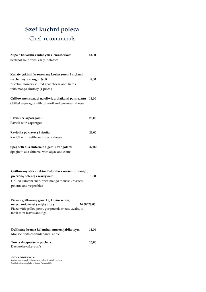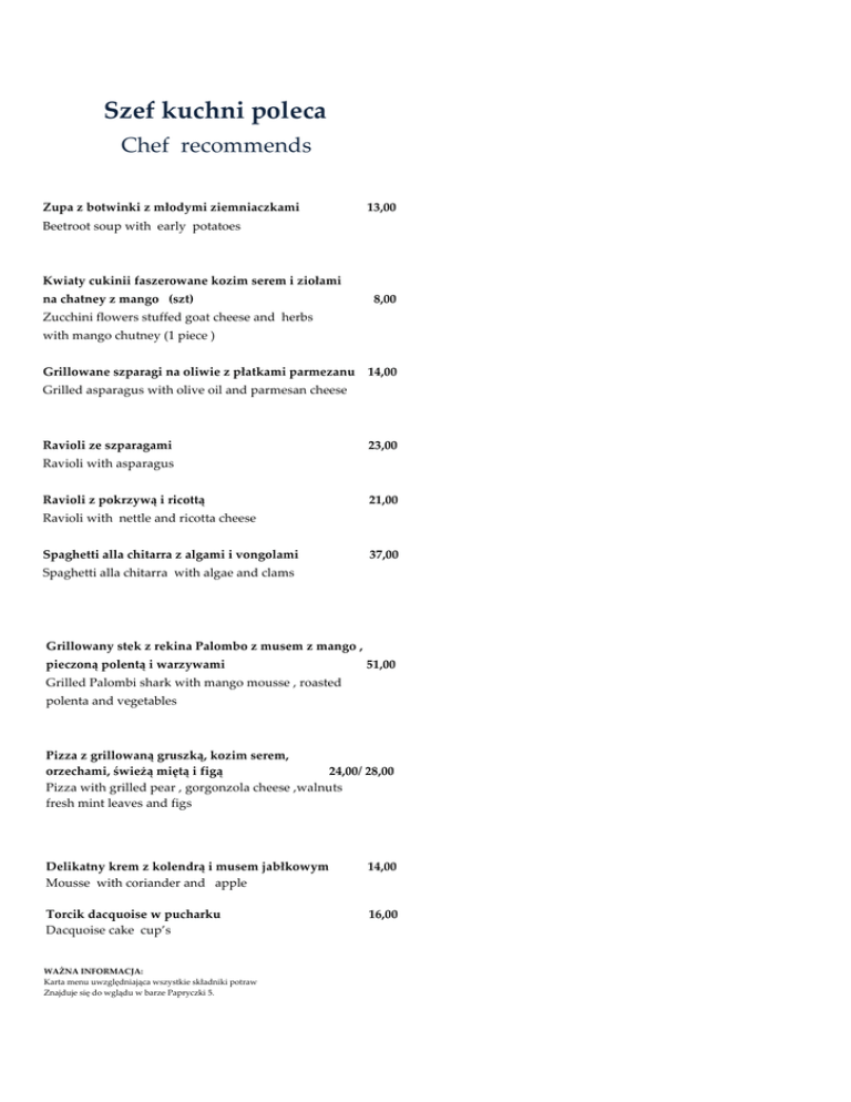 Szef kuchni poleca Chef recommends Zupa z botwinki z młodymi ziemniaczkami 13,00 Beetroot soup with early potatoes Kwiaty cukinii faszerowane kozim serem i ziołami na chatney z mango (szt) 8,00 Zucchini flowers stuffed goat cheese and herbs with mango chutney (1 piece ) Grillowane szparagi na oliwie z płatkami parmezanu 14,00 Grilled asparagus with olive oil and parmesan cheese Ravioli ze szparagami 23,00 Ravioli with asparagus Ravioli z pokrzywą i ricottą 21,00 Ravioli with nettle and ricotta cheese Spaghetti alla chitarra z algami i vongolami 37,00 Spaghetti alla chitarra with algae and clams Grillowany stek z rekina Palombo z musem z mango , pieczoną polentą i warzywami 51,00 Grilled Palombi shark with mango mousse , roasted polenta and vegetables Pizza z grillowaną gruszką, kozim serem, orzechami, świeżą miętą i figą 24,00/ 28,00 Pizza with grilled pear , gorgonzola cheese ,walnuts fresh mint leaves and figs Delikatny krem z kolendrą i musem jabłkowym 14,00 Mousse with coriander and apple Torcik dacquoise w pucharku 16,00 Dacquoise cake cup’s WAŻNA INFORMACJA: Karta menu uwzględniająca wszystkie składniki potraw Znajduje się do wglądu w barze Papryczki 5.
