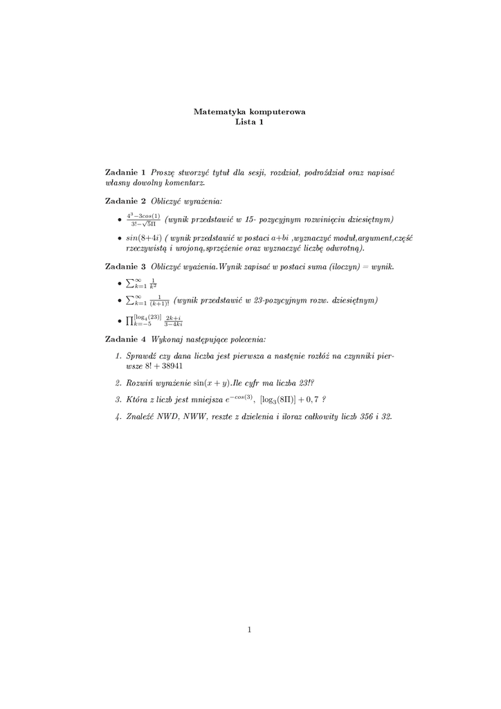 Matematyka komputerowa Lista 1 Zadanie 1 Prosz¦ stworzy¢ tytuª dla sesji, rozdziaª, podro¹dziaª oraz napisa¢ wªasny dowolny komentarz. Zadanie 2 Obliczy¢ wyra»enia: • 43 −3cos(1) √ 3!− 5Π (wynik przedstawi¢ w 15- pozycyjnym rozwini¦ciu dziesi¦tnym) • sin(8+4i) ( wynik przedstawi¢ w postaci a+bi ,wyznaczy¢ moduª,argument,cz¦±¢ rzeczywist¡ i urojon¡,sprz¦»enie oraz wyznaczy¢ liczb¦ odwrotn¡). Zadanie 3 Obliczy¢ wya»enia.Wynik zapisa¢ w postaci suma (iloczyn) = wynik. • • • P∞ 1 k=1 k2 P∞ 1 k=1 (k+1)! Q[log4 (23)] k=−5 (wynik przedstawi¢ w 23-pozycyjnym rozw. dziesi¦tnym) 2k+i 3−4ki Zadanie 4 Wykonaj nast¦puj¡ce polecenia: 1. Sprawd¹ czy dana liczba jest pierwsza a nast¦nie rozªó» na czynniki pierwsze 8! + 38941 2. Rozwi« wyra»enie sin(x + y).Ile cyfr ma liczba 23!? 3. Która z liczb jest mniejsza e−cos(3) , [log3 (8Π)] + 0, 7 ? 4. Znale¹¢ NWD, NWW, reszte z dzielenia i iloraz caªkowity liczb 356 i 32. 1