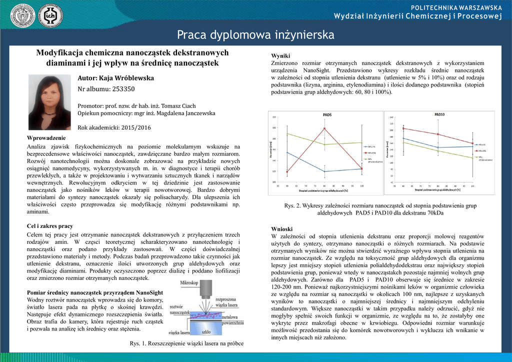 Praca dyplomowa inżynierska Modyfikacja chemiczna nanocząstek dekstranowych diaminami i jej wpływ na średnicę nanocząstek Autor: Kaja Wróblewska Nr albumu: 253350 Wyniki Zmierzono rozmiar otrzymanych nanocząstek dekstranowych z wykorzystaniem urządzenia NanoSight. Przedstawiono wykresy rozkładu średnic nanocząstek w zależności od stopnia utlenienia dekstranu (utlenienie w 5% i 10%) oraz od rodzaju podstawnika (lizyna, arginina, etylenodiamina) i ilości dodanego podstawnika (stopień podstawienia grup aldehydowych: 60, 80 i 100%). Promotor: prof. nzw. dr hab. inż. Tomasz Ciach Opiekun pomocniczy: mgr inż. Magdalena Janczewska Rok akademicki: 2015/2016 Wprowadzenie Analiza zjawisk fizykochemicznych na poziomie molekularnym wskazuje na bezprecedensowe właściwości nanocząstek, zawdzięczane bardzo małym rozmiarom. Rozwój nanotechnologii można doskonale zobrazować na przykładzie nowych osiągnięć nanomedycyny, wykorzystywanych m. in. w diagnostyce i terapii chorób przewlekłych, a także w projektowaniu i wytwarzaniu sztucznych tkanek i narządów wewnętrznych. Rewolucyjnym odkryciem w tej dziedzinie jest zastosowanie nanocząstek jako nośników leków w terapii nowotworowej. Bardzo dobrymi materiałami do syntezy nanocząstek okazały się polisacharydy. Dla ulepszenia ich właściwości często przeprowadza się modyfikację różnymi podstawnikami np. aminami. Cel i zakres pracy Celem tej pracy jest otrzymanie nanocząstek dekstranowych z przyłączeniem trzech rodzajów amin. W częsci teoretycznej scharakteryzowano nanotechnologię i nanocząstki oraz podano przykłady zastosowań. W części doświadczalnej przedstawiono materiały i metody. Podczas badań przeprowadzono takie czynności jak utlenienie dekstranu, oznaczenie ilości utworzonych grup aldehydowych oraz modyfikację diaminami. Produkty oczyszczono poprzez dializę i poddano liofilizacji oraz zmierzono rozmiar otrzymanych nanocząstek. Pomiar średnicy nanocząstek przyrządem NanoSight Wodny roztwór nanocząstek wprowadza się do komory, światło lasera pada na płytkę o skośnej krawędzi. Następuje efekt dynamicznego rozszczepienia światła. Obraz trafia do kamery, która rejestruje ruch cząstek i pozwala na analizę ich średnicy oraz stężenia. Rys. 1. Rozszczepienie wiązki lasera na próbce Rys. 2. Wykresy zależności rozmiaru nanocząstek od stopnia podstawienia grup aldehydowych PAD5 i PAD10 dla dekstranu 70kDa Wnioski W zależności od stopnia utlenienia dekstranu oraz proporcji molowej reagentów użytych do syntezy, otrzymano nanocząstki o różnych rozmiarach. Na podstawie otrzymanych wyników nie można stwierdzić wyraźnego wpływu stopnia utlenienia na rozmiar nanocząstek. Ze względu na toksyczność grup aldehydowych dla organizmu lepszy jest mniejszy stopień utlenienia polialdehydodekstrau oraz największy stopień podstawienia grup, ponieważ wtedy w nanocząstakch pozostaje najmniej wolnych grup aldehydowych. Zarówno dla PAD5 i PAD10 obserwuje się średnice w zakresie 120-200 nm. Ponieważ najkorzystniejszymi nośnikami leków w organizmie człowieka ze względu na rozmiar są nanocząstki w okolicach 100 nm, najlepsze z uzyskanych wyników to nanocząstki o najmniejszej średnicy i najmniejszym odchyleniu standardowym. Większe nanocząstki w takim przypadku należy odrzucić, gdyż nie mogłyby spełnić swoich funkcji w organizmie, ze względu na to, że zostałyby one wykryte przez makrofagi obecne w krwiobiegu. Odpowiedni rozmiar warunkuje możliwość przedostania się do komórek nowotworowych i wyklucza ich wnikanie w innych miejscach niż założono.