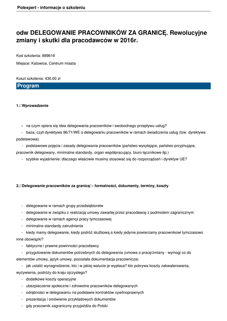 Polexpert - informacje o szkoleniu odw DELEGOWANIE PRACOWNIKÓW ZA GRANICĘ. Rewolucyjne zmiany i skutki dla pracodawców w 2016r. Kod szkolenia: 889616 Miejsce: Katowice, Centrum miasta Koszt szkolenia: 430.00 zł Program 1. Wprowadzenie - na czym opiera się idea delegowania pracowników i swobodnego przepływu usług? - baza, czyli dyrektywa 96/71/WE o delegowaniu pracowników w ramach świadczenia usług (tzw. dyrektywa podstawowa) - podstawowe pojęcia i zasady delegowania pracowników (państwo wysyłające, państwo przyjmujące, pracownik delegowany, minimalne standardy, organ współpracujący, biuro łącznikowe itp.) - szybkie wyjaśnienie: dlaczego właściwie musimy stosować się do rozporządzeń i dyrektyw UE? 2. Delegowanie pracowników za granicę - formalności, dokumenty, terminy, koszty - delegowanie w ramach grupy przedsiębiorstw - delegowanie w związku z realizacją umowy zawartej przez pracodawcę z podmiotem zagranicznym - delegowanie w ramach agencji pracy tymczasowej - minimalne standardy zatrudnienia - kiedy mamy delegowanie, kiedy podróż służbową a kiedy jedynie powierzamy pracownikowi tymczasowo inne obowiązki? - faktyczne i prawne powinności pracodawcy - przygotowanie dokumentów potrzebnych do delegowania (umowa o pracę/zmiany - wymogi co do elementów umowy, język umowy, pozostała dokumentacja pracownicza) - jak ustalić wynagrodzenie, kto i w jakiej walucie je wypłaca? kto pokrywa koszty zakwaterowania, wyżywienia, podróży do kraju ojczystego? - dodatkowe koszty operacyjne - ubezpieczenie społeczne i zdrowotne pracowników delegowanych - odrębności w delegowaniu na podstawie kontraktów cywilnoprawnych - prezentacja i omówienie przykładowych dokumentów - gdy pracownik zagraniczny przyjeżdża do Polski Polexpert - informacje o szkoleniu 3. Najczęściej występujące problemy i błędy pracodawców - jak ich uniknąć? - tzw. "firmy - mail box" - oddelegowanie "na stałe" - dumping socjalny - łamanie praw pracowniczych/ brak ochrony pracowników Dyskusja: Jak prawidłowo delegować pracownika z granicę oraz do Polski? 4. Planowane zmiany zasad delegowania - nowe obowiązki pracodawców - dyrektywa 2014/67/UE (tzw. dyrektywa wdrożeniowa) - jakie zmiany przewiduje? - ustawa o delegowaniu pracowników - jakie zmiany wprowadza? - omówienie: - nowe obowiązku pracodawców delegujących - wymogi administracyjne i środki kontrolne (wymóg wskazania osoby do kontaktów z organami państwa przyjmującego, obowiązek złożenia oświadczenia przez pracodawcę, wymóg przechowywania i udostępniania dokumentacji pracowniczej w okresie delegowania/po jego zakończeniu) - nakładanie i egzekwowanie grzywien administracyjnych lub administracyjnych kar pieniężnych, rola PIP i urzędu skarbowego - na czym polega odpowiedzialność solidarna podmiotu powierzającego wykonanie prac? - omówienie praktycznych i przypuszczalnych skutków zmian (wzrost kosztów i obowiązków administracyjnych pracodawców delegujących pracowników za granicę) 5. Plany rewizji dyrektywy 96/71/WE i wynikające stąd niebezpieczeństwa dla polskich przedsiębiorców - konsekwencje przekroczenia 24 miesięcznego okresu delegowania - rozszerzenie zakresu stosowania umów zbiorowych lub orzeczeń arbitrażowych państwa przyjmującego do pracowników oddelegowanych zatrudnionych we wszystkich sektorach - wprowadzenie "wynagrodzenia" w miejsce "minimalnego wynagrodzenia za pracę" czyli zasady, zasady, że za tę samą pracę w tym samym miejscu powinno przysługiwać to samo wynagrodzenie. - nowe ograniczenia i wymogi w zakresie warunków zatrudnienia u podwykonawców biorących udział w delegowaniach - obowiązek zapewnienia delegowanym pracownikom tymczasowym równych warunków zatrudnienia w Polexpert - informacje o szkoleniu porównaniu do tymczasowych pracowników lokalnych 6. Podsumowanie: pytania i dyskusja Prowadzący