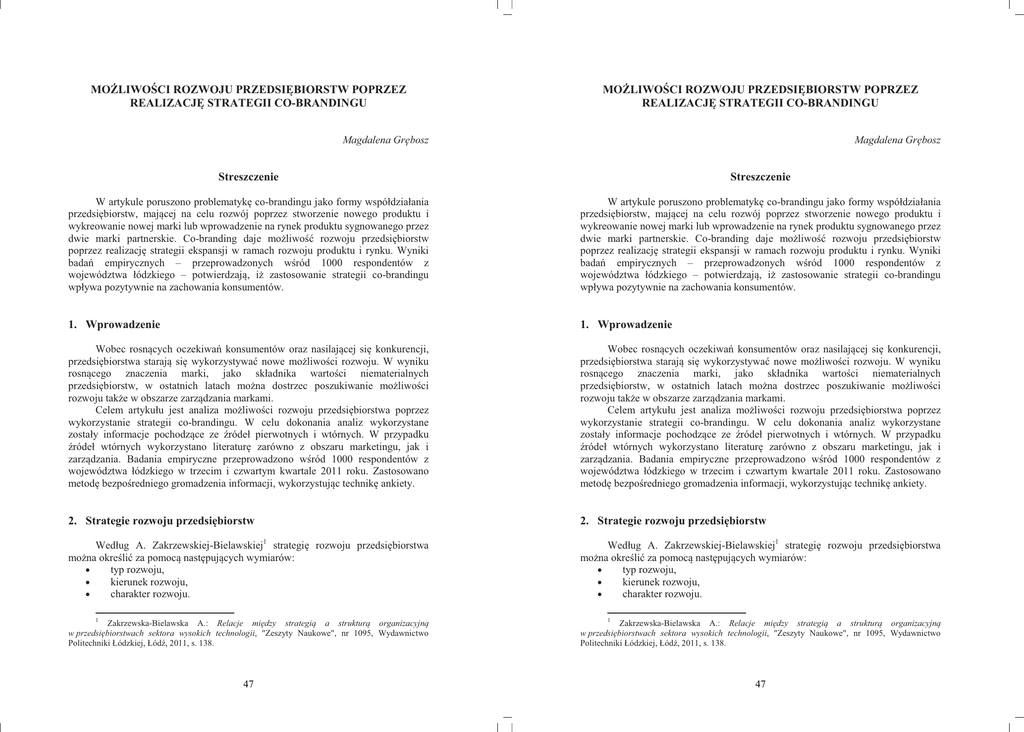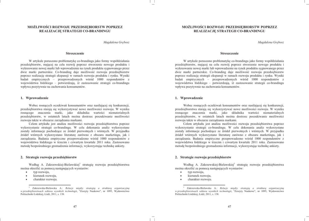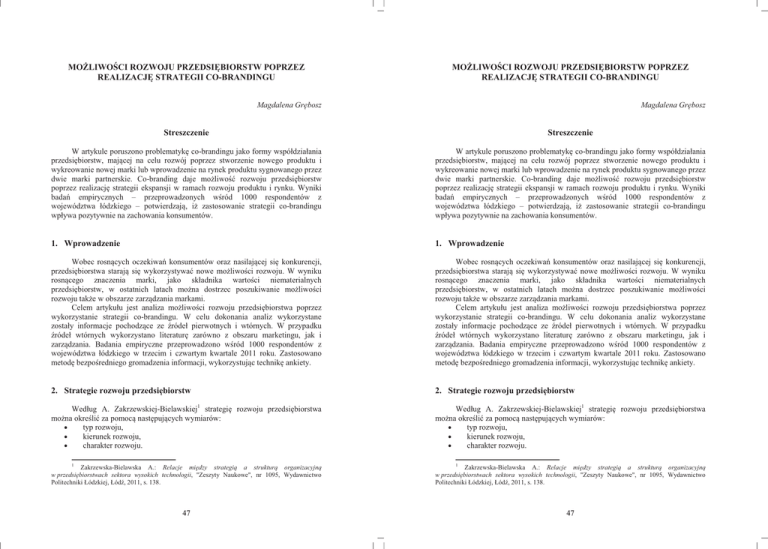 MOĩLIWOĝCI ROZWOJU PRZEDSIĉBIORSTW POPRZEZ REALIZACJĉ STRATEGII CO-BRANDINGU MOĩLIWOĝCI ROZWOJU PRZEDSIĉBIORSTW POPRZEZ REALIZACJĉ STRATEGII CO-BRANDINGU Magdalena GrĊbosz Magdalena GrĊbosz Streszczenie Streszczenie W artykule poruszono problematykĊ co-brandingu jako formy współdziałania przedsiĊbiorstw, mającej na celu rozwój poprzez stworzenie nowego produktu i wykreowanie nowej marki lub wprowadzenie na rynek produktu sygnowanego przez dwie marki partnerskie. Co-branding daje moĪliwoĞü rozwoju przedsiĊbiorstw poprzez realizacjĊ strategii ekspansji w ramach rozwoju produktu i rynku. Wyniki badaĔ empirycznych – przeprowadzonych wĞród 1000 respondentów z województwa łódzkiego – potwierdzają, iĪ zastosowanie strategii co-brandingu wpływa pozytywnie na zachowania konsumentów. W artykule poruszono problematykĊ co-brandingu jako formy współdziałania przedsiĊbiorstw, mającej na celu rozwój poprzez stworzenie nowego produktu i wykreowanie nowej marki lub wprowadzenie na rynek produktu sygnowanego przez dwie marki partnerskie. Co-branding daje moĪliwoĞü rozwoju przedsiĊbiorstw poprzez realizacjĊ strategii ekspansji w ramach rozwoju produktu i rynku. Wyniki badaĔ empirycznych – przeprowadzonych wĞród 1000 respondentów z województwa łódzkiego – potwierdzają, iĪ zastosowanie strategii co-brandingu wpływa pozytywnie na zachowania konsumentów. 1. Wprowadzenie 1. Wprowadzenie Wobec rosnących oczekiwaĔ konsumentów oraz nasilającej siĊ konkurencji, przedsiĊbiorstwa starają siĊ wykorzystywaü nowe moĪliwoĞci rozwoju. W wyniku rosnącego znaczenia marki, jako składnika wartoĞci niematerialnych przedsiĊbiorstw, w ostatnich latach moĪna dostrzec poszukiwanie moĪliwoĞci rozwoju takĪe w obszarze zarządzania markami. Celem artykułu jest analiza moĪliwoĞci rozwoju przedsiĊbiorstwa poprzez wykorzystanie strategii co-brandingu. W celu dokonania analiz wykorzystane zostały informacje pochodzące ze Ĩródeł pierwotnych i wtórnych. W przypadku Ĩródeł wtórnych wykorzystano literaturĊ zarówno z obszaru marketingu, jak i zarządzania. Badania empiryczne przeprowadzono wĞród 1000 respondentów z województwa łódzkiego w trzecim i czwartym kwartale 2011 roku. Zastosowano metodĊ bezpoĞredniego gromadzenia informacji, wykorzystując technikĊ ankiety. Wobec rosnących oczekiwaĔ konsumentów oraz nasilającej siĊ konkurencji, przedsiĊbiorstwa starają siĊ wykorzystywaü nowe moĪliwoĞci rozwoju. W wyniku rosnącego znaczenia marki, jako składnika wartoĞci niematerialnych przedsiĊbiorstw, w ostatnich latach moĪna dostrzec poszukiwanie moĪliwoĞci rozwoju takĪe w obszarze zarządzania markami. Celem artykułu jest analiza moĪliwoĞci rozwoju przedsiĊbiorstwa poprzez wykorzystanie strategii co-brandingu. W celu dokonania analiz wykorzystane zostały informacje pochodzące ze Ĩródeł pierwotnych i wtórnych. W przypadku Ĩródeł wtórnych wykorzystano literaturĊ zarówno z obszaru marketingu, jak i zarządzania. Badania empiryczne przeprowadzono wĞród 1000 respondentów z województwa łódzkiego w trzecim i czwartym kwartale 2011 roku. Zastosowano metodĊ bezpoĞredniego gromadzenia informacji, wykorzystując technikĊ ankiety. 2. Strategie rozwoju przedsiĊbiorstw 2. Strategie rozwoju przedsiĊbiorstw Według A. Zakrzewskiej-Bielawskiej1 strategiĊ rozwoju przedsiĊbiorstwa moĪna okreĞliü za pomocą nastĊpujących wymiarów: • typ rozwoju, • kierunek rozwoju, • charakter rozwoju. Według A. Zakrzewskiej-Bielawskiej1 strategiĊ rozwoju przedsiĊbiorstwa moĪna okreĞliü za pomocą nastĊpujących wymiarów: • typ rozwoju, • kierunek rozwoju, • charakter rozwoju. 1 Zakrzewska-Bielawska A.: Relacje miĊdzy strategią a strukturą organizacyjną w przedsiĊbiorstwach sektora wysokich technologii, "Zeszyty Naukowe", nr 1095, Wydawnictwo Politechniki Łódzkiej, ŁódĨ, 2011, s. 138. 47 1 Zakrzewska-Bielawska A.: Relacje miĊdzy strategią a strukturą organizacyjną w przedsiĊbiorstwach sektora wysokich technologii, "Zeszyty Naukowe", nr 1095, Wydawnictwo Politechniki Łódzkiej, ŁódĨ, 2011, s. 138. 47 Typ rozwoju moĪna okreĞliü jako wielkoĞü wzrostu rozmiarów działalnoĞci, prowadzącą do rozróĪnienia strategii ekspansji, stabilizacji lub strategii defensywnej. Kierunek wzrostu wiąĪe siĊ z wyborami strategicznymi w zakresie rozwoju produktu, rozwoju rynku oraz integracji pionowej2. Trzecią zmienną jest charakter rozwoju, który moĪe przyjąü formĊ rozwoju wewnĊtrznego, zewnĊtrznego lub mieszanego3. WĞród form współdziałania zewnĊtrznego wyróĪniü moĪna formy koncentracyjne i kooperacyjne4. Do tych ostatnich naleĪy strategia co-brandingu. PrzedsiĊbiorstwa decydują siĊ na realizacjĊ strategii co-brandingu chcąc uzyskaü dostĊp do unikalnych zasobów partnera, do których naleĪą przede wszystkim sama marka, jak i know-how w zakresie zarządzania marką i produktem. Zasadniczy wpływ na decyzjĊ o sposobie rozwoju mają5: • czynniki sektorowe (faza Īycia sektora, wysokoĞü i charakter barier wejĞcia do sektora, potencjał globalizacyjny sektora, dostĊpnoĞü zasobów), • czynniki korporacyjne (rodzaj strategii rozwoju, rodzaj strategii konkurencji, potencjał ekonomiczny przedsiĊbiorstwa, tolerancja ryzyka inwestycyjnego, forma organizacyjno-własnoĞciowa firmy, kultura organizacyjna firmy, wiedza kadry menadĪerskiej). Typ rozwoju moĪna okreĞliü jako wielkoĞü wzrostu rozmiarów działalnoĞci, prowadzącą do rozróĪnienia strategii ekspansji, stabilizacji lub strategii defensywnej. Kierunek wzrostu wiąĪe siĊ z wyborami strategicznymi w zakresie rozwoju produktu, rozwoju rynku oraz integracji pionowej2. Trzecią zmienną jest charakter rozwoju, który moĪe przyjąü formĊ rozwoju wewnĊtrznego, zewnĊtrznego lub mieszanego3. WĞród form współdziałania zewnĊtrznego wyróĪniü moĪna formy koncentracyjne i kooperacyjne4. Do tych 