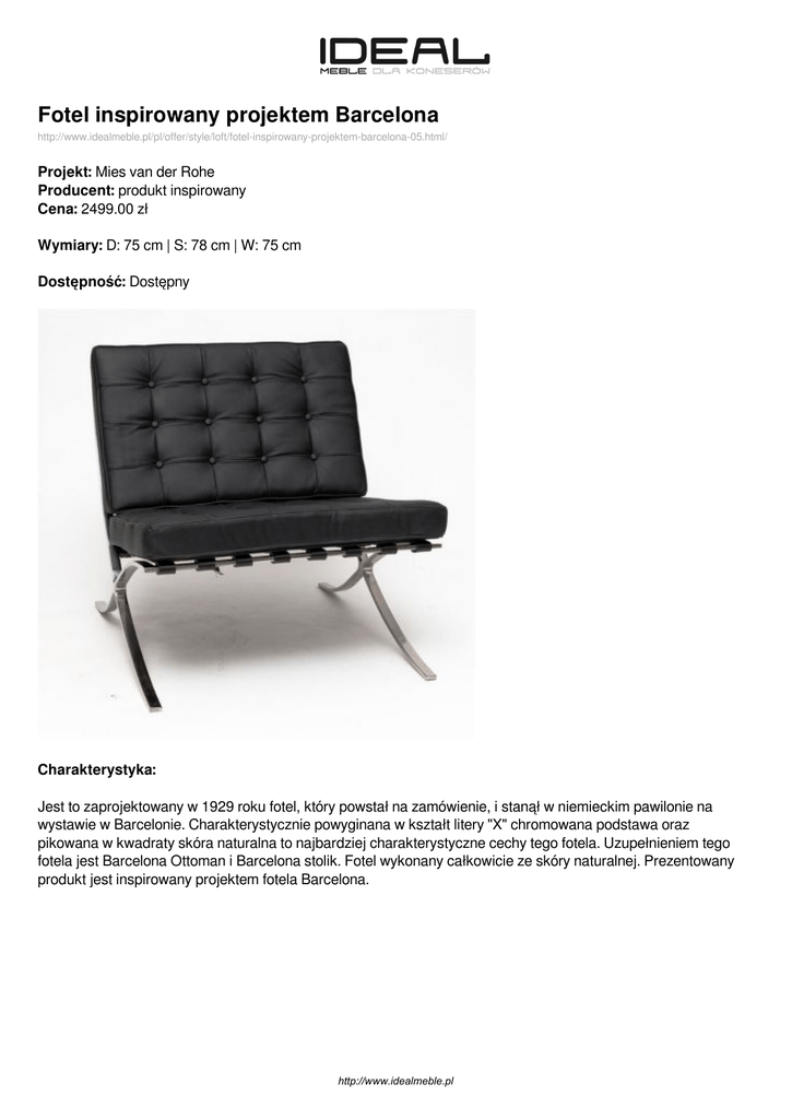 Fotel inspirowany projektem Barcelona http://www.idealmeble.pl/pl/offer/style/loft/fotel-inspirowany-projektem-barcelona-05.html/ Projekt: Mies van der Rohe Producent: produkt inspirowany Cena: 2499.00 zł Wymiary: D: 75 cm | S: 78 cm | W: 75 cm Dostępność: Dostępny Charakterystyka: Jest to zaprojektowany w 1929 roku fotel, który powstał na zamówienie, i stanął w niemieckim pawilonie na wystawie w Barcelonie. Charakterystycznie powyginana w kształt litery "X" chromowana podstawa oraz pikowana w kwadraty skóra naturalna to najbardziej charakterystyczne cechy tego fotela. Uzupełnieniem tego fotela jest Barcelona Ottoman i Barcelona stolik. Fotel wykonany całkowicie ze skóry naturalnej. Prezentowany produkt jest inspirowany projektem fotela Barcelona. http://www.idealmeble.pl Dostępne wersje produktu: nazwa produktu warianty Fotel inspirowany czarny projektem Barcelona cena 2499.00zł dostępne Dostępny Fotel inspirowany biały projektem Barcelona Fotel inspirowany brązowy projektem Barcelona 2499.00zł Zapytaj 2499.00zł Zapytaj Fotel inspirowany czerwony projektem Barcelona 2499.00zł Zapytaj http://www.idealmeble.pl Zdjęcia produktu: http://www.idealmeble.pl Powered by TCPDF (www.tcpdf.org)