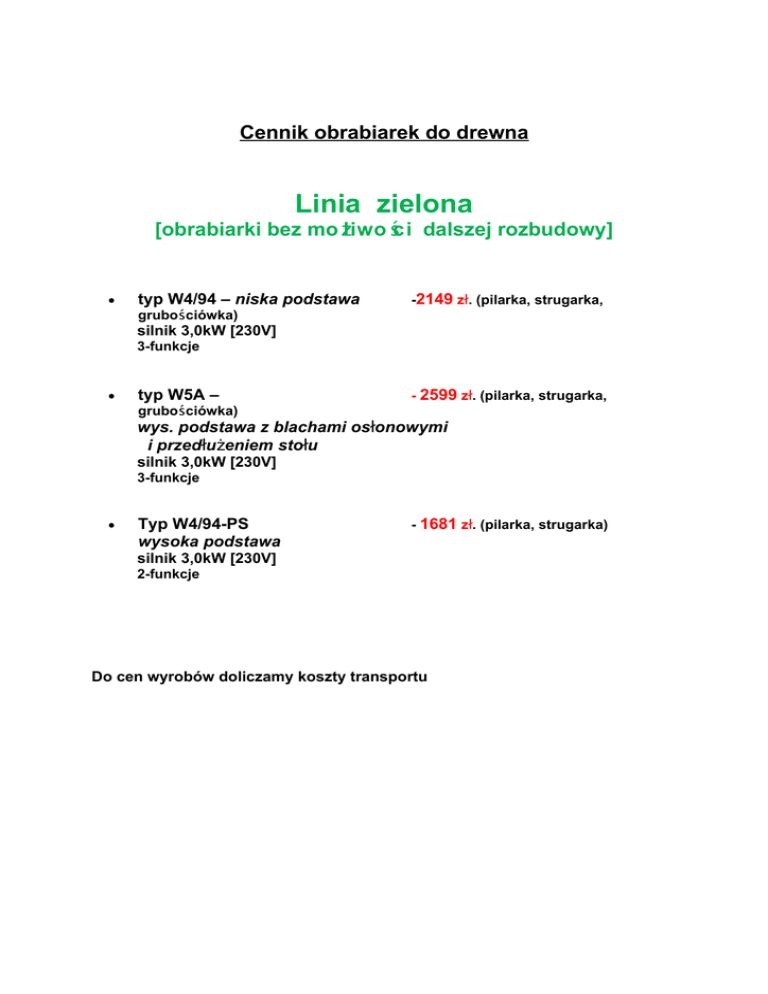 Cennik obrabiarek do drewna Linia zielona [obrabiarki bez mo żliwo ści dalszej rozbudowy] typ W4/94 – niska podstawa grubościówka) -2149 zł. (pilarka, strugarka, silnik 3,0kW [230V] 3-funkcje typ W5A – grubościówka) - 2599 zł. (pilarka, strugarka, wys. podstawa z blachami osłonowymi i przedłużeniem stołu silnik 3,0kW [230V] 3-funkcje Typ W4/94-PS wysoka podstawa - 1681 zł. (pilarka, strugarka) silnik 3,0kW [230V] 2-funkcje Do cen wyrobów doliczamy koszty transportu