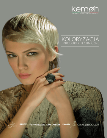 Koloryzacja i produkt y techniczne LUNEX unamy Koloryzacja i produKt y techniczne 1. Cramer 2. NaYo 3. Yo Coloring 4. Yo Cond 5. Performance HD 6. Uni.Color 7. Lunex System 8. Unamy System 4 Kemon KoLorYzaCja – NaYo WproWadzenie W śWiat Cramer Color dzięki cramer color najwyższa jakość oznacza również prostotę! Koloryzacja ta jest obecna na rynku od ponad 50 lat i stanowi dla fryzjera gwarancję jakości. dzięki połączeniu tradycji z nowoczesnością powstała wyjątkowa i niepowtarzalna koloryzacja. to rozwiązanie dla wszystkich fryzjerów, którzy poszukują: – trwałej koloryzacji w kremie, – łatwej i szybkiej aplikacji oraz wydajności, – pewnych rezultatów, – perfekcyjnego pokrycia siwych włosów. teChnologia Cramer Color innowacyjna formuła gwarantująca wierny i nieskazitelny rezultat. niskie stężenie amoniaku mikropigmenty o zwiększonej mocy przenikania Mniejsze otwarcie łusek zapewnia delikatniejsze działanie wobec struktury włosa. Łatwo wnikają między łuski włosa dzięki specjalnej formule opóźniającej ich utlenienie. długotrwały efekt koloryzacji po wniknięciu do wnętrza włosa pigmenty utleniają się, zwiększając swoją objętość, dzięki czemu pozostają zablokowane w strukturze włosa, dając długotrwały rezultat i blask włosów. olejek kokosowy Sprawia, że koloryzacja staje się zabiegiem pielęgnacyjnym, dzięki któremu włosy są jedwabiste, miękkie i pełne objętości. Kemon KoLorYzaCja – Cramer Color 5 paleta odCieni Cramer Color Szeroka i wyszukana gama odcieni umożliwiająca nieskończoną zabawę kolorem. Naturalny Naturalny Super- SuperCzarny Czarny Naturalny NaturalnyśródziemnoPopiel śródziemnonaturalny naturalny granatowygranatowy morski morski Matowy Popiel Tytoń Matowy Cynamon Tytoń Złoty ZłotoCynamon -miedziany 10.3 10 10 Platyna Platyna 10 10 10.2 10.2 10.33 99 Blond Blondbardzo bardzo jasny jasny 99 9.0 9.0 9.000 9.1 9.1 9.21 9.2 9.21 9.24 9.2 9.3 9.24 88 8.0 8.0 8.000 8.1 8.1 8.21 8.2 8.21 8.24 8.2 8.3 8.24 8.34 77 7.0 7.0 7.000 7.000 7.1 7.1 7.21 7.2 7.21 7.24 7.2 7.3 7.24 7.34 66 6.0 6.0 6.000 6.000 6.1 6.1 6.21 6.21 6.3 6.34 55 5.0 5.0 5.000 5.000 5.1 5.1 5.21 5.2 5.21 5.2 5.3 44 4.0 4.0 4.000 4.000 4.1 4.1 4.21 4.21 33 3.0 3.0 3.21 3.21 88 Blond Blond jasny jasny 77 Blond Blond 66 Blond Blond ciemny ciemny 55 Kasztan Jasny jasny brąz 44 Kasztan Brąz 33 Kasztan Ciemny ciemny brąz 2 2 Bardzo Brunatny ciemny brąz 2.11 11 Czarny Czarny 11 6 Kemon KoLorYzaCja – Cramer Color 2.11 MiedzianyMiedziany MiedzianyMiedziany SzkarłatnySzkarłatny Fioletowy Fioletowy kalny Brązowy Brązowy MiedzianyMiedziany SzkarłatnySzkarłatny Mahoniowy Mahoniowy ny Tropikalny złoty złoty szkarłatnyszkarłatny mahoń mahoń 36 8.41 8.36 8.41 8.44 8.44 7.4 7.4 36 7.41 7.36 7.43 7.41 7.43 7.44 7.44 36 6.41 6.36 6.43 6.41 6.44 6.43 6.45 6.44 36 36 SuperrozjaSuperrozjaKorektory Korektory śniacze śniacze 100 100 101 101 121 121 C.33 C.33 C.55 7.5 7.5 102 102 C.55 6.456.5 6.5 103 103 Superroz- Superrozjaśniacz jaśniacz neutralny neutralny 5.41 5.36 4.36 5.43 5.41 4.43 5.43 4.43 5.45 5.45 4.5 5.56 4.5 3.56 5.565.6 4.6 5.65.7 5.7 4.7 4.7 4.64.75 4.75 100/0 100/0 3.56 Kemon KoLorYzaCja – Cramer Color 7 GŁÓWnyM WyMoGieM noWoczeSnej Koloryzacji jeSt poKrycie SiWych WŁoSÓW KlientKi, KtÓre FarBUJĄ SiWe WŁoSY, WYmagaJĄ: – nieskazitelnego pokrycia, – jednolitego koloru od nasady po końcówki włosów, – połysku, – zwiększonej trwałości, – dopasowania rezultatu do ich wymagań. Jednak siwe włosy mają inną strukturę i wymagają szczególnej uwagi... SiWe WŁoSY Są pozbawione pigmentu, przy farbowaniu mogą pozostać transparentne, a rezultat kolorystyczny może być matowy. naturalny włos jest pełen melaniny (pigmentu) Siwy włos jest pozbawiony pigmentu, jego struktura jest bardziej sztywna, a kutikula bardziej zwarta tradycyjna koloryzacja nie jest w stanie zapewnić na włosach siwych takiego samego rezultatu jak w przypadku aplikacji na włosach naturalnych. należy użyć koloryzacji innej niż pozostałe Bogatej w pigmenty aby nasycić nimi włos pozbawiony pigmentów Bardziej skutecznej Mającej możliwość wniknięcia do wnętrza nawet najtrudniejszej struktury włosa 8 Kemon KoLorYzaCja – Cramer Color cramer color przedstawia Super natural Nowa seria naturalna o zwiększonym kryciu, o intensywnych i ciepłych odcieniach, pozwalających uzyskać wyraźne i pełne blasku refleksy. Wzbogacona specjalnymi pigmentami, dzięki którym rezultat kolorystyczny jest o 40% bardziej intensywny. Formuła opracowana w taki sposób, aby pracować wyłącznie z użyciem uni.color 9%. zapewnia idealne i jednolite pokrycie nawet najtrudniejszych siwych włosów. Ma ponadto działanie zwalczające wolne rodniki dzięki zawartości olejku kokosowego. olejek kokosowy: bogaty w antyoksydanty, zapobiega rozwojowi wolnych rodników. odcienie: 4.000, 5.000, 6.000, 7.000, 8.000, 9.000 Proporcja mieszania: 1:1 wyłącznie z uni.color 9% Czas działania: 40 minut Kemon KoLorYzaCja – Cramer Color 9 KoŁo KolorYmetrYCzne 91 odcieni, które można między sobą mieszać, stanowi kompletną gamę kolorów gwarantującą rozwiązanie odpowiednie dla wszystkich potrzeb fryzjera. 2 serie naturalne: jedna z nich pozwala uzyskać tradycyjny efekt, druga powstała dla osób, które uwielbiają kolory ciepłe i pełne blasku 1 seria supernaturalna: gwarantuje nieskazitelne pokrycie siwych włosów nawet przy dużej ich ilości oraz w przypadkach wyjątkowo trudnych włosów 16 serii refleksów: 61 odcieni koloryzacji utlenianej 1 seria superblondów: 5 odcieni do rozjaśniania o 4/5 tonów na włosach naturalnych 1 superblond neutralny: zwiększa moc rozjaśniania o 1 ton 1 seria korektorów: 2 odcienie służące do zwiększenia intensywności koloru lub skorygowania niechcianych refleksów 10 Kemon KoLorYzaCja – Cramer Color SpoSÓB UżYCia Łatwa do wymieszania, nałożenia, spłukania i usunięcia. tuba 