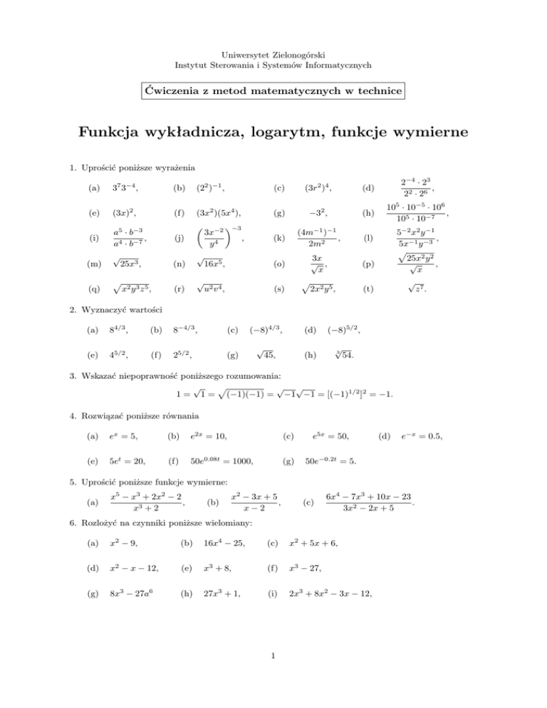 Uniwersytet Zielonogórski Instytut Sterowania i Systemów Informatycznych Ćwiczenia z metod matematycznych w technice Funkcja wykładnicza, logarytm, funkcje wymierne 1. Uprościć poniższe wyrażenia (a) 37 3−4 , (b) (22 )−1 , (c) (3r2 )4 , (d) 2−4 · 23 , 22 · 26 (e) (3x)2 , (f) (3x2 )(5x4 ), (g) −32 , (h) 105 · 10−5 · 106 , 105 · 10−7 (k) (4m−1 )−1 , 2m2 (l) 16x5 , (o) 3x √ , x (p) u2 v 4 , (s) p 2x2 y 5 , (t) (m) a5 · b−3 , a4 · b−7 √ 25x3 , (n) (q) p x2 y 3 z 5 , (r) (i) 3x−2 y4 (j) √ √ −3 , 5−2 x2 y −1 , 5x−1 y −3 p 25x2 y 2 √ , x √ z7. 2. Wyznaczyć wartości (a) 84/3 , (b) 8−4/3 , (c) (e) 45/2 , (f) 25/2 , (g) (−8)4/3 , √ (d) 45, (h) (−8)5/2 , √ 3 54. 3. Wskazać niepoprawność poniższego rozumowania: p √ √ √ 1 = 1 = (−1)(−1) = −1 −1 = [(−1)1/2 ]2 = −1. 4. Rozwiązać poniższe równania (a) ex = 5, (b) e2x = 10, (c) e5x = 50, (e) 5et = 20, (f) 50e0.08t = 1000, (g) 50e−0.2t = 5. (d) e−x = 0.5, 5. Uprościć poniższe funkcje wymierne: (a) x5 − x3 + 2x2 − 2 , x3 + 2 (b) x2 − 3x + 5 , x−2 (c) 6x4 − 7x3 + 10x − 23 . 3x2 − 2x + 5 6. Rozlożyć na czynniki poniższe wielomiany: (a) x2 − 9, (b) 16x4 − 25, (c) x2 + 5x + 6, (d) x2 − x − 12, (e) x3 + 8, (f) x3 − 27, (g) 8x3 − 27a6 (h) 27x3 + 1, (i) 2x3 + 8x2 − 3x − 12, 1 7. Zapisać jako jeden ułamek, który należy następnie skrócić: (a) 1 x + , x 2 (b) 1 x+1 + , x−1 3 (c) (d) x−1 x · , x+1 x+3 (e) (x − 1)(x + 2) , (x2 − 4) (f) 1 x − , x−1 x+2 √ x+1 1 √ + . 1− x x 8. Rozwiązać nierówności (a) x2 − x − 4 ¬ 1, x−1 (b) x2 − 2x − 8 < 0, x (c) (x + 2)(x − 3) > 0, x−1 (d) 1 1 ¬ , x+3 x−2 (e) 2 x + < 2, x 2 (f) x+4 x < . x 2 2