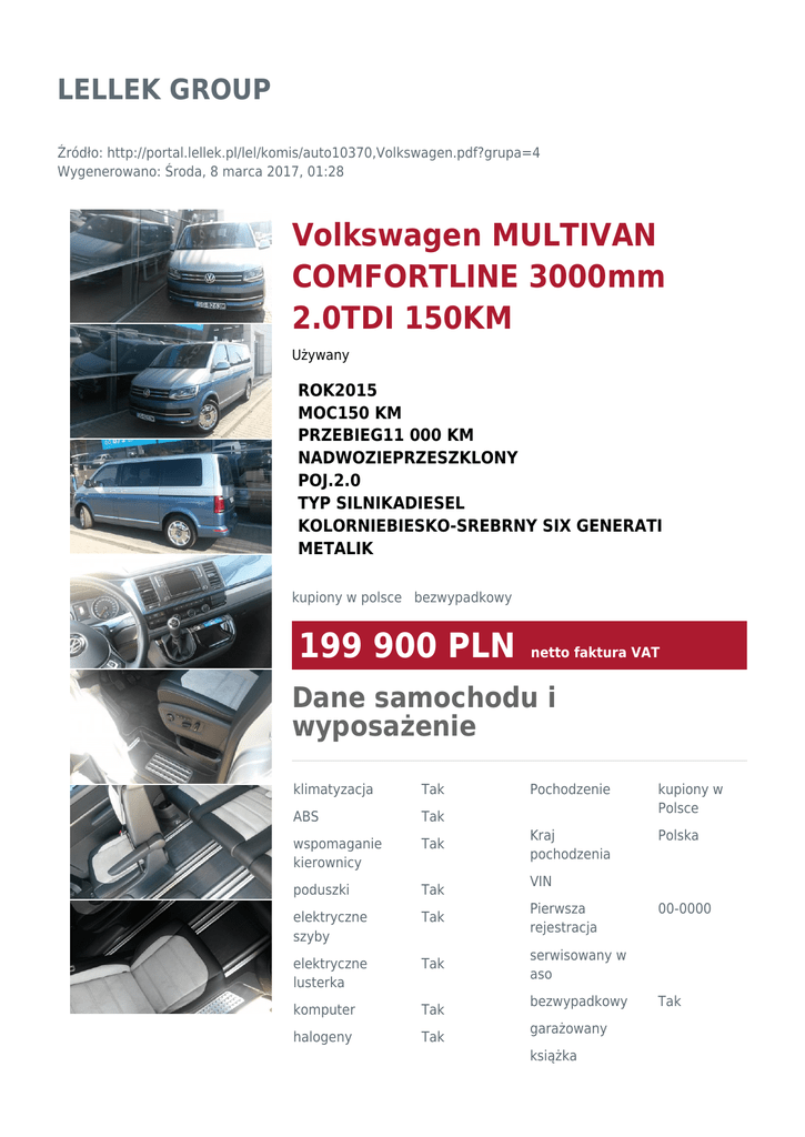LELLEK GROUP Źródło: http://portal.lellek.pl/lel/komis/auto10370,Volkswagen.pdf?grupa=4 Wygenerowano: Środa, 8 marca 2017, 01:28 Volkswagen MULTIVAN COMFORTLINE 3000mm 2.0TDI 150KM Używany ROK2015 MOC150 KM PRZEBIEG11 000 KM NADWOZIEPRZESZKLONY POJ.2.0 TYP SILNIKADIESEL KOLORNIEBIESKO-SREBRNY SIX GENERATI METALIK kupiony w polsce bezwypadkowy 199 900 PLN netto faktura VAT Dane samochodu i wyposażenie klimatyzacja Tak Pochodzenie kupiony w Polsce ABS Tak wspomaganie kierownicy Tak Kraj pochodzenia Polska poduszki Tak elektryczne szyby Tak Pierwsza rejestracja elektryczne lusterka Tak serwisowany w aso komputer Tak halogeny Tak VIN bezwypadkowy garażowany książka 00-0000 Tak serwisowa Handlowiec I właściciel Marcin Sojka zapytaj mobile +48 693 153 245 kupiony w salonie tunning homologacja Gwarancja Gwarancja stan idealny Ubezpieczenie Ubezpieczenie właściciel niepalący dostępna Opis dodatkowy dostępne Volkswagen Multivan Comfortline 3000mm 2.0TDI 150KM Kredyt Kredyt dostępny kolor: niebiesko-srebrny (six generation) tapicerka: alcantara Wersja specjalna Comfortline SIX GENERATION. Zeskanuj kod, aby zobaczyć ofertę online -Dwa pojedyncze fotele obrotowe (II rząd) -Ogrzewanie foteli kierowcy i pasażera - Aktywne zawieszenie ACC -Alcantara -Szyby w kabinie kierowcy sterowane elektrycznie -Okna w przestrzeni pasażerskiej po lewej stronie przesuwne (II rząd) -Okna w przestrzeni pasażerskiej przyciemniane -Drzwi przesuwne po lewej stronie -Drzwi przesuwne po prawej stronie ze wspomaganiem domykania -Drzwi przesuwne po lewej stronie ze wspomaganiem domykania -Kurtyny powietrzne w przestrzeni pasażerskiej -Podgrzewana przednia szyba -Światła przeciwmgielne z przodu zintegrowane ze zderzakiem -System komunikacji wewnętrznej DVE -Front Assist -ParkPilot - czujniki parkowania w przednim i tylnym zderzaku + kamera -Adaptive chassis control -Czujnik zmęczenia kierowcy -Side Assist - asystent zmiany pasa -Asystent świateł drogowych Light Assist -Reflektory LED Czujnik deszczu -Adaptive Cruise Control - dla manualnej skrzyni biegów -Klimatyzacja trzystrefowa Climatronic z elektroniczną regulacją -Kierownica wielofunkcyjna -Bluetooth z obsługą WLAN "Comfort" -Radio/navigation system "Discover Media" -Volkswagen Media Control i MirrorLink -Voice control -2 USB (dodatkowo dla iPod/iPhone) oraz AUX-IN jack -Pakiet elementów chromowanych -Pakiet dla palących -Elektryczna regulacja wysokości dla foteli kierowcy i pasażera Samochód demo dealera Nota prawna Informacja nie stanowi oferty w rozumieniu art. 66 Kodeksu Cywilnego. Podane dane mają charakter wyłącznie informacyjny. Pełna informacja dostępna jest u handlowca. Sprzedający nie odpowiada za ewentualne błędy lub nieaktualność ogłoszenia.