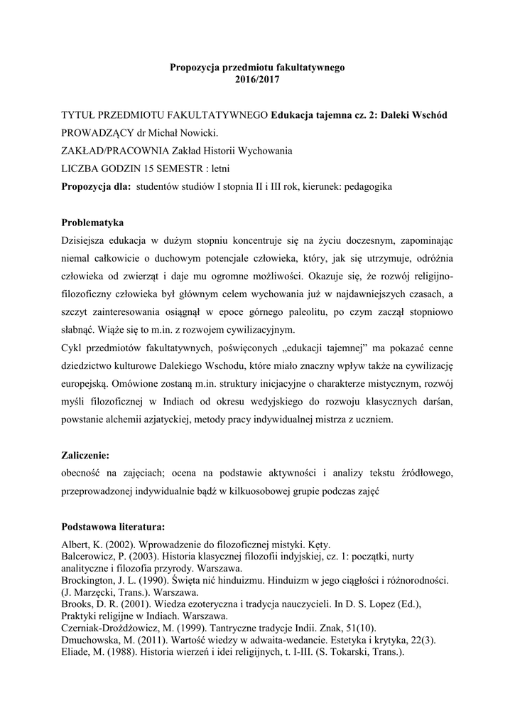 Propozycja przedmiotu fakultatywnego 2016/2017 TYTUŁ PRZEDMIOTU FAKULTATYWNEGO Edukacja tajemna cz. 2: Daleki Wschód PROWADZĄCY dr Michał Nowicki. ZAKŁAD/PRACOWNIA Zakład Historii Wychowania LICZBA GODZIN 15 SEMESTR : letni Propozycja dla: studentów studiów I stopnia II i III rok, kierunek: pedagogika Problematyka Dzisiejsza edukacja w dużym stopniu koncentruje się na życiu doczesnym, zapominając niemal całkowicie o duchowym potencjale człowieka, który, jak się utrzymuje, odróżnia człowieka od zwierząt i daje mu ogromne możliwości. Okazuje się, że rozwój religijnofilozoficzny człowieka był głównym celem wychowania już w najdawniejszych czasach, a szczyt zainteresowania osiągnął w epoce górnego paleolitu, po czym zaczął stopniowo słabnąć. Wiąże się to m.in. z rozwojem cywilizacyjnym. Cykl przedmiotów fakultatywnych, poświęconych „edukacji tajemnej” ma pokazać cenne dziedzictwo kulturowe Dalekiego Wschodu, które miało znaczny wpływ także na cywilizację europejską. Omówione zostaną m.in. struktury inicjacyjne o charakterze mistycznym, rozwój myśli filozoficznej w Indiach od okresu wedyjskiego do rozwoju klasycznych darśan, powstanie alchemii azjatyckiej, metody pracy indywidualnej mistrza z uczniem. Zaliczenie: obecność na zajęciach; ocena na podstawie aktywności i analizy tekstu źródłowego, przeprowadzonej indywidualnie bądź w kilkuosobowej grupie podczas zajęć Podstawowa literatura: Albert, K. (2002). Wprowadzenie do filozoficznej mistyki. Kęty. Balcerowicz, P. (2003). Historia klasycznej filozofii indyjskiej, cz. 1: początki, nurty analityczne i filozofia przyrody. Warszawa. Brockington, J. L. (1990). Święta nić hinduizmu. Hinduizm w jego ciągłości i różnorodności. (J. Marzęcki, Trans.). Warszawa. Brooks, D. R. (2001). Wiedza ezoteryczna i tradycja nauczycieli. In D. S. Lopez (Ed.), Praktyki religijne w Indiach. Warszawa. Czerniak-Drożdżowicz, M. (1999). Tantryczne tradycje Indii. Znak, 51(10). Dmuchowska, M. (2011). Wartość wiedzy w adwaita-wedancie. Estetyka i krytyka, 22(3). Eliade, M. (1988). Historia wierzeń i idei religijnych, t. I-III. (S. Tokarski, Trans.). Warszawa. Eliade, M. (2000). Alchemia azjatycka. (I. Kania, Trans.). Warszawa. Eliade, M. (2007). Kowale i alchemicy. (A. Leder, Trans.). Warszawa. Flood, G. (2008). Hinduizm. Wprowadzenie. (M. Ruchel, Trans.). Kraków. Hamilton, S. (2010). Filozofia indyjska. Wprowadzenie. (M. Szkółka & M. Jakubczak, Trans.). Kraków. Jakubczak, M. (1999). Poznanie wyzwalające. Filozofia jogi klasycznej. Kraków. Jakubczak, M. (2001). Elementy filozofii jogi. In B. Szymańska (Ed.), Filozofia Wschodu. Kraków. Kudelska, M. (2001). Filozofia Indii - kilka uwag wstępnych. In B. Szymańska (Ed.), Filozofia Wschodu. Kraków. Kudelska, M. (2006). Hinduizm. Kraków. Sacha-Piekło, M. (1999). Tam gdzie pustka staje się światłem. Symbol światła w doktrynie i prraktykach siddhajogi. Kraków. Sellmer, S. (2011). Indyjski schemat “celów człowieka.” Estetyka i krytyka, 22(3). Stadnik, A. (Trans.). (2009). Bhagawadgita. Wrocław. Trzciński, Ł. (2001). Tantra śiwaicka. In B. Szymańska (Ed.), Filozofia Wschodu. Kraków.