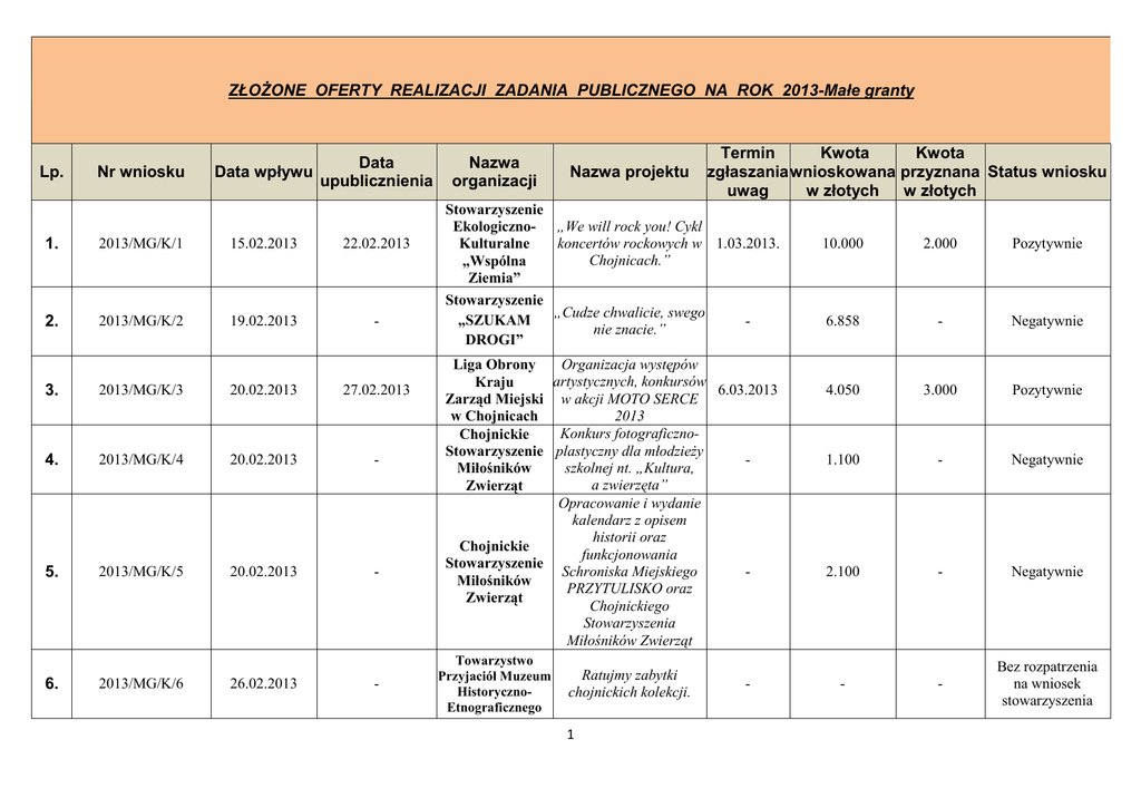 ZŁOŻONE OFERTY REALIZACJI ZADANIA PUBLICZNEGO NA ROK 2013-Małe granty Lp. Nr wniosku Data wpływu Data upublicznienia 1. 2013/MG/K/1 15.02.2013 22.02.2013 2. 2013/MG/K/2 19.02.2013 - 3. 2013/MG/K/3 20.02.2013 27.02.2013 4. 2013/MG/K/4 20.02.2013 - 5. 2013/MG/K/5 20.02.2013 - 6. 2013/MG/K/6 26.02.2013 - Nazwa organizacji Nazwa projektu Termin Kwota Kwota zgłaszania wnioskowana przyznana Status wniosku uwag w złotych w złotych Stowarzyszenie Ekologiczno- „We will rock you! Cykl koncertów rockowych w 1.03.2013. Kulturalne Chojnicach.” „Wspólna Ziemia” Stowarzyszenie „Cudze chwalicie, swego „SZUKAM nie znacie.” DROGI” Organizacja występów Liga Obrony artystycznych, konkursów Kraju 6.03.2013 Zarząd Miejski w akcji MOTO SERCE 2013 w Chojnicach Konkurs fotograficznoChojnickie Stowarzyszenie plastyczny dla młodzieży szkolnej nt. „Kultura, Miłośników a zwierzęta” Zwierząt Opracowanie i wydanie kalendarz z opisem historii oraz Chojnickie funkcjonowania Stowarzyszenie Schroniska Miejskiego Miłośników PRZYTULISKO oraz Zwierząt Chojnickiego Stowarzyszenia Miłośników Zwierząt Towarzystwo Przyjaciół Muzeum HistorycznoEtnograficznego Ratujmy zabytki chojnickich kolekcji. 1 - 10.000 2.000 Pozytywnie 6.858 - Negatywnie 4.050 3.000 Pozytywnie 1.100 - Negatywnie 2.100 - Negatywnie - - Bez rozpatrzenia na wniosek stowarzyszenia Upamiętnienie 7. 2013/MG/K/7 15.03.2013 - 8. 2013/MG/K/8 19.03.2013 23.03.2013 9. 2013/MG/K/9 10.04.2013 18.03.2013 10. 2013/MG/K/10 29.04.2013 - Stowarzyszenie wielowiekowej obecności Symbioza Kultur społeczności żydowskiej - w Chojnciach Organizacja „Dnia kultury Młodzieżowej” – Fundacja Rozwoju otwartej imprezy dla Ziemi Chojnickiej 29.03.2013 młodzieży powiatu i Człuchowskej chojnickiego w 2013 roku. Ratujmy zabytki Towarzystwo chojnickich kolekcji. Przyjaciół Muzeum Konserwacja zbiorów Historyczno24.04.2013 Muzeum HistorycznoEtnograficznego Etnograficznego w Chojnicach w Chojnicach Organizacja przejazdu Fundacja Rozwoju mieszkańców Chojnic na Ziemi Chojnickiej koncert w Miejskim i Człuchowskej Domu Kultury w Człuchowie 3.710 - 5.345 4.000 6.000 400 Negatywnie Pozytywnie - - Negatywnie SPORT ZŁOŻONE OFERTY REALIZACJI ZADANIA PUBLICZNEGO NA ROK 2013-Małe granty Lp. 1. Nr wniosku 2013/MG/S/1 Data Data wpływu upublicznienia 10.06.2013 17.06.2013 Nazwa organizacji Uczniowski Klub Sportowy „BOKSER” Nazwa projektu Termin Kwota Kwota zgłaszania wnioskowana przyznana Status wniosku uwag w złotych w złotych „Organizacja przygotowań i 24.06.2013 uczestnictwa w regionalnych imprezach 2 5.000 5.000 Pozytywnie sportowych. BOKS.” „Udział w szkoleniu 2. 3. 2013/MG/S/2 2013/MG/S/3 28.06.2013 14.10.2013 - 15.10.2013 Klub Sportowy „BOXING TEAM Chojnice” przygotowawczym do współzawodnictwa sportowego na szczeblu lokalnym – Lokalny turniej Bokserski ChojniceLubiana - Kościerzyna.” 6.700,60 - „Organizacja VI Uczniowski Klub Międzynarodowego Sportowy 22.10.2013 Turnieju im. Tadeusza „BOKSER” Kiedrowskiego” 4. 5. 6. 3 - 4.250 Negatywnie W trakcie rozpatrywania