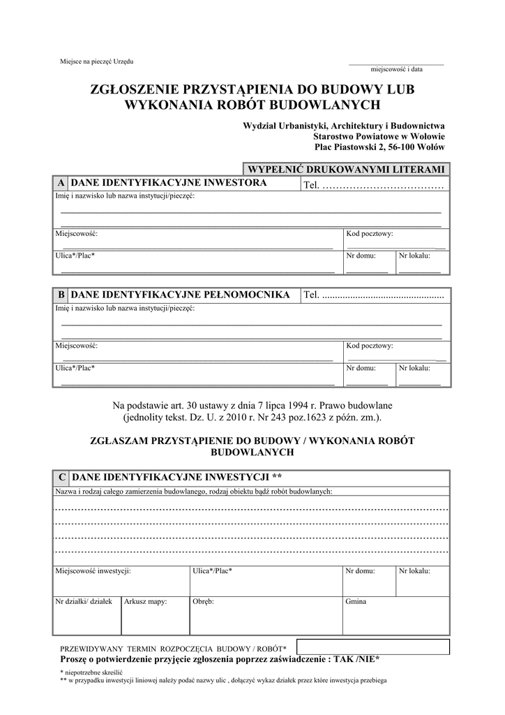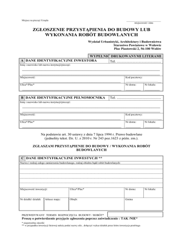 Miejsce na pieczęć Urzędu ____________________________ miejscowość i data ZGŁOSZENIE PRZYSTĄPIENIA DO BUDOWY LUB WYKONANIA ROBÓT BUDOWLANYCH Wydział Urbanistyki, Architektury i Budownictwa Starostwo Powiatowe w Wołowie Plac Piastowski 2, 56-100 Wołów WYPEŁNIĆ DRUKOWANYMI LITERAMI A DANE IDENTYFIKACYJNE INWESTORA Tel. ……………………………… Imię i nazwisko lub nazwa instytucji/pieczęć: ________________________________________________________________ ________________________________________________________________ Miejscowość: _____________________________________________________ Ulica*/Plac* Kod pocztowy: _________________________ Nr domu: Nr lokalu: ______________________________________________ _______ _______ B DANE IDENTYFIKACYJNE PEŁNOMOCNIKA Tel. ................................................ Imię i nazwisko lub nazwa instytucji/pieczęć: ________________________________________________________________ ________________________________________________________________ Miejscowość: _____________________________________________________ Ulica*/Plac* Kod pocztowy: _________________________ Nr domu: Nr lokalu: ______________________________________________ _______ _______ Na podstawie art. 30 ustawy z dnia 7 lipca 1994 r. Prawo budowlane (jednolity tekst. Dz. U. z 2010 r. Nr 243 poz.1623 z późn. zm.). ZGŁASZAM PRZYSTĄPIENIE DO BUDOWY / WYKONANIA ROBÓT BUDOWLANYCH C DANE IDENTYFIKACYJNE INWESTYCJI ** Nazwa i rodzaj całego zamierzenia budowlanego, rodzaj obiektu bądź robót budowlanych: Miejscowość inwestycji: Ulica*/Plac* Nr domu: Nr działki/ działek Obręb: Gmina Arkusz mapy: PRZEWIDYWANY TERMIN ROZPOCZĘCIA BUDOWY / ROBÓT* Proszę o potwierdzenie przyjęcie zgłoszenia poprzez zaświadczenie : TAK /NIE* * niepotrzebne skreślić ** w przypadku inwestycji liniowej należy podać nazwy ulic , dołączyć wykaz działek przez które inwestycja przebiega Nr lokalu: OPŁATA SKARBOWA (wypełnia wnioskodawca zaznaczając właściwe kwadraty pola oznaczone kolorem szarym wypełnia pracownik) nie podlega art. 2 ust. 1 pkt 2 budownictwo mieszkaniowe (w tym urządzenia D □ i budowle z nim związane) zwolnienie art. 7 pkt 2 jednostki budżetowe □ pkt 3 jednostki samorządu terytorialnego □ pkt 4 organizacje pożytku publicznego □ pkt 5 korzystanie z pomocy społecznej z powodu ubóstwa (dołączyć zaświadczenie) □ inne przypadki przewidziane ustawą art ............................... kwota pobrana pełnomocnictwo 17 zł zaświadczenie 17 z ł x należna dopłata □ zwrot zweryfikowano wysokość pobranej opłaty suma podpis i pieczęć potwierdzenie nr pokwitowania data wpłaty podpis i pieczęć osoby przyjmującej przyjęcia opłaty Urząd Miasta i Gminy Wołów 98 1020 5242 0000 2502 0029 2656 dopłaty Urząd Miasta i Gminy Wołów 98 1020 5242 0000 2502 0029 2656 wysokość opłaty zostanie zweryfikowana po opracowaniu dokumentu wg przepisów ustawy o opłacie skarbowej z dnia 16 listopada 2006 roku (Dz. U. nr 225 poz. 1635) E 1. DO ZGŁOSZENIA DOŁĄCZAM:* Ilość OPRACOWANIE ZAWIERAJĄCE: • opis określający rodzaj, zakres i sposób wykonywania robót, • szkice i rysunki, • decyzję o środowiskowych uwarunkowaniach (w przypadku inwestycji mogących znacząco oddziaływać na środowisko) • 2. inne pozwolenia wymagane odrębnymi przepisami, projekt zagospodarowania terenu (jeżeli jest wymagany - art. 30 ust. 3 i 4 ustawy - Prawo budowlane) wykonany przez projektanta posiadającego odpowiednie uprawnienia budowlane wraz z: 3. • zaświadczeniem o przynależności projektantów (oraz sprawdzających) do właściwej izby samorządu zawodowego z określonym terminem ważności aktualne na dzień opracowania projektu, • oświadczeniem projektanta (oraz sprawdzającego) o sporządzeniu projektu zagospodarowania terenu, zgodnie z obowiązującymi przepisami oraz zasadami wiedzy technicznej , oświadczenie o posiadaniu prawa do dysponowania nieruchomością na cele budowlane 4. upoważnienie udzielone osobie działającej w imieniu inwestora, 5. w przypadku wniosku składanego przez osobę prawną „odpis aktualny z Rejestru Przedsiębiorców" Krajowego Rejestru Sądowego, 6. wykaz działek w przypadku inwestycji liniowej lub braku miejsca w części C, 7. dowód wpłaty opłaty skarbowej 8. Pouczenie: 1) Do wykonania robót budowlanych można przystąpić, jeżeli w terminie 30 dni od dnia doręczenia zgłoszenia właściwy organ nie wniesie, w drodze decyzji, sprzeciwu nie później niż po upływie dwóch lat od określonego w zgłoszeniu terminu ich rozpoczęcia. Oświadczam, że zapoznałam/łem się z pouczeniem zawartym w druku zgłoszenia .............................................................. (podpis inwestora lub osoby przez niego upoważnionej) * niepotrzebne skreślić ** w przypadku inwestycji liniowej należy podać nazwy ulic , dołączyć wykaz działek przez które inwestycja przebiega