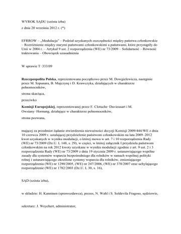 WYROK SĄDU (szósta izba) z dnia 20 września 2012 r. (*) EFRROW – „Modulacja” – Podział uzyskanych oszczędności między państwa członkowskie – Rozróżnienie między starymi państwami członkowskimi a państwami, które przystąpiły do Unii w 2004 r. – Artykuł 9 ust. 2 rozporządzenia (WE) nr 73/2009 – Solidarność – Równość traktowania – Obowiązek uzasadnienia W sprawie T‑333/09 Rzeczpospolita Polska, reprezentowana początkowo przez M. Dowgielewicza, następnie przez M. Szpunara, B. Majczynę i D. Krawczyka, działających w charakterze pełnomocników, strona skarżąca, przeciwko Komisji Europejskiej, reprezentowanej przez F. Clotuche‑Duvieusart i M. Owsiany‑Hornung, działające w charakterze pełnomocników, strona pozwana, mającej za przedmiot żądanie stwierdzenia nieważności decyzji Komisji 2009/444/WE z dnia 10 czerwca 2009 r. ustalającej przydzielenie państwom członkowskim na lata 2009–2012 kwot uzyskanych w wyniku modulacji, o której mowa w art. 7 i 10 rozporządzenia Rady (WE) nr 73/2009 (Dz.U. L 148, s. 29), w części, w której załącznik I przydziela państwom członkowskim na rok 2012 kwoty uzyskane w wyniku modulacji zgodnie z art. 9 ust. 2 i 3 rozporządzenia Rady (WE) nr 73/2009 z dnia 19 stycznia 2009 r. ustanawiającego wspólne zasady dla systemów wsparcia bezpośredniego dla rolników w ramach wspólnej polityki rolnej i ustanawiającego określone systemy wsparcia dla rolników, zmieniającego rozporządzenia (WE) nr 1290/2005, (WE) nr 247/2006, (WE) nr 378/2007 oraz uchylającego rozporządzenie (WE) nr 1782/2003 (Dz.U. L 30, s. 16), SĄD (szósta izba), w składzie: H. Kanninen (sprawozdawca), prezes, N. Wahl i S. Soldevila Fragoso, sędziowie, sekretarz: J. Weychert, administrator, uwzględniając procedurę pisemną i po przeprowadzeniu rozprawy w dniu 29 marca 2012 r., wydaje następujący Wyrok Ramy prawne i okoliczności powstania sporu 1 Zgodnie z motywem 5 rozporządzenia Rady (WE) nr 1782/2003 z dnia 29 września 2003 r. ustanawiającego wspólne zasady dla systemów wsparcia bezpośredniego w ramach wspólnej polityki rolnej i ustanawiającego określone systemy wsparcia dla rolników oraz zmieniającego rozporządzenia (EWG) nr 2019/93, (WE) nr 1452/2001, (WE) nr 1453/2001, (WE) nr 1454/2001, (WE) nr 1868/94, (WE) nr 1251/1999, (WE) nr 1254/1999, (WE) nr 1673/2000, (EWG) nr 2358/71 oraz (WE) nr 2529/2001 (Dz.U. L 270, s. 1): „W celu osiągnięcia lepszej równowagi pomiędzy narzędziami kształtowania polityki zaprojektowanymi do promowania zrównoważonego rolnictwa oraz narzędziami zaprojektowanymi do promowania rozwoju obszarów wiejskich należy wprowadzić system stopniowego zmniejszania płatności bezpośrednich o charakterze obowiązkowym na obszarze całej Wspólnoty na lata 2005–2012. Wszystkie płatności bezpośrednie, przewyższające określone kwoty, powinny być zmniejszane każdego roku o określoną wartość procentową. Powstałe stąd oszczędności powinny być wykorzystywane na potrzeby finansowania środków w ramach rozwoju obszarów wiejskich oraz powinny być rozdzielone pomiędzy państwa członkowskie przy zastosowaniu obiektywnych kryteriów, które zostaną zdefiniowane. Jednakże celowym jest ustanowienie tego, aby określony procent kwot pozostawał w państwach członkowskich, w których kwoty takie zostały wygospodarowane”. 2 Zgodnie z art. 2 lit. d) tego rozporządzenia „płatność bezpośrednia” oznacza płatność przyznawaną bezpośrednio rolnikom w ramach systemu wsparcia dochodowego wyszczególnionego w załączniku I do tego rozporządzenia. 3 Funkcjonowanie systemu stopniowego zmniejszania płatności bezpośrednich (zwanego dalej „modulacją”), o którym mowa we wspomnianym motywie 5, zostało zdefiniowane po raz pierwszy w art. 10 rozporządzenia nr 1782/2003, który ma brzmienie następujące: „1. Wszystkie kwoty płatności bezpośrednich przyznawanych w danym roku kalendarzowym rolnikowi w danym państwie członkowskim są zmniejszane w każdym roku do 2012 r. o następujące wielkości procentowe: […] [5% od 2007 do 2012 r.]. 2. Kwoty wynikające z zastosowania zmniejszeń przewidzianych w ust. 1, po odliczeniu całkowitych kwot określonych w załączniku II, są dostępne jako dodatkowe wsparcie wspólnotowe dla środków w ramach programowania rozwoju obszarów wiejskich finansowanego w ramach Sekcji Gwarancji EFOGR zgodnie z rozporządzeniem (WE) nr 1257/1999. 3. Kwota odpowiadająca jednemu punktowi procentowemu jest przydzielana państwu członkowskiemu, w którym uzyskano odpowiednie kwoty. Pozostałe kwoty są przydzielane zainteresowanym państwom członkowskim zgodnie z procedurą określoną w art. 144 ust. 2 na podstawie następujących kryteriów: […] Jednakże dane państwo członkowskie otrzymuje co najmniej 80% całkowitych kwot, które zostały uzyskane w wyniku modulacji w tym państwie członkowskim. […]”. 4 Artykuł 78 rozporządzenia Komisji (WE) nr 796/2004 z dnia 21 kwietnia 2004 r. ustanawiającego szczegółowe zasady wdrażania wzajemnej zgodności, modulacji oraz zintegrowanego systemu administracji i kontroli przewidzianych w rozporządzeniu Rady (WE) nr 1782/2003 (Dz.U. L 141, s. 18) ustanowił klucz przydziału dla kwot wynikających z modulacji, o której mowa w art. 10 ust. 3 rozporządzenia nr 1782/2003. Z tego przepisu rozporządzenia nr 796/2004 wynika, że ów klucz przydziału jest obliczany na podstawie udziałów państw członkowskich w powierzchni gruntów rolnych i zatrudnieniu w rolnictwie, mających odpowiednio wagę 65% i 35%. Udział każdego państwa członkowskiego w obszarze i zatrudnieniu zostanie dostosowany odpowiednio do jego produktu krajowego brutto (PKB) na jednego mieszkańca wyrażonego w standardzie siły nabywczej, przy użyciu jednej trzeciej różnicy średniej państw członkowskich, do których ma zastosowanie modulacja. W tym celu wykorzystywane są określone