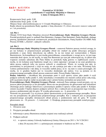 Protokół nr XVII/2011 z posiedzenia 17 sesji Rady Miejskiej w Głuszycy w dniu 21 listopada 2011 r. Rozpoczęcie Sesji: godz. 9.00 Zakończenie Sesji: godz. 12.40 Miejsce Sesji: sala konferencyjna nr 11 Urzędu Miejskiego w Głuszycy. Radni obecni na posiedzeniu Rady zgodnie z listą obecności 15, (lista obecności stanowi załącznik nr 1 do protokołu). Ad. Pkt 1 Obrady XVII Sesji Rady Miejskiej otworzył Przewodniczący Rady Miejskiej Grzegorz Pieroń, Powitał przybyłych gości w osobach Pani Burmistrz, Zastępcy Pani Burmistrz, Panią Skarbnik, obsługę prawną, dyrektorów placówek oswiatowych, przybyłych mieszkańców, Panią Dyektor CK-MBP, Pana Prezesa ZUMiK i „Osówki”, radnych i sołtysów. Ad. Pkt 2 Przewodniczący Rady Miejskiej Grzegorz Pieroń – szanowni Państwo proszę zwrócić uwagę, Ŝe po raz kolejny w proponowanym porządku obrad nie znalazł się punkt dotyczący przyjęcia protokołu z sesji, które dotychczas się odbyły. Ja na ten temat juŜ rozmawiałem z Panem Burmistrzem. Są komplikacje to jest trochę pracochłonne, czasochłonne z uwagi na to, Ŝe jest tego materiału dość sporo, no ale myślę, Ŝe tutaj Pan Burmistrz po tym jak zobowiązał się, Ŝe jakieś tam wsparcie zostanie udzielone dla Pana Darka to protokoły będą gotowe w najbliŜszym czasie i myślę, Ŝe do kolejnej sesji będziemy mogli się z nimi zapoznać i przyjąć je na sesji grudniowej, takŜe proszę radnych Ŝeby się jeszcze uzbroili w cierpliwość. Wiem, Ŝe wymóg jest taki, Ŝe powinniśmy to przyjmować z sesji na sesję, no ale sytuacja jest taka a nie inna. Wcześniej były wybory parlamentarne i tak dalej, to wszystko natłok pracy, Ŝe to się nam w czasie przeciągło, ale myślę, Ŝe w grudniu będzie juŜ to wszystko domknięte jak naleŜy. Czy są pytania co do proponowanego porządku obrad, proszę szanowni radni. Proszę Radny Sakowicz. Radny Sakowicz – chciałbym aby przesunięto punt 6 czyli sprawy róŜne jako punkt 4 czyli podjęcie uchwały byłby punkt 5, Ŝeby mieszkańcy ewentualnie nie musieli czekać przez całą sesję, jeśli są pytania mogli je zadać na początku sesji i potem byśmy normalnie juŜ pracowali. Przewodniczący Rady Miejskiej Grzegorz Pieroń - wniosek Pana radnego został przyjęty, czy są jeszcze jakieś propozycje co do porządku. Skoro nie ma przejdziemy do głosowania nad wnioskiem złoŜonego przez radnego Sakowicza o przesunięcie punktu 6 sprawy róŜne jako punkt 4. Kolejno zmieni się punkt 5 będzie dopiero podjęcie uchwał. Kto z radnych jest za przyjęciem tego wniosku, proszę o podniesienie ręki do góry. W wyniku głosowania: za – 6, przeciwko – 9. Wniosek nie przeszedł. Czy są jeszcze jakieś spostrzeŜenia co do proponowanego porządku. Skoro nie ma przejdziemy do głosowania proponowanego porządku. Kto z radnych jest za przyjęciem proponowanego porządku dzisiejszych obrad proszę o podniesienie ręki do góry. W wyniki głosowania: za – 10, przeciw – 3, wstrzymał – 2. Dziękuję, proponowany porządek został przyjęty. Porządek obrad: 1. Otwarcie sesji. 2. Przyjęcie porządku obrad. 3. Informacja o pracy Burmistrza między sesjami oraz realizacji uchwał. 4. Podjęcie uchwał: 4.1. w sprawie zmiany Uchwały budŜetowej Gminy Głuszyca na 2011 r. Nr V/20/2011 z dnia 28 stycznia 2011 r. z późniejszymi zmianami w budŜecie na 2011 rok, 1 4.2. w sprawie zmiany Uchwały V/21/2011 Rady Miejskiej w Głuszycy z dnia 28 stycznia 2011 w sprawie uchwalenia Wieloletniej Prognozy Finansowej Gminy Głuszyca na lata 2011-2025, 4.3. w sprawie określenia wysokości stawek podatku od nieruchomości, 4.4. w sprawie określenia wzorów formularzy informacji i deklaracji na podatek rolny, podatek leśny i podatek od nieruchomości, 4.5. w sprawie wyraŜenia zgody na podwyŜszenie kapitału zakładowego gminnej spółki Podziemne Miasto Osówka spółka z ograniczoną odpowiedzialnością, 4.6. w sprawie Programu Współpracy Gminy Głuszyca z organizacjami pozarządowymi i podmiotami prowadzącymi działalność poŜytku publicznego na 2012 rok. 5. Interpelacje, zapytania, odpowiedzi. 6. Sprawy róŜne. 7. Zakończenie obrad. Ad. Pkt 3. Przewodniczący Rady Miejskiej Grzegorz Pieroń – kolejny punkt dzisiejszej sesji – informacje o pracy Burmistrza między sesjami oraz realizacji uchwał. Informacja pisemna znajduje się w dokumentach. Czy Pani Burmistrz lub Pan Burmistrz chcieliby ewentualnie coś uzupełnić. Pani Burmistrz Alicja Ogorzelec– nie dziękuję. Przewodniczący Rady Miejskiej Grzegorz Pieroń - czy z radnych ktoś ma pytania. Proszę mówi zastępca. Zastępca Przewodniczącego Rady Janusz Rech – ja mam takie pytanie. Bo z tego sprawozdania i ze sprawozdania poprzedniego wychodzi, Ŝe brakuje po prostu nam w czasie dwóch tygodni od 15 października do 25 października. Czym to moje pytanie jest umotywowane. Z prasy lokalnej dowiedziałem się, Ŝe powstało jakieś Stowarzyszenie, fachowo w prasie mówiono o deklaracji wałbrzyskiej. W tej deklaracji wałbrzyskiej udział biorą Gmina Wałbrzych, Boguszów Gorce, Jedlina Zdrój, Walim, Mieroszów, Czarny Bór i ja bym chciał się spytać czy nasza Gmina jest teŜ tam reprezentowana, bo w tym sprawozdaniu, kiedyś w sprawozdaniach Pani Burmistrz był punkt 9 inne działania Burmistrza. Tutaj nie mamy nic na temat ewentualnych spraw związanych z tą deklaracją wałbrzyską. Po prostu chciałbym się dowiedzieć, co to jest i w jakim to kierunku ma zmierzać. Dziękuję. Przewodniczący Rady Miejskiej Grzegorz Pieroń – proszę Pani Burmistrz, proszę zastępca. Zastępca Burmistrza Krzysztof Kotowicz – do luki w sprawozdaniu się nie odniosę bo w tej chwili nie mam przy sobie poprzedniego sprawozdania więc nie umiem się umiem się to tego odnieść, a jeśli chodzi o tą instytucję którą Pan był uprzejmy wymienić, w tej chwili Gmina Głuszyca nie jest tam reprezentowana nie byliśmy tam zapraszani na Ŝadne s
