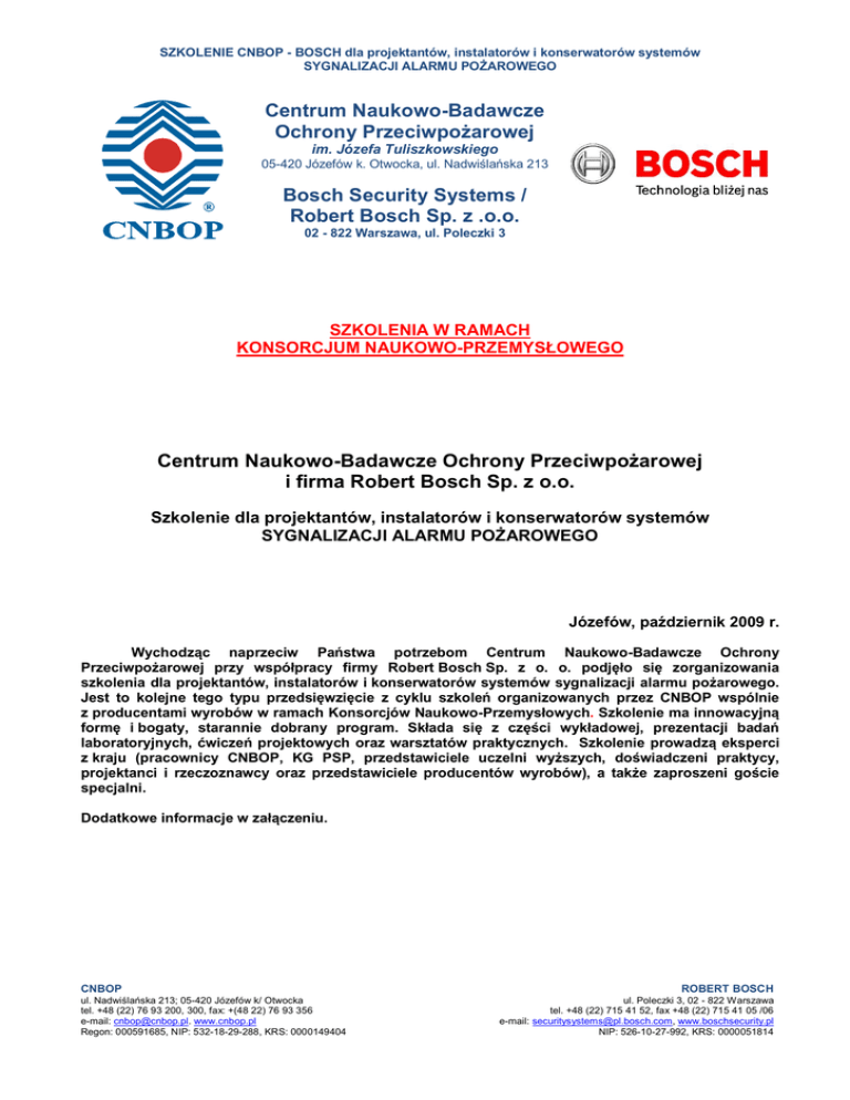 SZKOLENIE CNBOP - BOSCH dla projektantów, instalatorów i konserwatorów systemów SYGNALIZACJI ALARMU POŻAROWEGO Centrum Naukowo-Badawcze Ochrony Przeciwpożarowej im. Józefa Tuliszkowskiego 05-420 Józefów k. Otwocka, ul. Nadwiślańska 213 Bosch Security Systems / Robert Bosch Sp. z .o.o. 02 - 822 Warszawa, ul. Poleczki 3 SZKOLENIA W RAMACH KONSORCJUM NAUKOWO-PRZEMYSŁOWEGO Centrum Naukowo-Badawcze Ochrony Przeciwpożarowej i firma Robert Bosch Sp. z o.o. Szkolenie dla projektantów, instalatorów i konserwatorów systemów SYGNALIZACJI ALARMU POŻAROWEGO Józefów, październik 2009 r. Wychodząc naprzeciw Państwa potrzebom Centrum Naukowo-Badawcze Ochrony Przeciwpożarowej przy współpracy firmy Robert Bosch Sp. z o. o. podjęło się zorganizowania szkolenia dla projektantów, instalatorów i konserwatorów systemów sygnalizacji alarmu pożarowego. Jest to kolejne tego typu przedsięwzięcie z cyklu szkoleń organizowanych przez CNBOP wspólnie z producentami wyrobów w ramach Konsorcjów Naukowo-Przemysłowych. Szkolenie ma innowacyjną formę i bogaty, starannie dobrany program. Składa się z części wykładowej, prezentacji badań laboratoryjnych, ćwiczeń projektowych oraz warsztatów praktycznych. Szkolenie prowadzą eksperci z kraju (pracownicy CNBOP, KG PSP, przedstawiciele uczelni wyższych, doświadczeni praktycy, projektanci i rzeczoznawcy oraz przedstawiciele producentów wyrobów), a także zaproszeni goście specjalni. Dodatkowe informacje w załączeniu. CNBOP ul. Nadwiślańska 213; 05-420 Józefów k/ Otwocka tel. +48 (22) 76 93 200, 300, fax: +(48 22) 76 93 356 e-mail: [email protected]. www.cnbop.pl Regon: 000591685, NIP: 532-18-29-288, KRS: 0000149404 ROBERT BOSCH ul. Poleczki 3, 02 - 822 Warszawa tel. +48 (22) 715 41 52, fax +48 (22) 715 41 05 /06 e-mail: [email protected], www.boschsecurity.pl NIP: 526-10-27-992, KRS: 0000051814 SZKOLENIE CNBOP - BOSCH dla projektantów, instalatorów i konserwatorów systemów SYGNALIZACJI ALARMU POŻAROWEGO TERMIN SZKOLENIA: Szkolenie SAP dla projektantów, instalatorów i konserwatorów systemów SYGNALIZACJI ALARMU POŻAROWEGO 19-21 października 2009 MIEJSCE SZKOLENIA: Centrum Naukowo-Badawcze Ochrony Przeciwpożarowej im. Józefa Tuliszkowskiego 05-420 Józefów k. Otwocka, ul. Nadwiślańska 213 CNBOP i firma BOSCH zapraszają do udziału, liczba miejsc ograniczona. Celem skorzystania z naszej oferty prosimy odesłać wypełniony formularz zgłoszenia udziału w szkoleniu SAP (w załączeniu) na numer faks CNBOP +48 22 76 93 356 i wpłacić należność w wysokości 2000 zł brutto na konto: Bank Zachodni WBK I O/Otwock 78 1090 1753 0000 0001 0130 3937 Kod SWIFT: WBKPPLPP wpisując w tytule przelewu hasło „Szkolenie CNBOP-BOSCH SAP” O wpisaniu na listę uczestników szkolenia decyduje kolejność wpłat. Termin nadsyłania zgłoszeń: 25 września 2009. W załączeniu przekazujemy formularz zgłoszenia udziału w szkoleniu SAP. Jeśli jesteście Państwo zainteresowani otrzymaniem FAKTURY – prosimy wypełnić niezbędne dane do jej wystawienia. Uczestnikom szkolenia proponujemy możliwość płatnego oddzielnie zakwaterowania i pełnego wyżywienia w hotelach w pobliżu CNBOP: W odległości około 8 km od CNBOP w Hotelu Wiktoria (średni standard) – kontakt strona http://www.zumi.pl/1772868,Hotel_Wiktoria,Wiazowna,firma.html W odległości około 2 km od CNBOP w Ośrodku Konferencyjnym GDDKIA (średni standard) – szczegóły strona www.ta.pl/gddkia.htm. W odległości około 3 km od CNBOP hotel Holiday Inn (wysoki standard) – szczegóły strona http://holiday.aquila.pl/ W przypadku większej ilości osób organizujemy transport CNBOP ul. Nadwiślańska 213; 05-420 Józefów k/ Otwocka tel. +48 (22) 76 93 200, 300, fax: +(48 22) 76 93 356 e-mail: [email protected]. www.cnbop.pl Regon: 000591685, NIP: 532-18-29-288, KRS: 0000149404 ROBERT BOSCH ul. Poleczki 3, 02 - 822 Warszawa tel. +48 (22) 715 41 52, fax +48 (22) 715 41 05 /06 e-mail: [email protected], www.boschsecurity.pl NIP: 526-10-27-992, KRS: 0000051814