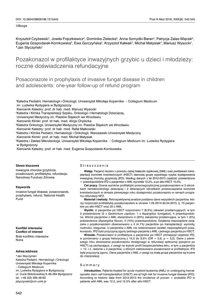 DOI: 10.5604/08606196.1215443 Post N Med 2016; XXIX(8): 542-545 ©Borgis Krzysztof Czyżewski1, Jowita Frączkiewicz2, Dominika Zielecka3, Anna Szmydki-Baran4, Patrycja Zalas-Więcek5, Eugenia Gospodarek-Komkowska5, Ewa Gorczyńska2, Krzysztof Kałwak2, Michał Matysiak4, Mariusz Wysocki1, *Jan Styczyński1 Pozakonazol w profilaktyce inwazyjnych grzybic u dzieci i młodzieży: roczne doświadczenia refundacyjne Posaconazole in prophylaxis of invasive fungal disease in children and adolescents: one-year follow-up of refund program 1 Katedra Pediatrii, Hematologii i Onkologii, Uniwersytet Mikołaja Kopernika – Collegium Medicum im. Ludwika Rydygiera w Bydgoszczy Kierownik Katedry: prof. dr hab. med. Mariusz Wysocki 2 Katedra i Klinika Transplantacji Szpiku, Onkologii i Hematologii Dziecięcej, Uniwersytet Medyczny im. Piastów Śląskich we Wrocławiu Kierownik Kliniki: prof. dr hab. med. Alicja Chybicka 3 Katedra Onkologii, Uniwersytet Medyczny im. Piastów Śląskich we Wrocławiu Kierownik Katedry: prof. dr hab. med. Rafał Matkowski 4 Katedra i Klinika Pediatrii, Hematologii i Onkologii, Warszawski Uniwersytet Medyczny Kierownik Kliniki: prof. dr hab. med. Michał Matysiak 5 Katedra i Zakład Mikrobiologii, Uniwersytet Mikołaja Kopernika – Collegium Medicum im. Ludwika Rydygiera w Bydgoszczy Kierownik Katedry: prof. dr hab. med. Eugenia Gospodarek-Komkowska Słowa kluczowe Streszczenie inwazyjna choroba grzybicza, pozakonazol, profilaktyka, refundacja, Narodowy Fundusz Zdrowia Wstęp. Pacjenci leczeni z powodu ostrej białaczki szpikowej (AML) oraz poddawani transplantacji komórek krwiotwórczych (HSCT) stanowią grupę wysokiego ryzyka występowania inwazyjnej choroby grzybiczej (IFD). Według danych z lat 2012-2013 częstość potwierdzone + prawdopodobne IFD u pacjentów z AML wynosiła 12,2%, a po allo-HSCT 15,5%. Cel pracy. Ocena wyników profilaktyki przeciwgrzybicznej pozakonazolem w 3 ośrodkach hematoonkologii dziecięcej i 2 dziecięcych ośrodkach przeszczepiania komórek krwiotwórczych w okresie pierwszego roku dostępności pozakonazolu w ramach programu refundacji NFZ. Materiał i metody. Retrospektywnej analizie poddano dane wszystkich pacjentów, którzy rozpoczęli profilaktykę pozakonazolem w okresie 1.05.2014-30.04.2015, tj. 73 pacjentów po allo-HSCT oraz 20 z AML. Wyniki. U pacjentów po HSCT rozpoznano 7 (9,5%) zakażeń przełamujących, w tym 3 potwierdzone (2 x Geotrichum capitum, 1 x Aspergillus fumigatus), 4 prawdopodobne. Wśród pacjentów z AML stwierdzono 4 (20%) zakażenia przełamujące, w tym 1 (5%) potwierdzone (Aspergillus flavus), 3 (15%) prawdopodobne. Działania niepożądane związane z pozakonazolem obserwowano u 3 (4,1%) pacjentów po transplantacji: wymioty, nudności, biegunka. U pacjentów z AML nie obserwowano działań niepożądanych pozakonazolu. IFD było przyczyną zgonu jednego pacjenta z AML i jednego pacjenta po HSCT. Wnioski. Pozakonazol w profilaktyce u pacjentów po HSCT zmniejszył częstość IFD, w porównaniu z grupą historyczną z 15,5 do 9,5% (OR = 0,6; p = 0,2). Dane z pierwszego roku stosowania pozakonazolu dostępnego w refundacji aptecznej (pacjenci po HSCT) są zachęcające, z uwagi na wysoki profil bezpieczeństwa leku, w tym u pacjentów < 12. r.ż. Jedynie u 2 pacjentów, u których zastosowano pozakonazol w profilaktyce, IFD była przyczyną zgonu. Dane pacjentów z AML z uwagi na małą grupę pacjentów są trudne do interpretacji. Keywords invasive fungal disease, posaconazole, prophylaxis, refund, National Health Fund Konflikt interesów Conflict of interest Brak konfliktu interesów None Adres/address: *Jan Styczyński Katedra Pediatrii, Hematologii i Onkologii Uniwersytet Mikołaja Kopernika – Collegium Medicum im. Ludwika Rydygiera w Bydgoszczy ul. Curie-Skłodowskiej 9, 85-094 Bydgoszcz tel. +48 (52) 585-48-60 [email protected] 542 Summary Introduction. Patients treated for acute myeloid leukemia (AML) or undergoing hematopoietic stem cell transplantation (HSCT) are at high risk for invasive fungal disease (IFD). According to historic data from 2012-2013 the incidence of proven + probable IFD in patients with AML was 12.2, and 15.5% after allo-HSCT. Pozakonazol w profilaktyce inwazyjnych grzybic u dzieci i młodzieży: roczne doświadczenia refundacyjne Aim. Analysis of results of antifungal prophylaxis program with posaconazole in children in 3 hematooncology and 2 HSCT centers during a one-year period of prophylaxis refund program by National Health Fund. Material and methods. Retrospective analysis of all consecutive 73 allo-HSCT and 20 AML children on prophylaxis with posaconazole between 1.05.2014-30.04.2015. Results. In children after allo-HSCT, 7 (9.5%) breakthrough infections including 3 proven (2 x Geotrichum capitum, 1 x Aspergillus fumigatus), and 4 probable IFD were diagnosed, while among AML patients, 4 (20%) breakthrough infections, including 1 (5%) proven (Aspergillus flavus), and 3 (15%) probable IFD. Adverse events related to posaconazole administration were reported in 3 (4.1%) HSCT patients: vomiting, nausea, diarrhoea. No adverse events were reported in AML patients. IFD was the cause of death in one AML and one allo-HSCT patient, respectively. Conclusions. In comparison to historic group, posaconazole used in prophylaxis in allo-HSCT patients reduced incidence of IFD from 15.5 to 9.5% (OR = 0.6; p = 0.2). Data from the first year of the refund program are optimistic, showing good efficacy and good tolerability of the drug, also in children under 12 years. Only in 2 patients on posaconazole prophylaxis, IFD contributed to the death. Data on AML patients are preliminary due to low recruitment. WSTĘP Pacjenci leczeni z powodu ostrej białaczki szpikowej (AML) oraz poddawani transplantacji komórek krwiotwórczych (HSCT) stanowią grupę wysokiego ryzyka występowania inwazyjnej choroby grzybiczej (ang. invasive fungal disease – IFD). Według danych obejmujących epidemiologi