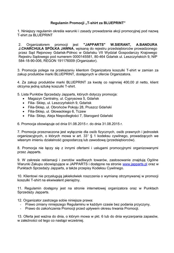 Regulamin Promocji „T-shirt za BLUEPRINT” 1. Niniejszy regulamin określa warunki i zasady prowadzenia akcji promocyjnej pod nazwą T-shirt za BLUEPRINT 2. Organizatorem promocji jest "JAPPARTS" W.SIERANT, A.BANDURA J.CHARCHUŁA SPÓŁKA JAWNA, wpisaną do rejestru przedsiębiorców prowadzonego przez Sąd Rejonowy Gdańsk-Północ w Gdańsku VII Wydział Gospodarczy Krajowego Rejestru Sądowego pod numerem 0000145581, 80-464 Gdańsk ul. Leszczyńskich 9, NIP 584-18-90-006, REGON 191176009 (Organizator). 3. Promocja polega na przekazaniu klientom Organizatora koszulki T-shirt w zamian za zakup produktów marki BLUEPRINT, dostępnych w ofercie Organizatora. 4. Za zakup produktów marki BLUEPRINT za kwotę co najmniej 400,00 zł netto, klient otrzyma jedną sztukę koszulki T-shirt. 5. Lista Punktów Sprzedaży Japparts, których dotyczy promocja: Magazyn Centralny, ul. Cyprysowa 5, Gdańsk Filia- Sklep, ul. Leszczyńskich 9, Gdańsk Filia-Sklep, ul. Obrońców Pokoju 28, Pruszcz Gdański Filia-Sklep, ul. Głowackiego 6, Tczew Filia- Sklep, Aleja Niepodległości 7, Starogard Gdański 6. Promocja obowiązuje od dnia 01.08.2015 r. do dnia 31.08.2015 r. 7. Promocja przeznaczona jest wyłącznie dla osób fizycznych, osób prawnych i jednostek organizacyjnych, o których mowa w art. 33 1 § 1 kodeksu cywilnego, prowadzących we własnym imieniu działalność gospodarczą lub zawodową (przedsiębiorców). 8. Promocja nie łączy się z innymi ofertami i usługami promocyjnymi organizowanymi przez Japparts. 9. W zakresie reklamacji i zwrotów wadliwych towarów, zastosowanie znajdują Ogólne Warunki Zakupu obowiązujące w JAPPARTS i dostępne na stronie www.japparts.pl oraz w Punktach Sprzedaży Japparts, a także przepisy Kodeksu Cywilnego. 10. Klientowi nie przysługują jakiekolwiek roszczenia o wymianę otrzymywanej w promocji koszulki T-shirt na ekwiwalent pieniężny. 11. Regulamin dostępny jest na stronie internetowej organizatora oraz w Punktach Sprzedaży Japparts. 12. Organizator zastrzega sobie niniejsze prawa: - Prawo zmiany niniejszego Regulaminu w każdym czasie bez podania przyczyny, - Prawo do zakończenia Promocji przed upływem okresu trwania Promocji. 13. Oferta jest ważna do dnia, o którym mowa w pkt. 6 lub do dnia wyczerpania zapasów, w zależności od tego co nastąpi wcześniej.