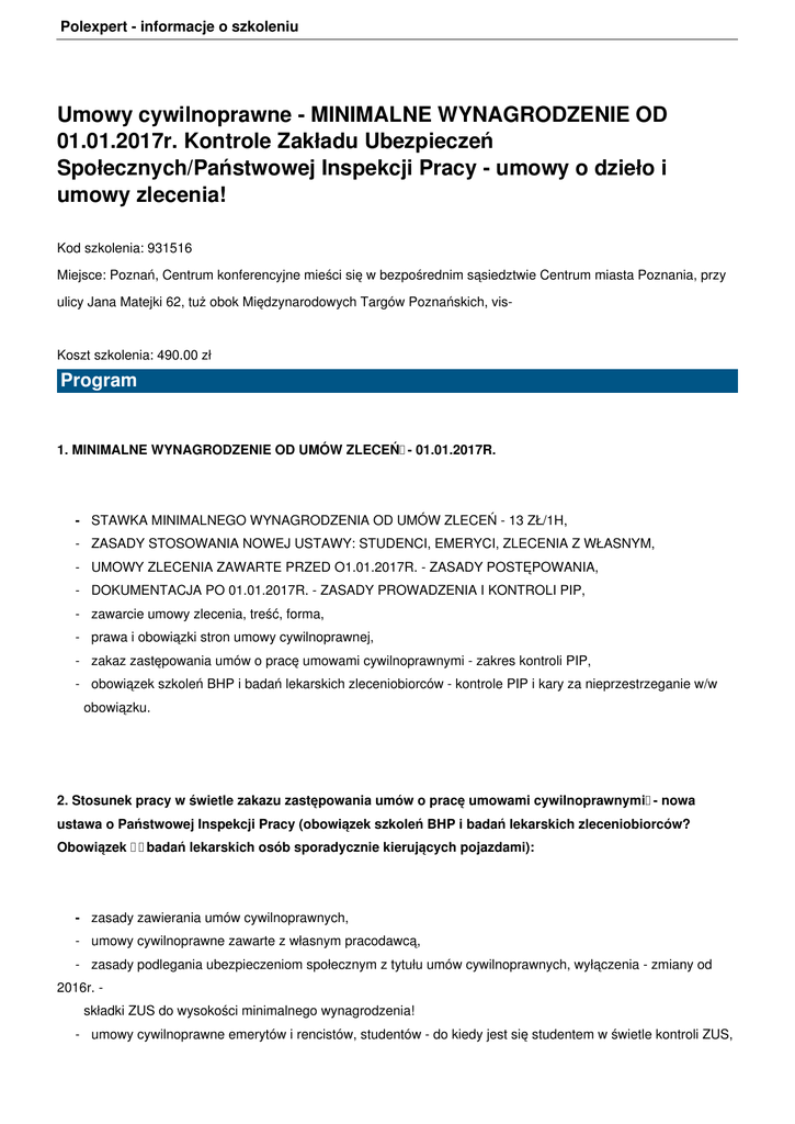 Polexpert - informacje o szkoleniu Umowy cywilnoprawne - MINIMALNE WYNAGRODZENIE OD 01.01.2017r. Kontrole Zakładu Ubezpieczeń Społecznych/Państwowej Inspekcji Pracy - umowy o dzieło i umowy zlecenia! Kod szkolenia: 931516 Miejsce: Poznań, Centrum konferencyjne mieści się w bezpośrednim sąsiedztwie Centrum miasta Poznania, przy ulicy Jana Matejki 62, tuż obok Międzynarodowych Targów Poznańskich, visKoszt szkolenia: 490.00 zł Program 1. MINIMALNE WYNAGRODZENIE OD UMÓW ZLECEŃ - 01.01.2017R. - STAWKA MINIMALNEGO WYNAGRODZENIA OD UMÓW ZLECEŃ - 13 ZŁ/1H, - ZASADY STOSOWANIA NOWEJ USTAWY: STUDENCI, EMERYCI, ZLECENIA Z WŁASNYM, - UMOWY ZLECENIA ZAWARTE PRZED O1.01.2017R. - ZASADY POSTĘPOWANIA, - DOKUMENTACJA PO 01.01.2017R. - ZASADY PROWADZENIA I KONTROLI PIP, - zawarcie umowy zlecenia, treść, forma, - prawa i obowiązki stron umowy cywilnoprawnej, - zakaz zastępowania umów o pracę umowami cywilnoprawnymi - zakres kontroli PIP, - obowiązek szkoleń BHP i badań lekarskich zleceniobiorców - kontrole PIP i kary za nieprzestrzeganie w/w obowiązku. 2. Stosunek pracy w świetle zakazu zastępowania umów o pracę umowami cywilnoprawnymi - nowa ustawa o Państwowej Inspekcji Pracy (obowiązek szkoleń BHP i badań lekarskich zleceniobiorców? Obowiązek badań lekarskich osób sporadycznie kierujących pojazdami): - zasady zawierania umów cywilnoprawnych, - umowy cywilnoprawne zawarte z własnym pracodawcą, - zasady podlegania ubezpieczeniom społecznym z tytułu umów cywilnoprawnych, wyłączenia - zmiany od 2016r. składki ZUS do wysokości minimalnego wynagrodzenia! - umowy cywilnoprawne emerytów i rencistów, studentów - do kiedy jest się studentem w świetle kontroli ZUS, Polexpert - informacje o szkoleniu - umowy cywilnoprawne jako jedyny tytuł do ubezpieczeń społecznych, - podstawa wymiaru składek na ubezpieczenia społeczne z tytułu umowy o pracę i umów cywilnoprawnych. 3. ZUS KONTROLUJE UMOWY O DZIEŁO - SKŁADKI I ODSETKI OD DZIEŁ PO KONTROLI ZUS! - zasady zawierania umów o dzieło, - prawa i obowiązki stron w/w umowy, - odebranie dzieła - jako obowiązek zamawiającego, - zasady wystawiania rachunków i dokonywania rozliczeń z tytułu umowy o dzieło. 4. System ubezpieczeń społecznych po 01.01.1999 roku - składki na ubezpieczenia społeczne i ubezpieczenie zdrowotne z tytułu umów cywilnoprawnych w 2016/2017r.: - reforma systemu ubezpieczeń społecznych, - omówienie poszczególnych tytułów do ubezpieczeń społecznych - ze szczególnym uwzględnieniem umowy zlecenia, - rodzaje ubezpieczeń społecznych, - stopa procentowa składek na ubezpieczenia społeczne, - zasady finansowania składek na ubezpieczenia społeczne z tytułu umów cywilnoprawnych, - podstawa wymiaru i terminy opłacania składek Prowadzący