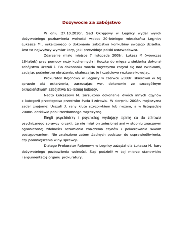 Dożywocie za zabójstwo W dniu 27.10.2010r. Sąd Okręgowy w Legnicy wydał wyrok dożywotniego pozbawienia wolności wobec 20-letniego mieszkańca Legnicy Łukasza M., oskarżonego o dokonanie zabójstwa konkubiny swojego dziadka. Jest to najwyższy wymiar kary, jaki przewiduje polski ustawodawca. Zdarzenie miało miejsce 7 listopada 2008r. Łukasz M (wówczas 18-latek) przy pomocy noży kuchennych i tłuczka do mięsa z siekierką dokonał zabójstwa Urszuli J. Po dokonaniu mordu mężczyzna znęcał się nad zwłokami, zadając pośmiertne obrażenia, okaleczając je i częściowo rozkawałkowując. Prokurator Rejonowy w Legnicy w czerwcu 2009r. skierował w tej sprawie akt oskarżenia, zarzucając ww. dokonanie ze szczególnym okrucieństwem zabójstwa 51-letniej kobiety. Nadto Łukaszowi M. zarzucono dokonanie dwóch innych czynów z kategorii przestępstw przeciwko życiu i zdrowiu. W sierpniu 2008r. mężczyzna zadał znajomej Urszuli J. rany kłute scyzorykiem lub nożem, a w listopadzie 2008r. dotkliwie pobił bezdomnego mężczyznę. Biegli psychiatrzy i psycholog wydający opinię co do zdrowia psychicznego sprawcy orzekli, że nie miał on zniesionej ani w stopniu znacznym ograniczonej zdolności rozumienia znaczenia czynów i pokierowania swoim postępowaniem. Nie znaleziono zatem żadnych podstaw do usprawiedliwienia, czy pomniejszenia winy sprawcy. Dlatego Prokurator Rejonowy w Legnicy zażądał dla Łukasza M. kary dożywotniego pozbawienia wolności. Sąd podzielił w tej mierze stanowisko i argumentację organu prokuratury.
