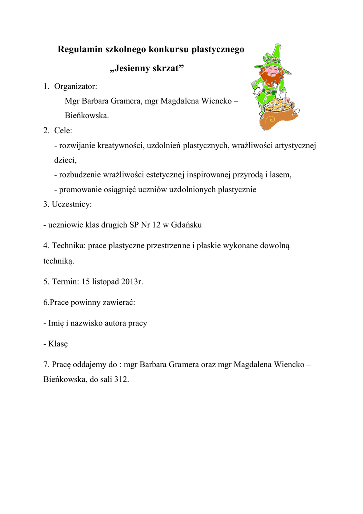 Regulamin szkolnego konkursu plastycznego „Jesienny skrzat” 1. Organizator: Mgr Barbara Gramera, mgr Magdalena Wiencko – Bieńkowska. 2. Cele: - rozwijanie kreatywności, uzdolnień plastycznych, wrażliwości artystycznej dzieci, - rozbudzenie wrażliwości estetycznej inspirowanej przyrodą i lasem, - promowanie osiągnięć uczniów uzdolnionych plastycznie 3. Uczestnicy: - uczniowie klas drugich SP Nr 12 w Gdańsku 4. Technika: prace plastyczne przestrzenne i płaskie wykonane dowolną techniką. 5. Termin: 15 listopad 2013r. 6.Prace powinny zawierać: - Imię i nazwisko autora pracy - Klasę 7. Pracę oddajemy do : mgr Barbara Gramera oraz mgr Magdalena Wiencko – Bieńkowska, do sali 312.