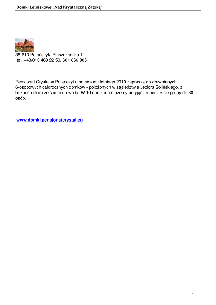 Domki Letniskowe „Nad Krystaliczną Zatoką” 38-610 Polańczyk, Bieszczadzka 11 tel. +48/013 469 22 50, 601 866 905 Pensjonat Crystal w Polańczyku od sezonu letniego 2010 zaprasza do drewnianych 6-osobowych całorocznych domków - położonych w sąsiedztwie Jeziora Solińskiego, z bezpośrednim zejściem do wody. W 10 domkach możemy przyjąć jednocześnie grupy do 60 osób. www.domki.pensjonatcrystal.eu 1/1