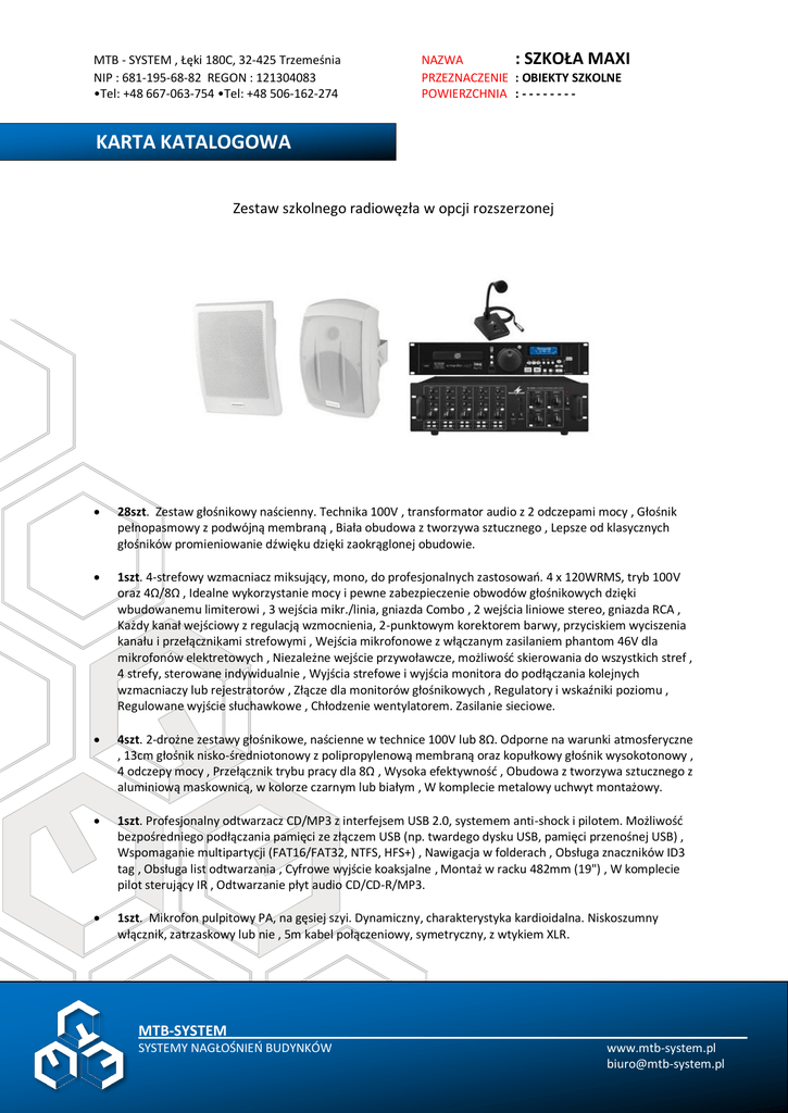 MTB - SYSTEM , Łęki 180C, 32-425 Trzemeśnia NIP : 681-195-68-82 REGON : 121304083 •Tel: +48 667-063-754 •Tel: +48 506-162-274 NAZWA : SZKOŁA MAXI PRZEZNACZENIE : OBIEKTY SZKOLNE POWIERZCHNIA : - - - - - - - - KARTA KATALOGOWA Zestaw szkolnego radiowęzła w opcji rozszerzonej 28szt. Zestaw głośnikowy naścienny. Technika 100V , transformator audio z 2 odczepami mocy , Głośnik pełnopasmowy z podwójną membraną , Biała obudowa z tworzywa sztucznego , Lepsze od klasycznych głośników promieniowanie dźwięku dzięki zaokrąglonej obudowie. 1szt. 4-strefowy wzmacniacz miksujący, mono, do profesjonalnych zastosowań. 4 x 120WRMS, tryb 100V oraz 4Ω/8Ω , Idealne wykorzystanie mocy i pewne zabezpieczenie obwodów głośnikowych dzięki wbudowanemu limiterowi , 3 wejścia mikr./linia, gniazda Combo , 2 wejścia liniowe stereo, gniazda RCA , Każdy kanał wejściowy z regulacją wzmocnienia, 2-punktowym korektorem barwy, przyciskiem wyciszenia kanału i przełącznikami strefowymi , Wejścia mikrofonowe z włączanym zasilaniem phantom 46V dla mikrofonów elektretowych , Niezależne wejście przywoławcze, możliwość skierowania do wszystkich stref , 4 strefy, sterowane indywidualnie , Wyjścia strefowe i wyjścia monitora do podłączania kolejnych wzmacniaczy lub rejestratorów , Złącze dla monitorów głośnikowych , Regulatory i wskaźniki poziomu , Regulowane wyjście słuchawkowe , Chłodzenie wentylatorem. Zasilanie sieciowe. 4szt. 2-drożne zestawy głośnikowe, naścienne w technice 100V lub 8Ω. Odporne na warunki atmosferyczne , 13cm głośnik nisko-średniotonowy z polipropylenową membraną oraz kopułkowy głośnik wysokotonowy , 4 odczepy mocy , Przełącznik trybu pracy dla 8Ω , Wysoka efektywność , Obudowa z tworzywa sztucznego z aluminiową maskownicą, w kolorze czarnym lub białym , W komplecie metalowy uchwyt montażowy. 1szt. Profesjonalny odtwarzacz CD/MP3 z interfejsem USB 2.0, systemem anti-shock i pilotem. Możliwość bezpośredniego podłączania pamięci ze złączem USB (np. twardego dysku USB, pamięci przenośnej USB) , Wspomaganie multipartycji (FAT16/FAT32, NTFS, HFS+) , Nawigacja w folderach , Obsługa znaczników ID3 tag , Obsługa list odtwarzania , Cyfrowe wyjście koaksjalne , Montaż w racku 482mm (19") , W komplecie pilot sterujący IR , Odtwarzanie płyt audio CD/CD-R/MP3. 1szt. Mikrofon pulpitowy PA, na gęsiej szyi. Dynamiczny, charakterystyka kardioidalna. Niskoszumny włącznik, zatrzaskowy lub nie , 5m kabel połączeniowy, symetryczny, z wtykiem XLR. MTB-SYSTEM SYSTEMY NAGŁOŚNIEŃ BUDYNKÓW www.mtb-system.pl [email protected]