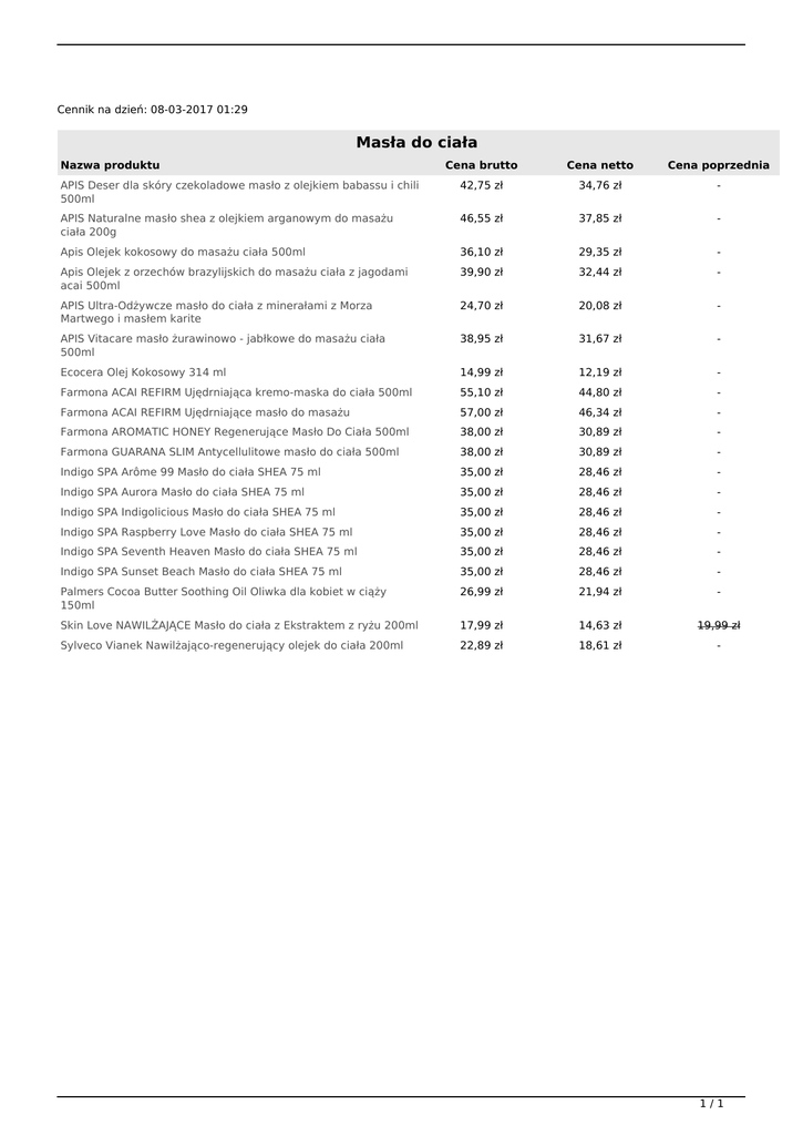 Cennik na dzień: 08-03-2017 01:29 Masła do ciała Nazwa produktu Cena brutto Cena netto Cena poprzednia APIS Deser dla skóry czekoladowe masło z olejkiem babassu i chili 500ml 42,75 zł 34,76 zł - APIS Naturalne masło shea z olejkiem arganowym do masażu ciała 200g 46,55 zł 37,85 zł - Apis Olejek kokosowy do masażu ciała 500ml 36,10 zł 29,35 zł - Apis Olejek z orzechów brazylijskich do masażu ciała z jagodami acai 500ml 39,90 zł 32,44 zł - APIS Ultra-Odżywcze masło do ciała z minerałami z Morza Martwego i masłem karite 24,70 zł 20,08 zł - APIS Vitacare masło żurawinowo - jabłkowe do masażu ciała 500ml 38,95 zł 31,67 zł - Ecocera Olej Kokosowy 314 ml 14,99 zł 12,19 zł - Farmona ACAI REFIRM Ujędrniająca kremo-maska do ciała 500ml 55,10 zł 44,80 zł - Farmona ACAI REFIRM Ujędrniające masło do masażu 57,00 zł 46,34 zł - Farmona AROMATIC HONEY Regenerujące Masło Do Ciała 500ml 38,00 zł 30,89 zł - Farmona GUARANA SLIM Antycellulitowe masło do ciała 500ml 38,00 zł 30,89 zł - Indigo SPA Arôme 99 Masło do ciała SHEA 75 ml 35,00 zł 28,46 zł - Indigo SPA Aurora Masło do ciała SHEA 75 ml 35,00 zł 28,46 zł - Indigo SPA Indigolicious Masło do ciała SHEA 75 ml 35,00 zł 28,46 zł - Indigo SPA Raspberry Love Masło do ciała SHEA 75 ml 35,00 zł 28,46 zł - Indigo SPA Seventh Heaven Masło do ciała SHEA 75 ml 35,00 zł 28,46 zł - Indigo SPA Sunset Beach Masło do ciała SHEA 75 ml 35,00 zł 28,46 zł - Palmers Cocoa Butter Soothing Oil Oliwka dla kobiet w ciąży 150ml 26,99 zł 21,94 zł - Skin Love NAWILŻAJĄCE Masło do ciała z Ekstraktem z ryżu 200ml 17,99 zł 14,63 zł 19,99 zł Sylveco Vianek Nawilżająco-regenerujący olejek do ciała 200ml 22,89 zł 18,61 zł - 1/1 Powered by TCPDF (www.tcpdf.org)