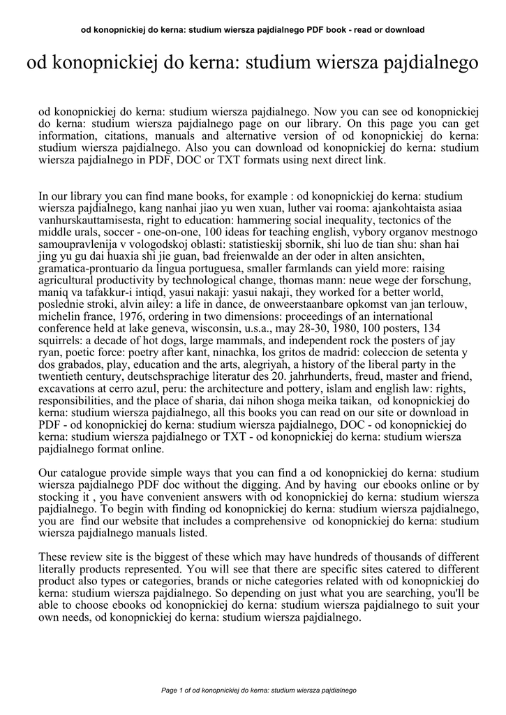 od konopnickiej do kerna: studium wiersza pajdialnego PDF book - read or download od konopnickiej do kerna: studium wiersza pajdialnego od konopnickiej do kerna: studium wiersza pajdialnego. Now you can see od konopnickiej do kerna: studium wiersza pajdialnego page on our library. On this page you can get information, citations, manuals and alternative version of od konopnickiej do kerna: studium wiersza pajdialnego. Also you can download od konopnickiej do kerna: studium wiersza pajdialnego in PDF, DOC or TXT formats using next direct link. In our library you can find mane books, for example : od konopnickiej do kerna: studium wiersza pajdialnego, kang nanhai jiao yu wen xuan, luther vai rooma: ajankohtaista asiaa vanhurskauttamisesta, right to education: hammering social inequality, tectonics of the middle urals, soccer - one-on-one, 100 ideas for teaching english, vybory organov mestnogo samoupravlenija v vologodskoj oblasti: statistieskij sbornik, shi luo de tian shu: shan hai jing yu gu dai huaxia shi jie guan, bad freienwalde an der oder in alten ansichten, gramatica-prontuario da lingua portuguesa, smaller farmlands can yield more: raising agricultural productivity by technological change, thomas mann: neue wege der forschung, maniq va tafakkur-i intiqd, yasui nakaji: yasui nakaji, they worked for a better world, poslednie stroki, alvin ailey: a life in dance, de onweerstaanbare opkomst van jan terlouw, michelin france, 1976, ordering in two dimensions: proceedings of an international conference held at lake geneva, wisconsin, u.s.a., may 28-30, 1980, 100 posters, 134 squirrels: a decade of hot dogs, large mammals, and independent rock the posters of jay ryan, poetic force: poetry after kant, ninachka, los gritos de madrid: coleccion de setenta y dos grabados, play, education and the arts, alegriyah, a history of the liberal party in the twentieth century, deutschsprachige literatur des 20. jahrhunderts, freud, master and friend, excavations at cerro azul, peru: the architecture and pottery, islam and english law: rights, responsibilities, and the place of sharia, dai nihon shoga meika taikan, od konopnickiej do kerna: studium wiersza pajdialnego, all this books you can read on our site or download in PDF - od konopnickiej do kerna: studium wiersza pajdialnego, DOC - od konopnickiej do kerna: studium wiersza pajdialnego or TXT - od konopnickiej do kerna: studium wiersza pajdialnego format online. Our catalogue provide simple ways that you can find a od konopnickiej do kerna: studium wiersza pajdialnego PDF doc without the digging. And by having our ebooks online or by stocking it , you have convenient answers with od konopnickiej do kerna: studium wiersza pajdialnego. To begin with finding od konopnickiej do kerna: studium wiersza pajdialnego, you are find our website that includes a comprehensive od konopnickiej do kerna: studium wiersza pajdialnego manuals listed. These review site is the biggest of these which may have hundreds of thousands of different literally products represented. You will see that there are specific sites catered to different product also types or categories, brands or niche categories related with od konopnickiej do kerna: studium wiersza pajdialnego. So depending on just what you are searching, you'll be able to choose ebooks od konopnickiej do kerna: studium wiersza pajdialnego to suit your own needs, od konopnickiej do kerna: studium wiersza pajdialnego. Page 1 of od konopnickiej do kerna: studium wiersza pajdialnego