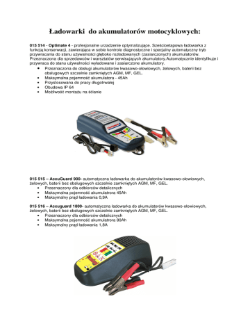 Ładowarki do akumulatorów motocyklowych: 015 514 - Optimate 4 - profesjonalne urzadzenie optymalizujące. Sześcioetapowa ładowarka z funkcją konserwacji, zawierająca w sobie kontrole diagnostyczne i specjalny automatyczny tryb przywracania do stanu używalności głęboko rozładowanych (zasiarczonych) akumulatorów. Przeznaczona dla sprzedawców i warsztatów serwisujących akumulatory.Automatycznie identyfikuje i przywraca do stanu używalności wyładowane i zasiarczone akumulatory. • Przeznaczona do obsługi akumulatorów kwasowo-ołowiowych, żelowych, baterii bez obsługowych szczelnie zamkniętych AGM, MF, GEL. • Maksymalna pojemność akumulatora - 45Ah • Przystosowana do pracy długotrwałej • Obudowa IP 64 • Możliwość montażu na śćianie 015 515 – AccuGuard 900- automatyczna ładowarka do akumulatorów kwasowo-ołowiowych, żelowych, baterii bez obsługowych szczelnie zamkniętych AGM, MF, GEL. • Przeznaczony dla odbiorców detalicznych • Maksymalna pojemność akumulatrora 45Ah • Maksymalny prąd ładowania 0,9A 015 516 – Accuguard 1800- automatyczna ładowarka do akumulatorów kwasowo-ołowiowych, żelowych, baterii bez obsługowych szczelnie zamkniętych AGM, MF, GEL. • Przeznaczony dla odbiorców detalicznych • Maksymalna pojemność akumulatrora 80Ah • Maksymalny prąd ładowania 1,8A
