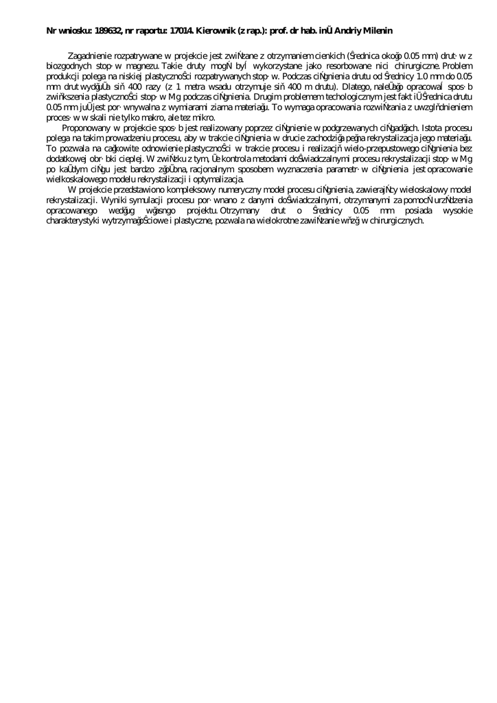 Nr wniosku: 189632, nr raportu: 17014. Kierownik (z rap.): prof. dr