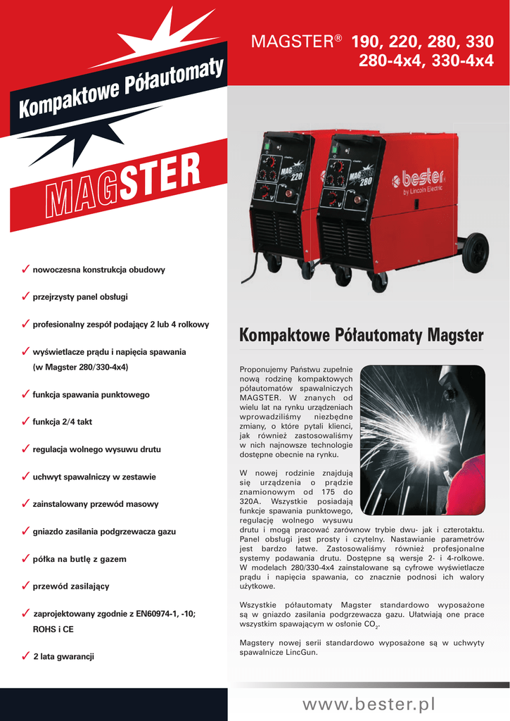 y t a m o t au ł ó P e w o t k a p Kom MAGSTER® 190, 220, 280, 330 280-4x4, 330-4x4 R E T S Y B B O H ✓ nowoczesna konstrukcja obudowy ✓ przejrzysty panel obsługi ✓ profesionalny zespół podający 2 lub 4 rolkowy ✓ wyświetlacze prądu i napięcia spawania (w Magster 280/330-4x4) ✓ funkcja spawania punktowego ✓ funkcja 2/4 takt ✓ regulacja wolnego wysuwu drutu ✓ uchwyt spawalniczy w zestawie ✓ zainstalowany przewód masowy ✓ gniazdo zasilania podgrzewacza gazu ✓ półka na butlę z gazem ✓ przewód zasilający ✓ zaprojektowany zgodnie z EN60974-1, -10; ROHS i CE ✓ 2 lata gwarancji Kompaktowe Półautomaty Magster Proponujemy Państwu zupełnie nową rodzinę kompaktowych półautomatów spawalniczych MAGSTER. W znanych od wielu lat na rynku urządzeniach wprowadziliśmy niezbędne zmiany, o które pytali klienci, jak również zastosowaliśmy w nich najnowsze technologie dostępne obecnie na rynku. W nowej rodzinie znajdują się urządzenia o prądzie znamionowym od 175 do 320A. Wszystkie posiadają funkcje spawania punktowego, regulację wolnego wysuwu drutu i mogą pracować zarównow trybie dwu- jak i czterotaktu. Panel obsługi jest prosty i czytelny. Nastawianie parametrów jest bardzo łatwe. Zastosowaliśmy również profesjonalne systemy podawania drutu. Dostępne są wersje 2- i 4-rolkowe. W modelach 280/330-4x4 zainstalowane są cyfrowe wyświetlacze prądu i napięcia spawania, co znacznie podnosi ich walory użytkowe. Wszystkie półautomaty Magster standardowo wyposażone są w gniazdo zasilania podgrzewacza gazu. Ułatwiają one prace wszystkim spawającym w osłonie CO2. Magstery nowej serii standardowo wyposażone są w uchwyty spawalnicze LincGun. www.bester.pl y t a m o t au ł ó P e w o t k a p Kom R E T S Y B B O H DANE TECHNICZNE Zasilanie, 50Hz MAGSTER 190 MAGSTER 220 MAGSTER 280 MAGSTER 280 4x4 MAGSTER 330 MAGSTER 330 4x4 3 x 400V 3 x 400V 3 x 400V 3 x 400V 3 x 400V 3 x 400V Prąd spaw. w cyklu pracy (40ºC) 175A@35% 200A@35% 250A@35% 250A@35% 300A@35% 300A@35% Zakres prądu spawania 25A/15,5V180A/22V 30A/15,5V215A/23V Podajnik 2 rolki/30mm 2 rolki/30mm 2 rolki/30mm 4 rolki/30mm 2 rolki/30mm 4 rolki/30mm 35A/15,5V270A/25V 35A/15,5V270A/25V 35A/15,5V320A/27,5V 35A/15,5V320A/27,5V Spaw. punktowe, 2/4 takt, reg. wolnego końca drutu TAK TAK TAK TAK TAK TAK Ilość stopni reg. napięcia 10 10 10 10 20 20 Klasa izolacji obudowy/ transformatora IP21/H IP21/H IP21/H IP21/H IP21/H IP21/H 70 72 80 80 80 80 0,8/1,0 0,8/1,0 0,8/1,0 0,8/1,0 1,0/1,2 1,0/1,2 Masa (kg) Rolki podające w zestawie Uchwyt spawalniczy (gniazdo EURO) LG 150G/3m LG 250G / 3m LG 240G/3m LG 240G/3m LG 260G/3m LG 260G/3m Przewód masowy zainstalowany / 3m Wąż doprowadzający gaz zainstalowany / 2m Przewód zasilający zainstalowany / 3m Gniazdo zasilania podgrzewacza gazu TAK TAK TAK TAK TAK TAK Wyświetlacze A/V - - - TAK - TAK 5 4-rolkowy zespół podający 4 3 2 1. gniazdo EURO 2. wyświetlacz napięcia spawania 3. wyświetlacz prądu spawania 4. syganlizacja przeciążenia 6 5. włącznik główny 7 6. regulacja prędkości podawania drutu 8 1 9 7. regulacja czasu spawania punktowego 8. regulacja długości wolnego końca drutu 9. przełącznik napięcia spawania Lincoln Electric Bester SA 58-263 Bielawa ul. Jana III Sobieskiego 19A tel. (0 74) 64 61 100 fax (0 74) 64 61 080 2-rolkowy zespół podający www.bester.pl LEB 2008/01/1