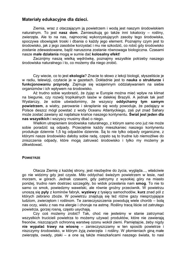 Materiały edukacyjne dla dzieci. Ziemia, wraz z otaczającym ją powietrzem i wodą jest naszym środowiskiem naturalnym. To jest nasz dom. Zamieszkują go takŜe inni lokatorzy – rośliny, zwierzęta. Ale to na nas, najmocniej wykorzystujących zasoby tego środowiska, spoczywa obowiązek troski i dbania o kaŜdy jego element. Poznajmy czym jest to środowisko, jak z jego zasobów korzystać i mu nie szkodzić, co robić gdy środowisko zostanie zdewastowane, bądź naruszona zostanie równowaga biologiczna. Czasami nasze małe działania mogą w sumie dać kolosalny efekt! Zacznijmy naszą wielką wędrówkę, poznajmy wszystkie potrzeby naszego środowiska naturalnego i to, co moŜemy dla niego zrobić. Czy wiecie, co to jest ekologia? Znacie to słowo z lekcji biologii, słyszeliście je w radiu, telewizji, czytacie je w gazetach. Dokładnie jest to nauka o strukturze i funkcjonowaniu przyrody. Zajmuje się wzajemnym oddziaływaniem na siebie organizmów i ich wpływem na środowisko. AŜ trudno sobie wyobrazić, Ŝe Ŝyjąc w Europie moŜna mieć wpływ na klimat na biegunie, czy rozwój tropikalnych lasów w dalekiej Brazylii. A jednak tak jest! Wystarczy, Ŝe sobie uświadomimy, Ŝe wszyscy oddychamy tym samym powietrzem, a wiatry, parowanie i skraplanie się wody powoduje, Ŝe padający w Polsce deszcz mógł powstać z wody Oceanu Atlantyckiego, zaś pył znad Sahary moŜe zostać zawiany aŜ najdalsze krańce naszego kontynentu. Świat jest jeden dla nas wszystkich i wszyscy musimy dbać o niego. Wielkim utrapieniem środowiska naturalnego, z którym samo ono juŜ nie moŜe sobie poradzić są odpady. Przeciętnie kaŜdy mieszkaniec naszego kontynentu produkuje dziennie 1,5 kg odpadów dziennie. Są to nie tylko odpady organiczne, z którymi nasze środowisko dałoby sobie radę, często są to trudne lub niemoŜliwe do zniszczenia odpady, które mogą zatruwać środowisko i tylko my moŜemy je zlikwidować. POWIETRZE Otacza Ziemię z kaŜdej strony, jest niezbędne do Ŝycia, wygląda..., właściwie go nie widzimy gdy jest czyste. Miło oddychać świeŜym powietrzem w lesie, nad morzem, w górach. Jednak czasami, gdy patrzymy z wysokiej góry na miasto poniŜej, trudno nam dostrzec szczegóły, bo widok przesłania nam smog. To nie to samo co smok, powiedzmy wawelski, ale równie groźny przeciwnik. W powietrzu unoszą się pyły z kominów fabryk, wyziewy z tysięcy samochodów, kurz znad pól z których zebrano zboŜe. W powietrzu znajdują się teŜ róŜne gazy niesprzyjające ludziom, zwierzętom i roślinom. Te zanieczyszczenia powodują wiele chorób – bolą nas oczy, wielu z nas ma alergie i choruje na astmę. Rośliny tracą liście od zatrutego powietrza, gorzej rosną, często usychają. Czy coś moŜemy zrobić? Tak, choć nie jesteśmy w stanie zatrzymać wszystkich trucicieli powietrza to moŜemy uŜywać produktów, które nie zawierają freonów, niszczących ochronną warstwę ozonu wokół ziemi. Pamiętajcie, Ŝeby nigdy nie wypalać trawy na wiosnę – zanieczyszczamy w ten sposób powietrze i niszczymy środowisko, w którym Ŝyją zwierzęta i rośliny. W płomieniach giną małe zwierzęta, owady, ptaki – a one są takŜe mieszkańcami naszego świata, to nasi sąsiedzi! Palenie śmieci z ogrodów teŜ bardzo zanieczyszcza powietrze, pamiętajmy, Ŝe wśród palonych odpadów mogą być resztki chemicznych substancji, które przy spalaniu wydzielają trujące opary! WODA ChociaŜ zajmuje trzy czwarte powierzchni Ziemi i wydaje się, Ŝe nie da się jej zanieczyścić jest inaczej. Tylko mały procent światowych zasobów wody nadaje się bezpośrednio do spoŜycia, a woda jest niezbędna do Ŝycia dla wszystkich mieszkańców Ziemi. Do naturalnych zbiorników wody wpływają ścieki wytwarzane przez człowieka i zanieczyszczenia powstające w naturalny sposób na Ziemi. Starajmy się, aby tych zanieczyszczeń powstających w wyniku działalności człowieka było jak najmniej. Czy widzieliście tzw. kwitnące sinice? Brzegi morza, jezior i rzek czasami pokrywa gęsta „zupa” glonów. Ten proces spowodowany jest nasyceniem wód spływającymi ściekami z miast i wsi a takŜe wypłukiwaniem z pól nadmiaru nawozów sztucznych. W wodach wzbogaconych w ten sposób w składniki pokarmowe gwałtownie rozwijają się glony i zarastają wielkie obszary przy brzegach. Powoduje to odbieranie tlenu rybom i roślinom Ŝyjącym w niŜszych częściach zbiorników wodnych i moŜe prowadzić do wielkich zniszczeń. To jest efekt niekontrolowanej działalności człowieka. Wielkie obszary naszego globu cierpią z powodu braku wody zdatnej do picia. Nie mają jej rośliny i zwierzęta, nie mają jej ludzie. W poszukiwaniu wody tysiące ludzi wędruje w cierpieniu. Czy myślicie o tym myjąc codziennie zęby? A tak łatwo ograniczyć zuŜycie wody – zakręcaj kran, gdy tylko skończysz mycie lub gdy szorujesz zęby. Woda w szklaneczce wystarczy do wypłukania ust! Równie dobrze umyjesz ciało pod prysznicem co i w kąpieli, a nawet moŜesz to zrobić szybciej i przyjemniej. Nie zanieczyszczaj wody wyrzucając do niej śmieci i odpady chemiczne. Sprawdzaj, czy kran jest dobrze dokręcony i nie kapie – w ten sposób moŜna stracić codziennie nawet kilkadziesiąt litrów wody. ODPADY Produkujemy je codziennie. Przeczytana gazeta, torebka po zakupach, ogryzek jabłka, stary telewizor. RóŜne rodzaje odpadów zmuszają do róŜnych sposobów postępowania z nimi. NajwaŜniejsza rzecz jaka kaŜdy z nas moŜe robić to segregacja śmieci. Podzielenie śmieci i wrzucenie ich do odpowiednio oznaczonych pojemników pozwoli odzyskać materiał z jakiego zostały zrobione lub przerobić je na surowce do ponownego wykorzystania. Pojemniki oznaczone są odpowiednimi kolorami – tego trzeba się nauczyć! Pamiętaj, zawsze moŜesz po raz kolejny uŜyć ekologicznej torby na zakupy, kupić produkty w opakowaniu, którego będzie moŜna ponownie uŜyć, stosować rze