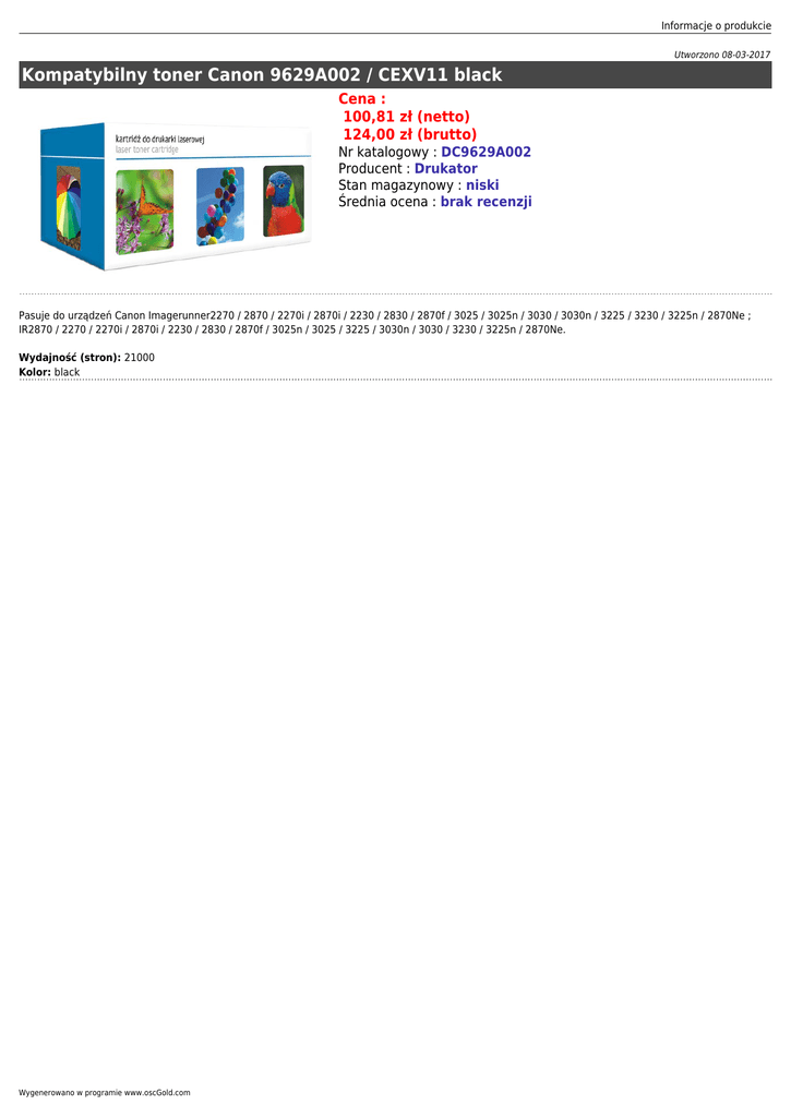 Informacje o produkcie Utworzono 08-03-2017 Kompatybilny toner Canon 9629A002 / CEXV11 black Cena : 100,81 zł (netto) 124,00 zł (brutto) Nr katalogowy : DC9629A002 Producent : Drukator Stan magazynowy : niski Średnia ocena : brak recenzji Pasuje do urządzeń Canon Imagerunner2270 / 2870 / 2270i / 2870i / 2230 / 2830 / 2870f / 3025 / 3025n / 3030 / 3030n / 3225 / 3230 / 3225n / 2870Ne ; IR2870 / 2270 / 2270i / 2870i / 2230 / 2830 / 2870f / 3025n / 3025 / 3225 / 3030n / 3030 / 3230 / 3225n / 2870Ne. Wydajność (stron): 21000 Kolor: black Wygenerowano w programie www.oscGold.com
