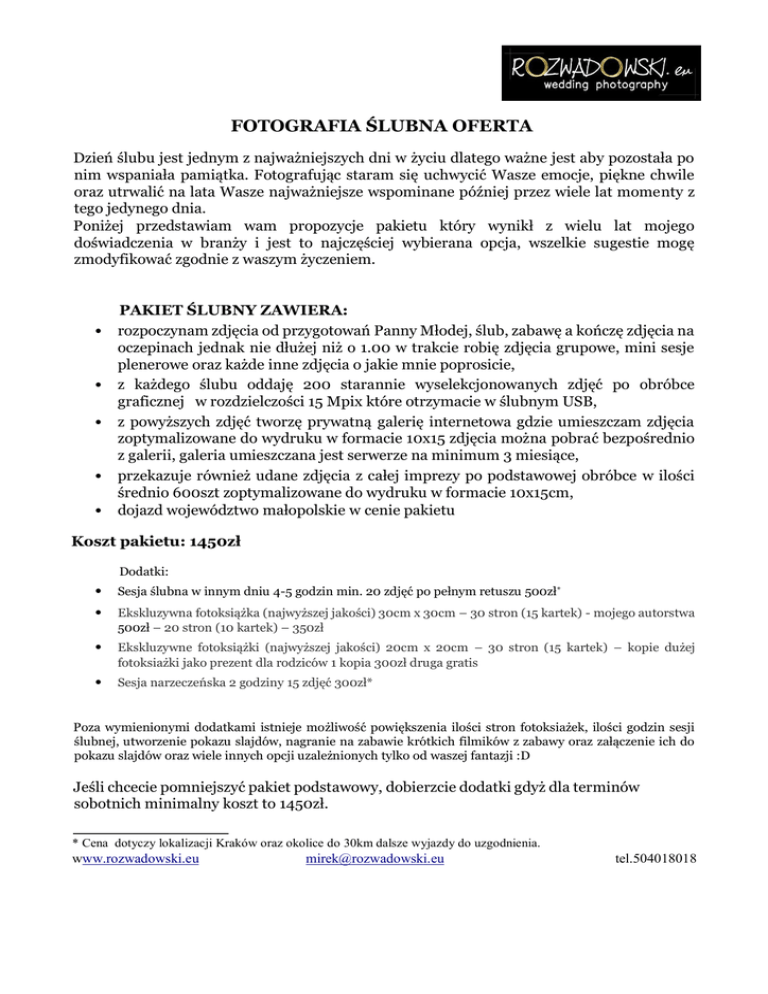 FOTOGRAFIA ŚLUBNA OFERTA Dzień ślubu jest jednym z najważniejszych dni w życiu dlatego ważne jest aby pozostała po nim wspaniała pamiątka. Fotografując staram się uchwycić Wasze emocje, piękne chwile oraz utrwalić na lata Wasze najważniejsze wspominane później przez wiele lat momenty z tego jedynego dnia. Poniżej przedstawiam wam propozycje pakietu który wynikł z wielu lat mojego doświadczenia w branży i jest to najczęściej wybierana opcja, wszelkie sugestie mogę zmodyfikować zgodnie z waszym życzeniem. • • • • • PAKIET ŚLUBNY ZAWIERA: rozpoczynam zdjęcia od przygotowań Panny Młodej, ślub, zabawę a kończę zdjęcia na oczepinach jednak nie dłużej niż o 1.00 w trakcie robię zdjęcia grupowe, mini sesje plenerowe oraz każde inne zdjęcia o jakie mnie poprosicie, z każdego ślubu oddaję 200 starannie wyselekcjonowanych zdjęć po obróbce graficznej w rozdzielczości 15 Mpix które otrzymacie w ślubnym USB, z powyższych zdjęć tworzę prywatną galerię internetowa gdzie umieszczam zdjęcia zoptymalizowane do wydruku w formacie 10x15 zdjęcia można pobrać bezpośrednio z galerii, galeria umieszczana jest serwerze na minimum 3 miesiące, przekazuje również udane zdjęcia z całej imprezy po podstawowej obróbce w ilości średnio 600szt zoptymalizowane do wydruku w formacie 10x15cm, dojazd województwo małopolskie w cenie pakietu Koszt pakietu: 1450zł Dodatki: • • Sesja ślubna w innym dniu 4-5 godzin min. 20 zdjęć po pełnym retuszu 500zł* • Ekskluzywne fotoksiążki (najwyższej jakości) 20cm x 20cm – 30 stron (15 kartek) – kopie dużej fotoksiażki jako prezent dla rodziców 1 kopia 300zł druga gratis • Sesja narzeczeńska 2 godziny 15 zdjęć 300zł* Ekskluzywna fotoksiążka (najwyższej jakości) 30cm x 30cm – 30 stron (15 kartek) - mojego autorstwa 500zł – 20 stron (10 kartek) – 350zł Poza wymienionymi dodatkami istnieje możliwość powiększenia ilości stron fotoksiażek, ilości godzin sesji ślubnej, utworzenie pokazu slajdów, nagranie na zabawie krótkich filmików z zabawy oraz załączenie ich do pokazu slajdów oraz wiele innych opcji uzależnionych tylko od waszej fantazji :D Jeśli chcecie pomniejszyć pakiet podstawowy, dobierzcie dodatki gdyż dla terminów sobotnich minimalny koszt to 1450zł. * Cena dotyczy lokalizacji Kraków oraz okolice do 30km dalsze wyjazdy do uzgodnienia. www.rozwadowski.eu [email protected] tel.504018018