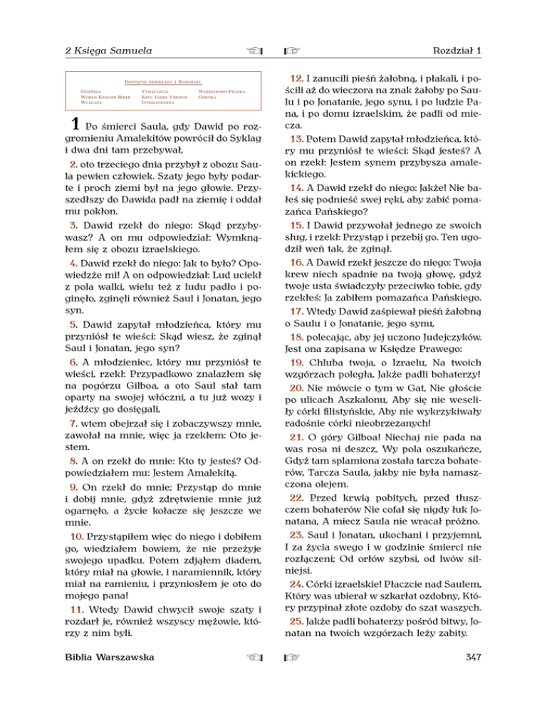2 Księga Samuela L R Dostępne przekłady 1 Rozdziału *W-2sm1* Tysiąclecia Warszawsko-Praska King James Version Grecka Interlinearna Gdańska World English Bible Wulgata 1 Po śmierci Saula, gdy Dawid po rozgromieniu Amalekitów powrócił do Syklag i dwa dni tam przebywał, 2. oto trzeciego dnia przybył z obozu Saula pewien człowiek. Szaty jego były podarte i proch ziemi był na jego głowie. Przyszedłszy do Dawida padł na ziemię i oddał mu pokłon. Rozdział 1 12. I zanucili pieśń żałobną, i płakali, i pościli aż do wieczora na znak żałoby po Saulu i po Jonatanie, jego synu, i po ludzie Pana, i po domu izraelskim, że padli od miecza. 13. Potem Dawid zapytał młodzieńca, który mu przyniósł te wieści: Skąd jesteś? A on rzekł: Jestem synem przybysza amalekickiego. 14. A Dawid rzekł do niego: Jakże! Nie bałeś się podnieść swej ręki, aby zabić pomazańca Pańskiego? 3. Dawid rzekł do niego: Skąd przybywasz? A on mu odpowiedział: Wymknąłem się z obozu izraelskiego. 15. I Dawid przywołał jednego ze swoich sług, i rzekł: Przystąp i przebij go. Ten ugodził weń tak, że zginął. 4. Dawid rzekł do niego: Jak to było? Opowiedzże mi! A on odpowiedział: Lud uciekł z pola walki, wielu też z ludu padło i poginęło, zginęli również Saul i Jonatan, jego syn. 16. A Dawid rzekł jeszcze do niego: Twoja krew niech spadnie na twoją głowę, gdyż twoje usta świadczyły przeciwko tobie, gdy rzekłeś: Ja zabiłem pomazańca Pańskiego. 5. Dawid zapytał młodzieńca, który mu przyniósł te wieści: Skąd wiesz, że zginął Saul i Jonatan, jego syn? 6. A młodzieniec, który mu przyniósł te wieści, rzekł: Przypadkowo znalazłem się na pogórzu Gilboa, a oto Saul stał tam oparty na swojej włóczni, a tu już wozy i jeźdźcy go dosięgali, 7. wtem obejrzał się i zobaczywszy mnie, zawołał na mnie, więc ja rzekłem: Oto jestem. 8. A on rzekł do mnie: Kto ty jesteś? Odpowiedziałem mu: Jestem Amalekitą. 9. On rzekł do mnie; Przystąp do mnie i dobij mnie, gdyż zdrętwienie mnie już ogarnęło, a życie kołacze się jeszcze we mnie. 10. Przystąpiłem więc do niego i dobiłem go, wiedziałem bowiem, że nie przeżyje swojego upadku. Potem zdjąłem diadem, który miał na głowie, i naramiennik, który miał na ramieniu, i przyniosłem je oto do mojego pana! 11. Wtedy Dawid chwycił swoje szaty i rozdarł je, również wszyscy mężowie, którzy z nim byli. Biblia Warszawska 17. Wtedy Dawid zaśpiewał pieśń żałobną o Saulu i o Jonatanie, jego synu, 18. polecając, aby jej uczono Judejczyków. Jest ona zapisana w Księdze Prawego: 19. Chluba twoja, o Izraelu, Na twoich wzgórzach poległa, Jakże padli bohaterzy! 20. Nie mówcie o tym w Gat, Nie głoście po ulicach Aszkalonu, Aby się nie weseliły córki filistyńskie, Aby nie wykrzykiwały radośnie córki nieobrzezanych! 21. O góry Gilboa! Niechaj nie pada na was rosa ni deszcz, Wy pola oszukańcze, Gdyż tam splamiona została tarcza bohaterów, Tarcza Saula, jakby nie była namaszczona olejem. 22. Przed krwią pobitych, przed tłuszczem bohaterów Nie cofał się nigdy łuk Jonatana, A miecz Saula nie wracał próżno. 23. Saul i Jonatan, ukochani i przyjemni, I za życia swego i w godzinie śmierci nie rozłączeni; Od orłów szybsi, od lwów silniejsi. 24. Córki izraelskie! Płaczcie nad Saulem, Który was ubierał w szkarłat ozdobny, Który przypinał złote ozdoby do szat waszych. 25. Jakże padli bohaterzy pośród bitwy, Jonatan na twoich wzgórzach leży zabity. L R 347 L R Rozdział 2 26. Żal mi ciebie, bracie mój, Jonatanie, Byłeś mi bardzo miły; Miłość twoja była mi rozkoszniejsza Niż miłość kobiety. 27. Jakże padli bohaterzy, Poginęły rynsztunki bojowe. Dostępne przekłady 2 Rozdziału *W-2sm2* Tysiąclecia Warszawsko-Praska King James Version Grecka Interlinearna Gdańska World English Bible Wulgata 2 Potem pytał Dawid Pana: Czy mam ruszyć do któregoś z miast judzkich? A Pan mu odpowiedział: Ruszaj! I pytał jeszcze Dawid: Dokąd mam ruszyć? A On odrzekł: Do Hebronu. 2. I ruszył Dawid wraz z obiema swymi żonami, z Achinoam z Jezreela i Abigail, wdową po Nabalu z Karmelu, 3. również ludzi, którzy byli przy nim, sprowadził Dawid, i to wszystkich z rodzinami. I osiedlili się w osadach wokół Hebronu. 4. Wtedy przyszli mężowie z Judy i namaścili tam Dawida na króla nad plemieniem Judy. A gdy Dawidowi doniesiono, że to mężowie z Jabesz w Gileadzie pochowali Saula, 5. wysłał Dawid posłańców do mężów w Jabesz w Gileadzie i kazał im powiedzieć: Błogosławieni jesteście u Pana za to, że tę łaskawą przysługę wyświadczyliście waszemu panu, Saulowi, grzebiąc go. 6. Niech więc teraz Pan okaże wam łaskę i wierność, a również i ja świadczyć wam będę dobro, że uczyniliście tę rzecz: 7. Bądźcie więc dobrej myśli, bądźcie też mężni, gdyż zginął wprawdzie wasz pan, Saul, lecz plemię Judy namaściło mnie na króla nad sobą. 8. Lecz Abner, syn Nera, dowódca zastępu Saula, zabrał Iszboszeta, syna Saula, sprowadził go do Machanaim 9. i obwołał go królem nad Gileadem, nad Aszerem, nad Jezreelem, nad Efraimem, nad Beniaminem i nad całym Izraelem. 10. Iszboszet, syn Saula, miał czterdzieści lat, gdy został królem nad Izraelem, a 348 2 Księga Samuela królował dwa lata. Lecz plemię Judy było za Dawidem. 11. A czas panowania Dawida jako króla w Hebronie nad plemieniem Judy wynosił siedem lat i sześć miesięcy. 12. Potem Abner, syn Nera, wyruszył wraz ze sługami Iszboszeta, syna Saula, z Machanaim do Gibeonu. 13. Natomiast Joab, syn Serui, oraz słudzy Dawida wyruszyli z Hebronu i zetknęli się z sobą nad stawem gibeońskim, i zatrzymali się jedni z jednej, a drudzy z drugiej strony stawu. 14. Abner zawołał na Joaba: Niech wystąpią harcownicy i poharcują przed nami. A Joab odpowiedział: Niech wystąpią! 15. Wystąpiło więc i zostało odliczonych ze strony 