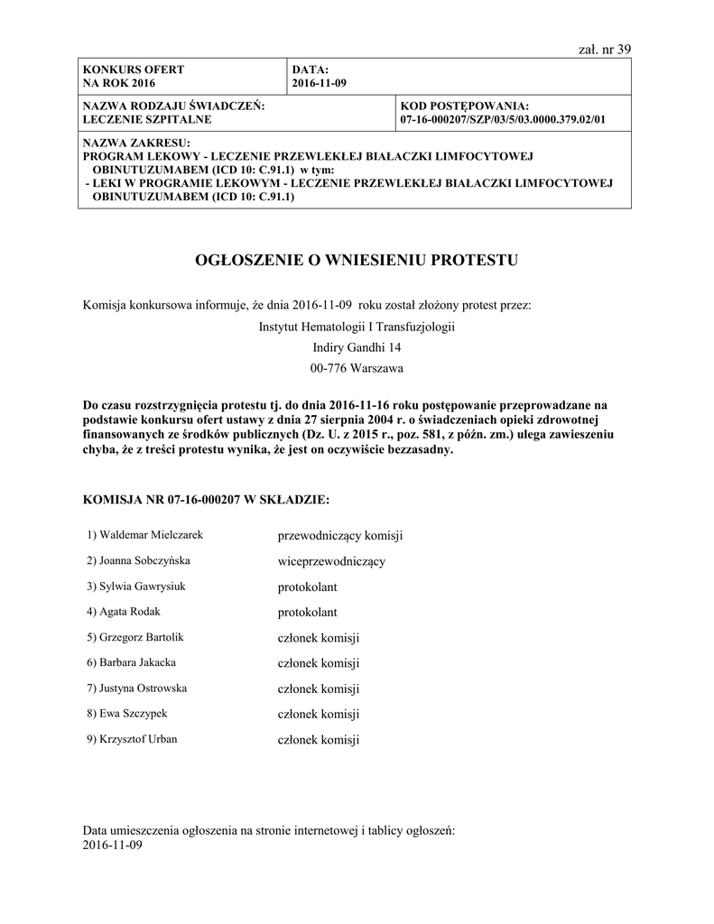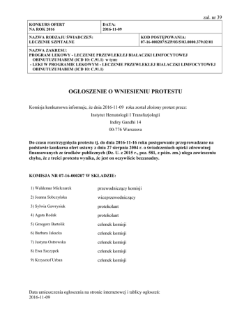 zał. nr 39 KONKURS OFERT NA ROK 2016 DATA: 2016-11-09 NAZWA RODZAJU ŚWIADCZEŃ: LECZENIE SZPITALNE KOD POSTĘPOWANIA: 07-16-000207/SZP/03/5/03.0000.379.02/01 NAZWA ZAKRESU: PROGRAM LEKOWY - LECZENIE PRZEWLEKŁEJ BIAŁACZKI LIMFOCYTOWEJ OBINUTUZUMABEM (ICD 10: C.91.1) w tym: - LEKI W PROGRAMIE LEKOWYM - LECZENIE PRZEWLEKŁEJ BIAŁACZKI LIMFOCYTOWEJ OBINUTUZUMABEM (ICD 10: C.91.1) OGŁOSZENIE O WNIESIENIU PROTESTU Komisja konkursowa informuje, że dnia 2016-11-09 roku został złożony protest przez: Instytut Hematologii I Transfuzjologii Indiry Gandhi 14 00-776 Warszawa Do czasu rozstrzygnięcia protestu tj. do dnia 2016-11-16 roku postępowanie przeprowadzane na podstawie konkursu ofert ustawy z dnia 27 sierpnia 2004 r. o świadczeniach opieki zdrowotnej finansowanych ze środków publicznych (Dz. U. z 2015 r., poz. 581, z późn. zm.) ulega zawieszeniu chyba, że z treści protestu wynika, że jest on oczywiście bezzasadny. KOMISJA NR 07-16-000207 W SKŁADZIE: 1) Waldemar Mielczarek przewodniczący komisji 2) Joanna Sobczyńska wiceprzewodniczący 3) Sylwia Gawrysiuk protokolant 4) Agata Rodak protokolant 5) Grzegorz Bartolik członek komisji 6) Barbara Jakacka członek komisji 7) Justyna Ostrowska członek komisji 8) Ewa Szczypek członek komisji 9) Krzysztof Urban członek komisji Data umieszczenia ogłoszenia na stronie internetowej i tablicy ogłoszeń: 2016-11-09