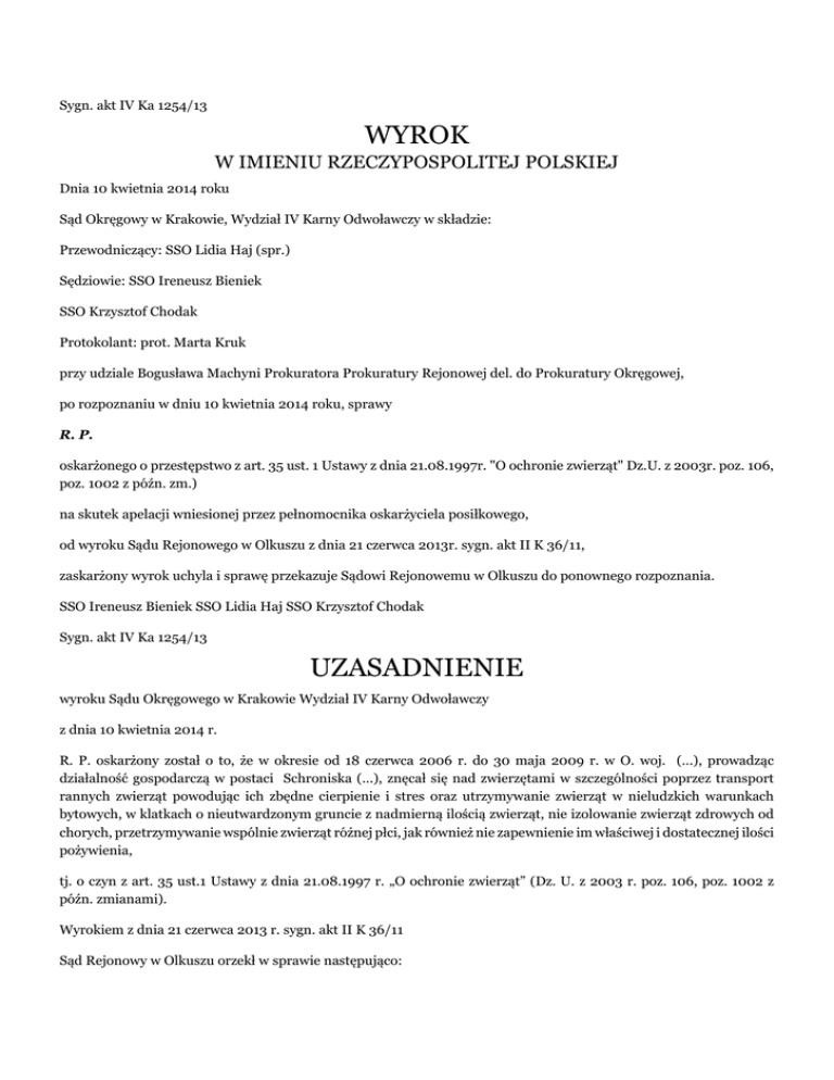 Sygn. akt IV Ka 1254/13 WYROK W IMIENIU RZECZYPOSPOLITEJ POLSKIEJ Dnia 10 kwietnia 2014 roku Sąd Okręgowy w Krakowie, Wydział IV Karny Odwoławczy w składzie: Przewodniczący: SSO Lidia Haj (spr.) Sędziowie: SSO Ireneusz Bieniek SSO Krzysztof Chodak Protokolant: prot. Marta Kruk przy udziale Bogusława Machyni Prokuratora Prokuratury Rejonowej del. do Prokuratury Okręgowej, po rozpoznaniu w dniu 10 kwietnia 2014 roku, sprawy R. P. oskarżonego o przestępstwo z art. 35 ust. 1 Ustawy z dnia 21.08.1997r. "O ochronie zwierząt" Dz.U. z 2003r. poz. 106, poz. 1002 z późn. zm.) na skutek apelacji wniesionej przez pełnomocnika oskarżyciela posiłkowego, od wyroku Sądu Rejonowego w Olkuszu z dnia 21 czerwca 2013r. sygn. akt II K 36/11, zaskarżony wyrok uchyla i sprawę przekazuje Sądowi Rejonowemu w Olkuszu do ponownego rozpoznania. SSO Ireneusz Bieniek SSO Lidia Haj SSO Krzysztof Chodak Sygn. akt IV Ka 1254/13 UZASADNIENIE wyroku Sądu Okręgowego w Krakowie Wydział IV Karny Odwoławczy z dnia 10 kwietnia 2014 r. R. P. oskarżony został o to, że w okresie od 18 czerwca 2006 r. do 30 maja 2009 r. w O. woj. (...), prowadząc działalność gospodarczą w postaci Schroniska (...), znęcał się nad zwierzętami w szczególności poprzez transport rannych zwierząt powodując ich zbędne cierpienie i stres oraz utrzymywanie zwierząt w nieludzkich warunkach bytowych, w klatkach o nieutwardzonym gruncie z nadmierną ilością zwierząt, nie izolowanie zwierząt zdrowych od chorych, przetrzymywanie wspólnie zwierząt różnej płci, jak również nie zapewnienie im właściwej i dostatecznej ilości pożywienia, tj. o czyn z art. 35 ust.1 Ustawy z dnia 21.08.1997 r. „O ochronie zwierząt” (Dz. U. z 2003 r. poz. 106, poz. 1002 z późn. zmianami). Wyrokiem z dnia 21 czerwca 2013 r. sygn. akt II K 36/11 Sąd Rejonowy w Olkuszu orzekł w sprawie następująco: 1. na mocy art. 66 § 1 kk oraz art. 67 § 1 kk warunkowo umarza postępowanie karne wobec R. P. o to, że w okresie od 18 czerwca 2006 roku do dnia 30 maja 2009 roku w O. woj. (...) prowadząc działalność gospodarczą w postaci Schroniska (...) znęcał się nad zwierzętami w ten sposób, że nie zapewnił zwierzętom systematycznej i terminowej opieki weterynaryjnej oraz utrzymywał zwierzęta w niewłaściwych warunkach bytowania poprzez utrzymywanie psów chorych, rannych razem ze zwierzętami zdrowymi tj. o czyn stanowiący przestępstwo z art. 35 ust.1 ustawy z dnia 21.08.1997 r. "o ochronie zwierząt" (j. t. Dz. U. z 2003 r., Nr 106, poz. 1002 z późn. zm.) na okres próby wynoszący 2 (dwa) lata; 2. na mocy art. 67 § 3 kk w zw. z art. 39 pkt 7 kk orzeka wobec oskarżonego środek karny w postaci świadczenia pieniężnego w kwocie 2.000,00 (dwa tysiące) złotych na rzecz Funduszu Pomocy Pokrzywdzonym oraz Pomocy Postpenitencjarnej; 3. na zasadzie art. 629 kpk w zw. z art. 627 kpk zasądza od oskarżonego R. P. na rzecz oskarżyciela posiłkowego Fundacji (...) w K. kwotę 1.200 (jeden tysiąc dwieście) złotych tytułem zwrotu poniesionych przez oskarżyciela wydatków z racji ustanowienia w sprawie pełnomocnika z wyboru; 4. na zasadzie 629 w zw. z art. 627 kpk oraz art. 7 ustawy z dnia 23 czerwca 1973 roku o opłatach w sprawach karnych (tekst jedn. Dz. U. z 1983 r., nr 49, poz. 223 ze zmianami) zasądza od oskarżonego na rzecz Skarbu Państwa koszty sądowe w kwocie 643,90 (sześćset czterdzieści trzy 90/100) złote, w tym kwotę 100 (sto) złotych tytułem opłaty. Apelację od powyższego wyroku wniósł pełnomocnik oskarżyciela posiłkowego - Fundacji (...). Zaskarżonemu wyrokowi zarzucił błąd w ustaleniach faktycznych Sądu, mający istotny wpływ na treść orzeczenia, a polegający na przyjęciu w oparciu o zebrany materiał dowodowy, iż brak jest dowodów na to, że oskarżony przetrzymywał zwierzęta w złych warunkach bytowych, w klatkach o nieutwardzonym gruncie, z nadmierną ilością zwierząt, bez segregacji zwierząt agresywnych oraz ze względu na płeć, co w efekcie doprowadziło do zmiany opisu czynu oraz polegający na przyjęciu, iż stopień winy i społecznej szkodliwości czynu nie jest znaczny, co w efekcie doprowadziło do warunkowego umorzenia postępowania. W związku z tymi zarzutami, skarżący wniósł o zmianę zaskarżonego wyroku poprzez uznanie oskarżonego za winnego popełnienia zarzucanego czynu i wymierzenie oskarżonemu stosownych kar zasadniczych, orzeczenie w stosunku do oskarżonego środków karnych w postaci zakazu prowadzenia działalności gospodarczej związanej z opieką nad zwierzętami oraz podania wyroku do publicznej wiadomości lub uchylenie wyroku i przekazanie sprawy do ponownego rozpoznania przez Sąd I Instancji. Sąd Odwoławczy zważył, co następuje; Wniesiona w sprawie apelacja o tyle na uwzględnienie zasługiwała, że wywołując kontrolę instancyjną zaskarżonego wyroku, skutkowała koniecznością jego uchylenia i przekazaniem sprawy do ponownego rozpoznania przez Sąd I instancji. Jeżeli chodzi o wniosek apelacji o skazanie oskarżonego przez Sąd odwoławczy, to abstrahując od faktu, że zebrany dotąd materiał dowodowy nie jest jednoznaczny i nie zezwala na tak stanowcze orzekanie, to w sytuacji gdy w zaskarżonym wyroku warunkowo umorzono względem oskarżonego postępowanie karne o ustalone przez Sąd Rejonowy w sentencji wyroku przestępstwo, w świetle art.454§1 kpk był on prawnie niedopuszczalny i z tego powodu nie mógł on zostać uwzględniony. Kontrola odwoławcza zaskarżonego wyroku i jego uzasadnienia prowadzi do wniosku, że pomimo jego obszerności Sąd Rejonowy nie dokonał w nim, w sposób poddający się kontroli odwoławczej jednoznacznej rekonstrukcji stanu faktycznego sprawy, w tym ustalenia warunków bytowania, w całym objętym zarzutem aktu oskarżenia okresie czasu, zwierząt znajdujących się w tym czasie w schronisku prowadzonym przez oskarżonego, zwłaszcza w kontekście konkretnych okoliczno