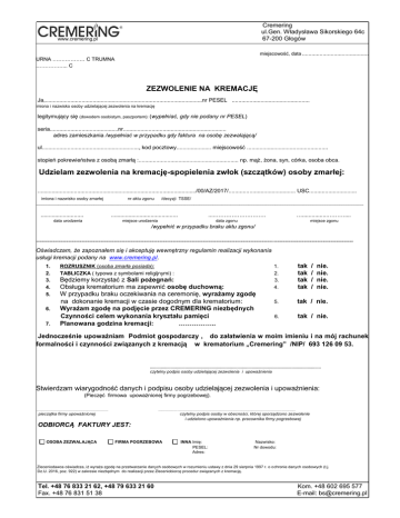 Cremering ul.Gen. Władysława Sikorskiego 64c 67-200 Głogów www.cremering.pl miejscowość, data .......................................... URNA ……………… C TRUMNA ……………... C ZEZWOLENIE NA KREMACJĘ Ja,...................................................................................................nr PESEL ................................................. imiona i nazwisko osoby udzielającej zezwolenia na kremację legitymujący się (dowodem osobistym, paszportem): (wypełniać, gdy nie podany nr PESEL) seria...........................................nr................................................................. adres zamieszkania /wypełniać w przypadku gdy faktura na osobę zezwalającą/ ul............................................................., kod pocztowy...................... miejscowość ................................................... stopień pokrewieństwa z osobą zmarłą :............................................................... np. mąż, żona, syn, córka, osoba obca. Udzielam zezwolenia na kremację-spopielenia zwłok (szczątków) osoby zmarłej: ..................................................................................................../00/AZ/2017/.......................................... USC.............................. imiona i nazwisko osoby zmarłej nr aktu zgonu /decyzji TSSE/ ----------------------------------------------------------------------------------------------------------------------------------------------------------------------------------------------------------------------------------------------------------------------------------------------------- ........................... ....……………………… .......................................... data urodzenia miejsce urodzenia …................……….... data zgonu miejsce zgonu /wypełnić w przypadku braku aktu zgonu/ ----------------------------------------------------------------------------------------------------------------------------------------------------------------------- Oświadczam, że zapoznałem się i akceptuję wewnętrzny regulamin realizacji wykonania usługi kremacji podany na www.cremering.pl. 1. 2. 3. 4. 5. 6. 7. ROZRUSZNIK (osoba zmarła posiada): TABLICZKA ( typowa z symbolami religijnymi) : Będziemy korzystać z Sali pożegnań: Obsługa krematorium ma zapewnić osobę duchowną: W przypadku braku oczekiwania na ceremonię, wyrażamy zgodę na dokonanie kremacji w czasie dogodnym dla krematorium: Wyrażam zgodę na podjęcie przez CREMERING niezbędnych Czynności celem wykonania kryształu pamięci Planowana godzina kremacji: …………….. 1. 2. 3. 4. tak tak tak tak / / / / nie. nie. nie. nie. 5. tak / nie. 6. tak / nie. Jednocześnie upoważniam Podmiot gospodarczy , do załatwienia w moim imieniu i na mój rachunek formalności i czynności związanych z kremacją w krematorium „Cremering” /NIP/ 693 126 09 53. ............................................................................................................................................. czytelny podpis osoby udzielającej zezwolenia i upoważnienia Stwierdzam wiarygodność danych i podpisu osoby udzielającej zezwolenia i upoważnienia: (Pieczęć firmowa upoważnionej firmy pogrzebowej). ...................................................................................... ...................... ............................................................................................................................................. pieczątka firmy upoważnionej czytelny podpis osoby w obecności, której sporządzono zezwolenie i udzielono upoważnienia np. pracownika firmy pogrzebowej ODBIORCĄ FAKTURY JEST: OSOBA ZEZWALAJĄCA FIRMA POGRZEBOWA INNA Imię: PESEL: Adres: Nazwisko: Nr dowodu: Zleceniodawca oświadcza, iż wyraża zgodę na przetwarzanie danych osobowych w rozumieniu ustawy z dnia 29 sierpnia 1997 r. o ochronie danych osobowych (t.j. Dz.U. 2016, poz. 922) w zakresie niezbędnym do realizacji przez Zleceniobiorcę procedur związanych z kremacją. Tel. +48 76 833 21 62, +48 79 633 21 60 Fax. +48 76 831 51 38 Kom. +48 602 695 577 E-mail: [email protected]