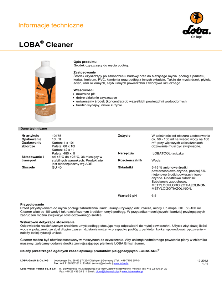 Informacje techniczne LOBA® Cleaner Opis produktu Środek czyszczący do mycia podłóg. Zastosowanie Środek czyszczący po zakończeniu budowy oraz do bieżącego mycia podłóg z parkietu, korka, linoleum, PVC, kamienia oraz podłóg z innych okładzin. Także do mycia drzwi, płytek, ścian, ram okiennych, szyb i innych powierzchni z tworzywa sztucznego. Właściwości neutralne pH dobre działanie czyszczące uniwersalny środek (koncentrat) do wszystkich powierzchni wodoodprnych bardzo wydajny, niskie zużycie Dane techniczne Nr artykułu Opakowanie Opakowanie zbiorcze Składowanie i transport Giscode 10175 10l, 1l Karton: 1 x 10l Paleta: 60 x 10l Karton: 12 x 1l Paleta: 480 x 1l od +5°C do +25°C, 36 miesięcy w stabilnych warunkach. Produkt nie jest niebezpieczny wg ADR. GU 40 Zużycie W zależności od obszaru zastosowania ok. 50 - 100 ml na wiadro wody na 100 m²; przy większych zabrudzeniach dozowanie musi być zwiększone. Narzędzia LOBATOOL łasiczka Rozcieńczalnik Woda Składniki 5-15 % anionowe środki powierzchniowo-czynne, poniżej 5% niejonowe środki powierzchniowoczynne. Dodatkowe składniki: Substancje zapachowe, METYLOCHLOROIZOTIAZOLINON, METYLOIZOTIAZOLINON. Wartość pH 6,5 Przygotowanie Przed przystąpieniem do mycia podłogi zabrudzenia i kurz usunąć używając odkurzacza, miotły lub mopa. Ok. 50-100 ml Cleaner wlać do 10l wody i tak rozcieńczonym środkiem umyć podłogę. W przypadku mocniejszych i bardziej przylegających zabrudzeń można zwiększyć ilość dozowanego środka. Wskazówki dotyczące stosowania Odpowiednio rozcieńczonym środkiem umyć podłogę stosując mop odpowiedni do mytej powierzchni. Użycie zbyt dużej ilości wody w połączeniu ze zbyt długim czasem działania może, w przypadku podłóg z parkietu i korka, spowodować pęcznienie – należy takiej sytuacji unikać. Cleaner można być również stosowany w maszynach do czyszczenia. Aby uniknąć nadmiernego powstania piany w zbiorniku maszyny, zalecamy dodanie środka zmniejszającego pienienie LOBA Entschäumer. Naleźy przestrzegać ogólnych zasad aplikacji produktów pielęgnacyjnych LOBACARE LOBA GmbH & Co. KG ® Leonberger Str. 56-62 | 71254 Ditzingen | Germany | Tel.: +49 7156 357-0 Fax: +49 7156 357-211 | E-Mail: [email protected] | www.loba.de Loba-Wakol Polska Sp. z o.o. ul. Sławęcińska 16, Macierzysz I 05-850 Ożarów Mazowiecki I Polska I tel.: +48 22 436 24 20 Fax: +48 22 436 24 21 I Email: [email protected] I www.loba-wakol.pl 12-2012 1/1