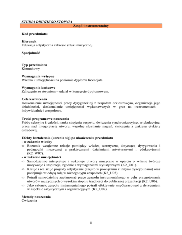 STUDIA DRUGIEGO STOPNIA Zespół instrumentalny Kod przedmiotu Kierunek Edukacja artystyczna zakresie sztuki muzycznej Specjalność Typ przedmiotu Kierunkowy Wymagania wstępne Wiedza i umiejętności na poziomie dyplomu licencjata. Wymagania końcowe Zaliczenie ze stopniem – udział w koncercie dyplomowym. Cele kształcenia Doskonalenie umiejętności pracy dyrygenckiej z zespołem orkiestrowym, organizacja jego działalności, doskonalenie umiejętności wykonawczych w grze na instrumentach – indywidualnie i zespołowo. Treści programowe nauczania Próby sekcyjne i całości, nauka strojenia zespołu, ćwiczenia synchronizacyjne, artykulacyjne, praca nad interpretacją utworu, wspólne słuchanie nagrań, ćwiczenia z zakresu etykiety estradowej. Efekty kształcenia (uczenia się) po ukończeniu przedmiotu - w zakresie wiedzy • Rozumie wzajemne relacje pomiędzy wiedzą teoretyczną dotyczącą dyrygowania i pedagogiki muzycznej a praktycznymi działaniami artystycznymi i edukacyjnymi (K2_W07). - w zakresie umiejętności • Samodzielnie interpretuje i wykonuje utwory muzyczne w oparciu o własne twórcze motywacje i inspiracje, zgodnie z wymaganiami stylistycznymi (K2_U01). • Kreuje i realizuje projekty artystyczne (często w powiązaniu z innymi dyscyplinami) oraz podejmuje wiodącą rolę w różnego typu zespołach (K2_U05). • Potrafi samodzielnie zaplanować pracę zespołu instrumentalnego w celu przygotowania utworów muzycznych o wysokim stopniu trudności do publicznej prezentacji (K2_U06). • Jako członek zespołu instrumentalnego potrafi efektywnie współpracować z dyrygentem w aspekcie artystycznym i organizacyjnym (K2_U07). Metody nauczania Ćwiczenia 1 Nakład pracy studenta potrzebny do osiągnięcia efektów uczenia się ROK SEMESTR I Punkty ECTS Ilość godzin w semestrze Rodzaj zaliczenia LEGENDA II 1 2 3 4 2 2 2 2 30 30 30 30 zs zs zs zs zal – zaliczony; zs – zaliczenie ze stopniem; egz – egzamin; ed – egzamin dyplomowy Kryteria oceny Na ocenę składają się: aktywność na próbach, zaangażowanie w pracę zespołu, efektywność pracy zaprezentowana podczas koncertu dyplomowego. Literatura (piśmiennictwo) Szaliński A., Muzykowanie zespołowe, COMUK, W-wa 1971. Dyrdał A., Amatorski zespół smyczkowy, COMUK, W-wa 1979. Muszyński H., Wychowanie moralne w zespole, PZWS, W-wa 1964. Pawelec Z., Orkiestra dęta, ŁDK, Łódź 2001. Język wykładowy Polski Imię i nazwisko wykładowcy dr hab. Barbara Sobolczyk, prof. AM mgr Elżbieta Kwiecień 2