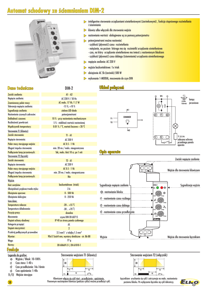 Automat schodowy ze œciemnianiem sciemnianiem DIM-2 t inteligentne sterowanie urz¹dzeniami oœwietleniowymi (¿arówkowymi) , funkcja stopniowego rozœwietlania i œciemniania t klawisz albo w³¹cznik dla sterowania wejœcia t nastawianie wartoœci obs³ugiwane s¹ za pomoc¹ potencjometru t potencjometrami mo¿na nastawiaæ: - szybkoœæ (p³ynnoœæ) czasu rozœwietlania - natê¿enie, na poziom którego ma siê rozœwietliæ urz¹dzenie oœwietleniowe - czas, na który urz¹dzenie oœwietleniowe ma œwieciæ z nastawionym blaskiem - szybkoœæ (p³ynnoœæ) czasu dobiegu (œciemnianie) urz¹dzenia oœwietleniowego t napiêcie zasilania: AC 230 V t wyjœcie bezkontaktowe: 1x triak t obci¹¿enie AC 5b (¿arówki) 500 W t wykonanie 1-MODU£, mocowanie do szyn DIN Dane techniczne Zaciski zasilania: Napiêcie zasilania: Znamionowy pobór mocy: Tolerancja napiêcia zasilania: Sygnalizacja zasilania: Nastawienie czsowych zakresów: Dok³adnoœæ czasowa: Rozbie¿noœæ powtórzeñ: Wspó³czynnik temperatury: A1 - A2 AC 230 V / 50 Hz AC maks. 17 VA / 1.7 W -15 %; +10 % zielona LED dioda potencjometrami 10 % - przy nastawianiu mechanicznym Pobór mocy steruj¹cego wejœcia: D³ugoœæ impulsu sterowania: Pod³¹czenie lamp jarzeniowych: Sterowanie T2 (³¹cznik) Zaciski sterowania: Napiêcie sterowania: Pobór mocy steruj¹cego wejœcia: D³ugoœæ impulsu sterowania: Pod³¹czenie lamp jarzeniowych: Wyjœcie Un max. 10mA T2 AC 230 V AC 0.5 - 1 VA min. 20 ms / maks. nieograniczona Tak, maks. iloœæ 10 sz. po 1 mA T1 V T2 A2 T 2.5 A zalecana ochrona przedniego panelu aparatu Opis aparatu Zaciski napiêcia zasilania T2 - A1 AC 230 V AC 0.5 - 1 VA min. 20 ms / maks. nieograniczona Nie Mocowanie: Stopieñ ochony obudowy: Kategoria przepiêæ: Stopieñ nieczystoœci: Przekrój pod³¹czanych przewodów: szyna DIN EN 60715 IP 40 ze strony panelu czo³owego Sygnalizacja napiêcia zasilania 2A 0 - 500 VA 0 - 250 VA Sygnalizacja wyjœcia DIM-2 Un - nastawianie blasku min t1 - nastawianie czasu rozbiegu max t1 min o -20 .. +55 C max t3 - nastawianie czasu dobiegu o -30 .. +70 C dowolna t3 min t2 - nastawianie czasu przed³u¿enia Wymiar: Waga: Normy: EN 60669-2-1, EN 61010-1 t1 V Klawiszem w³¹cza siê cykl start - przed³u¿enie - opóŸnienie. Ponownym naciœniêciem klawisza (podczas cyklu) mo¿na przed³u¿yæ cykl. max T2 Wejœcie dla sterowania ³¹cznikiem Sterowanie wejœciem T2 (w³¹cznik) t3 t2 max t2 min Wyjœcie Sterowanie wejœciem T1 (klawisz) T1 Wejœcie dla sterowania klawiszem A1 T1 A2 III. 2 2.5 mm2/ z tulejk¹ 1.5 mm 2 90x17.6x64 mm, wymiary detaliczne - str. 86-88 77 g 38 A1 V A2 bezkontaktowe (triak) Legenda do grafów: Wyjœcie / Blask: 10-100% t1 Czas staru: 1-40 s t2 Czas przed³u¿enia: 16s-16min t3 Czas opóŸnienia: 1-40s T1/T2 Wejœcie steruj¹ce DIMMER T1 T1 - A1 Iloœæ zestyków: Obci¹¿alnoœæ pr¹dowa trwa³a styku: Obci¹¿enie oporowe: Obci¹¿enie idukcyjne: Inne dane: Temperatura robocza: Temperatura sk³adowania: Pozycja pracy: Funkcje lampy jarzeniowe A1 5 % - stabilnoœæ wartoœci nastawionej o o 0.01 % / C, wartoœæ bazowa = 20 C Sterowanie T1 (klawisz) Zaciski sterowania: Napiêcie sterowania: Uk³ad po³¹czeñ DIM-2 t1 T2 t3 t2 £¹cznikiem uruchamia siê cykl i zatrzymuje na maks. nastawieniu poziomu blasku. Po wy³¹czeniu ³¹cznika siê cykl dokoñczy.
