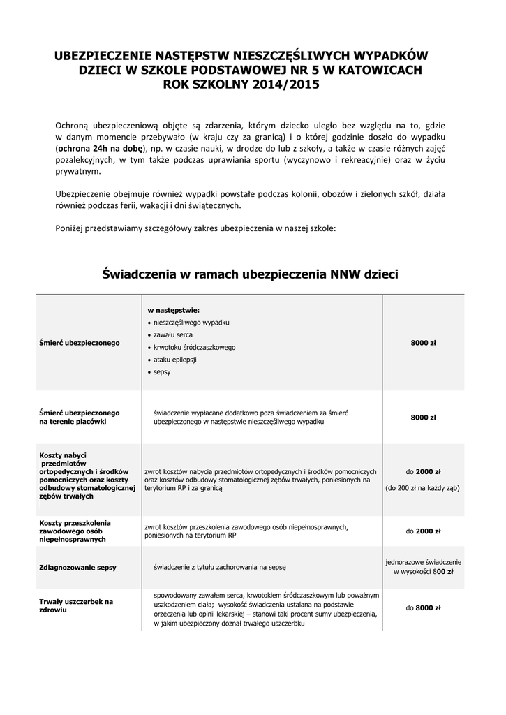 UBEZPIECZENIE NASTĘPSTW NIESZCZĘŚLIWYCH WYPADKÓW DZIECI W SZKOLE PODSTAWOWEJ NR 5 W KATOWICACH ROK SZKOLNY 2014/2015 Ochroną ubezpieczeniową objęte są zdarzenia, którym dziecko uległo bez względu na to, gdzie w danym momencie przebywało (w kraju czy za granicą) i o której godzinie doszło do wypadku (ochrona 24h na dobę), np. w czasie nauki, w drodze do lub z szkoły, a także w czasie różnych zajęć pozalekcyjnych, w tym także podczas uprawiania sportu (wyczynowo i rekreacyjnie) oraz w życiu prywatnym. Ubezpieczenie obejmuje również wypadki powstałe podczas kolonii, obozów i zielonych szkół, działa również podczas ferii, wakacji i dni świątecznych. Poniżej przedstawiamy szczegółowy zakres ubezpieczenia w naszej szkole: Świadczenia w ramach ubezpieczenia NNW dzieci w następstwie: nieszczęśliwego wypadku Śmierć ubezpieczonego zawału serca krwotoku śródczaszkowego 8000 zł ataku epilepsji sepsy Śmierć ubezpieczonego na terenie placówki Koszty nabyci przedmiotów ortopedycznych i środków pomocniczych oraz koszty odbudowy stomatologicznej zębów trwałych Koszty przeszkolenia zawodowego osób niepełnosprawnych Zdiagnozowanie sepsy Trwały uszczerbek na zdrowiu świadczenie wypłacane dodatkowo poza świadczeniem za śmierć ubezpieczonego w następstwie nieszczęśliwego wypadku zwrot kosztów nabycia przedmiotów ortopedycznych i środków pomocniczych oraz kosztów odbudowy stomatologicznej zębów trwałych, poniesionych na terytorium RP i za granicą zwrot kosztów przeszkolenia zawodowego osób niepełnosprawnych, poniesionych na terytorium RP świadczenie z tytułu zachorowania na sepsę spowodowany zawałem serca, krwotokiem śródczaszkowym lub poważnym uszkodzeniem ciała; wysokość świadczenia ustalana na podstawie orzeczenia lub opinii lekarskiej – stanowi taki procent sumy ubezpieczenia, w jakim ubezpieczony doznał trwałego uszczerbku 8000 zł do 2000 zł (do 200 zł na każdy ząb) do 2000 zł jednorazowe świadczenie w wysokości 800 zł do 8000 zł całkowita utrata wzroku w obu oczach całkowita utrata mowy porażenie lub niedowład co najmniej dwóch kończyn poniżej 3 stopnia w 6400 zł skali Lovetta śpiączka trwająca dłużej niż 30 dni całkowita utrata kończyny górnej w obrębie barku lub ramienia 6400 zł całkowita utrata kończyny dolnej w obrębie stawu biodrowego lub kości udowej 6000 zł całkowita utrata obu nerek całkowita utrata kończyny górnej w obrębie łokcia lub przedramienia całkowita utrata kończyny dolnej w obrębie stawu kolanowego, podudzia 4800 zł lub stawów skokowych całkowita utrata ręki całkowita utrata wzroku w jednym oku 4000 zł całkowita utrata słuchu w obu uszach całkowita utrata stopy całkowita utrata macicy 3200 zł całkowita utrata jednej nerki 2800 zł całkowita utrata słuchu w jednym uchu 2400 zł całkowita utrata kciuka 1760 zł całkowita utrata jajnika lub jądra całkowita utrata śledziony Trwałe uszkodzenie ciała 1600 zł całkowita utrata nosa całkowita utrata palucha całkowita utrata małżowiny usznej 1200 zł całkowita utrata palców ręki: II, III, IV, V 640 zł – za każdy palec całkowita utrata palców stopy: II, III, IV, V 240 zł – za każdy palec w przypadku utraty do 9 zębów stałych 160 zł – za każdy utracony ząb stały za wszystkie utracone zęby stałe – w przypadku utraty powyżej 9 zębów stałych złamania w obrębie kręgosłupa – dotyczy trzonów, łuków kręgów (z wyłączeniem kości ogonowej) 1600 zł 880 zł za każdy krąg złamania kości udowej niestabilne złamania miednicy 800 zł zwichnięcie stawu biodrowego złamania kości ramiennej zwichnięcie stawu barkowego 560 zł złamania w obrębie kości podudzia (jednej lub obu) złamania kości sklepienia i podstawy czaszki zwichnięcie w obrębie stawu łokciowego zwichnięcie stawu kolanowego (z wyłączeniem zwichnięcia rzepki) 400 zł złamania łopatki, obojczyka, mostka – za każdą kość stabilne złamania miednicy 360 zł zwichnięcie w stawach skokowych złamania w obrębie stopy z wyłączeniem kości palców złamania rzepki 320 zł złamania w obrębie kości przedramienia (jednej lub obu) złamania kości twarzoczaszki złamania kości ogonowej 280 zł złamania w obrębie kości ręki z wyłączeniem kości palców złamania w obrębie kciuka 240 zł zwichnięcie kciuka Trwałe uszkodzenie ciała złamania w obrębie kręgosłupa – dotyczy wyrostków poprzecznych, kolczystych kręgów – za każdy krąg złamanie w obrębie palucha 200 zł złamania w obrębie kości palców ręki: II, III, IV, V zwichnięcia stawów w obrębie palców ręki: II, III, IV, V 160 zł złamania w obrębie kości palców stopy: II, III, IV, V złamanie zęba stałego, w przypadku złamania do 9 zębów stałych za wszystkie złamane zęby stałe, w przypadku złamania powyżej 9 zębów stałych • w przypadku operacyjnego leczenia złamania lub zwichnięcia dodatkowe świadczenie w wysokości 40 zł 400 zł 160 zł oparzenie II st. – powyżej 30% powierzchni ciała oparzenie III st. – powyżej 10% powierzchni ciała 1600 zł oparzenie dróg oddechowych leczone w szpitalu Oparzenia lub odmrożenia oparzenie III st. – powyżej 5% do 10% powierzchni ciała 800 zł oparzenie II st. – powyżej 15% do 30% powierzchni ciała 560 zł odmrożenie II st. albo wyższego – więcej niż jednego palca ręki lub palca stopy oraz odmrożenie nosa lub ucha oparzenie II st. powyżej 1% do 15% powierzchni ciała 320 zł oparzenie III st. do 5% powierzchni ciała odmrożenie II st. albo wyższy – jednego palca ręki lub palca stopy oparzenie II st. do 1% powierzchni ciała Wstrząśnienia lub podejrzenia wstrząśnienia mózgu Pogryzienia, pokąsania, ukąszenia (wymagające hospitalizacji) 120 zł 2 dni hospitalizacji 80 zł 3 dni hospitalizacji 160 zł 4 dni hospitalizacji 240 zł pogryzienia przez psa pokąsania przez inne zwierzęta ukąszenia przez owad