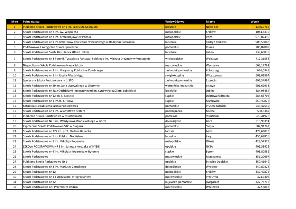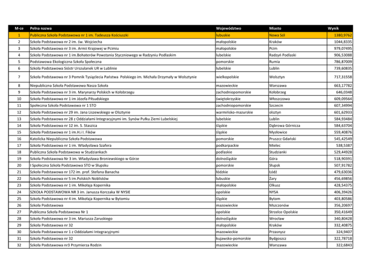M-ce Pełna nazwa Województwo Miasto 1 Publiczna Szkoła Podstawowa nr 1 im. Tadeusza Kościuszki lubuskie Nowa Sól Wynik 1380,9762 2 Szkoła Podstawowa nr 2 im. św. Wojciecha małopolskie Kraków 1044,8335 3 Szkoła Podstawowa nr 3 im. Armii Krajowej w Pcimiu małopolskie Pcim 979,07495 4 Szkoła Podstawowa nr 1 im.Bohaterów Powstania Styczniowego w Radzyniu Podlaskim lubelskie Radzyń Podlaski 906,53088 5 Podstawowa Ekologiczna Szkoła Społeczna pomorskie Rumia 786,87009 6 Szkoła Podstawowa Sióstr Urszulanek UR w Lublinie lubelskie Lublin 739,60835 7 Szkoła Podstawowa nr 3 Pomnik Tysiąclecia Państwa Polskiego im. Michała Drzymały w Wolsztynie wielkopolskie Wolsztyn 717,31558 8 Niepubliczna Szkoła Podstawowa Nasza Szkoła mazowieckie Warszawa 663,17782 9 Szkoła Podstawowa nr 3 im. Marynarzy Polskich w Kołobrzegu zachodniopomorskie Kołobrzeg 646,0348 10 Szkoła Podstawowa nr 1 im Józefa Piłsudskiego świętokrzyskie Włoszczowa 609,09564 11 Społeczna Szkoła Podstawowa nr 1 STO zachodniopomorskie Szczecin 607,34994 12 Szkoła Podstawowa nr 29 im. Jana Liszewskiego w Olsztynie warmińsko-mazurskie olsztyn 601,62933 13 Szkoła Podstawowa nr 28 z Oddziałami Integracyjnymi im. Synów Pułku Ziemi Lubelskiej lubelskie Lublin 584,93484 14 Szkoła Podstawowa nr 12 im. S. Staszica śląskie Dąbrowa Górnicza 584,63704 15 Szkoła Podstawowa nr 1 im.H.i I. Fików śląskie Mysłowice 559,40876 16 Katolicka Niepubliczna Szkoła Podstawowa pomorskie Pruszcz Gdański 545,42549 17 Szkoła Podstawowa nr 1 im. Władysława Szafera podkarpackie Mielec 18 Publiczna Szkoła Podstawowa w Studziankach podlaskie Studzianki 529,44928 19 Szkoła Podstawowa Nr 3 im. Władysława Broniewskiego w Górze dolnośląskie Góra 518,90391 20 I Społeczna Szkoła Podstawowa STO w Słupsku pomorskie Słupsk 507,91782 21 Szkoła Podstawowa nr 172 im. prof. Stefana Banacha łódzkie Łódź 479,63036 22 Szkoła Podstawowa nr 5 im.Polskich Noblistów lubuskie Żary 456,69856 23 Szkoła Podstawowa nr 1 im. Mikołaja Kopernika małopolskie Olkusz 428,54375 24 SZKOŁA PODSTAWOWA NR 3 im. Janusza Korczaka W NYSIE opolskie NYSA 406,39426 25 Szkoła Podstawowa nr 4 im. Mikołaja Kopernika w Bytomiu śląskie Bytom 403,80586 26 Szkoła Podstawowa mazowieckie Mszczonów 356,20697 27 Publiczna Szkoła Podstawowa Nr 1 opolskie Strzelce Opolskie 350,41649 28 Szkoła Podstawowa nr 3 im. Mariusza Zaruskiego dolnośląskie Wrocław 340,80428 29 Szkoła Podstawowa nr 32 małopolskie Kraków 332,40875 30 Szkoła Podstawowa nr 1 z Oddziałami Integracyjnymi mazowieckie Przasnysz 324,9407 31 Szkoła Podstawowa nr 32 kujawsko-pomorskie Bydgoszcz 322,78718 32 Szkoła Podstawowa nr3 Przymierza Rodzin mazowieckie Warszawa 322,6843 538,5387 M-ce Pełna nazwa Województwo Miasto 33 Szkoła Podstawowa Filialna w Pilchowie zachodniopomorskie Tanowo Wynik 318,85388 34 Publiczna Szkoła Podstawowa nr 3 w Brzesku im. Mikołaja Kopernika małopolskie Brzesko 317,87242 35 Publiczna Katolicka Szkoła Podstawowa mazowieckie Ząbki 312,47643 36 Szkoła Podstawowa nr 2 im. Wł. Broniewskiego lubelskie Dęblin 309,65787 37 Szkoła Podstawowa im. Marii Konopnickiej łódzkie Skierniewice 38 Szkoła Podstawowa nr 40 w Krakowie im. św Stanisława Biskupa i Męczennika małopolskie Kraków 303,62857 39 Zespół Szkolno-Przedszkolny nr 1 - Szkoła Podstawowa nr 6 łódzkie Zduńska Wola 302,82386 40 Szkoła Podstawowa nr 5 im. Księdza Jana Twardowskiego w Biłgoraju lubelskie Biłgoraj 302,52918 41 Szkoła Podstawowa nr 21 im. Królowej Jadwigi lubelskie Lublin 300,51702 42 Szkoła Podstawowa nr 68 im. Jerzego Bińczyckiego małopolskie Kraków 300,46454 43 Szkoła Podstawowa nr 3 im.J.Korczaka w Zielonce mazowieckie Zielonka 298,02887 44 Szkoła Podstawowa nr 8 z Oddziałami Integracyjnymi małopolskie Chrzanów 295,22004 45 Szkoła Podstawowa im. Mieszka I w Roczynach małopolskie Roczyny 286,91724 46 Szkoła Podstawowa nr 12 im. prof.A.Wodziczki wielkopolskie Gniezno 286,3851 47 Szkoła Podstawowa nr 126 im. Komisji Edukacji Narodowej małopolskie Kraków 284,52782 48 Szkoła Podstawowa w Krasieninie lubelskie Niemce 283,51678 49 Szkoła Podstawowa nr 42 pomorskie Gdańsk 280,0239 50 Szkoła Podstawowa nr 1 im. F. Nowowiejskiego warmińsko-mazurskie Kętrzyn 279,75997 51 Szkoła Podstawowa nr 113 w Krakowie małopolskie Kraków 267,79119 52 Publiczna Szkoła Podstawowa im. ks. Józefa Poniatowskiego w Annopolu lubelskie Annopol 267,44921 53 Szkoła Podstawowa nr5 im.Króla Jana III Sobieskiego śląskie Zabrze 263,68493 54 Szkoła Podstawowa Nr 164 Sióstr Nazaretanek w Krakowie małopolskie Kraków 251,91225 55 Publiczna Szkoła Podstawowa Sióstr Salezjanek małopolskie Kraków 249,39793 56 SZKOŁA PODSTAWOWA NR 3 łódzkie ŁĘCZYCA 248,79351 57 Szkoła Podstawowa nr 41 łódzkie Łódź 248,66793 58 Zespół Szkół nr 1 w Bukownie małopolskie Bukowno 244,33013 59 Szkoła Podstawowa nr 4 pomorskie Pruszcz Gdański 242,05776 60 Szkoła Podstawowa nr 10 im. Henryka Sienkiewicza lubelskie Lublin 235,92027 61 Zespół Szkół - Szkoła Podstawowa im. Marii Konopnickiej w Przystajni śląskie Przystajń 235,34328 62 Szkoła Podstawowa nr 1 im. Komisji Edukacji Narodowej małopolskie Kraków 224,29497 63 Szkoła Podstawowa Nr 153 im. ks. prof. Józefa Tischnera małopolskie Kraków 221,21131 64 Szkoła Pdstawowa nr 1 im M. Kopernika mazowieckie Błonie 220,7123 304,584 M-ce Pełna nazwa Województwo Miasto 65 Szkoła Podstawowa nr 159 Sióstr Urszulanek U.Rz. małopolskie Kraków Wynik 208,82439 66 Szkoła Podstawowa nr 27 im. Marii Montessori lubelskie Lublin 203,61172 67 Szkoła Podstawowa im. Lanckorońskich w Zakliczynie małopolskie Zakliczyn 68 Publiczna Szkoła Podstawowa im. Jana Długosza w Nowej Brzeźnicy łódzkie Nowa Brzeźnica 69 Szkoła Podstawowa nr1 im. Tadeusza Kościuszki w Puławach lubelskie Puławy 187,7629 70 Szkoła Podstawowa nr 2 im Kazimierza Wielkiego małopolskie Skawina 185,96145 71 Szkoła Podstawowa nr. 109