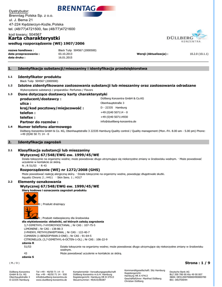 Dystrybutor: Brenntag Polska Sp. z o.o. ul. J. Bema 21 47-224 Kędzierzyn-Koźle, Polska tel. (48/77)4721500, fax (48/77)4721600 kod towaru: 504567 Karta charakterystki według rozporządzenie (WE) 1907/2006 nazwa handlowa : data przepracowania : data druku : Black Tulip 504567 (2000500) 03.10.2013 16.01.2015 Wersji (Aktualizacja) : 10.2.0 (10.1.1) 1. Identyfikacja substancji/mieszaniny i identyfikacja przedsiębiorstwa 1.1 Identyfikator produktu 1.2 Istotne zidentyfikowane zastosowania substancji lub mieszaniny oraz zastosowania odradzane Black Tulip 504567 (2000500) Wykorzystanie substancji / preparatów: Perfumes / Flavors 1.3 1.4 Dane dotyczące dostawcy karty charakterystyki Düllberg Konzentra GmbH & Co.KG producent/dostawcy : Obenhauptstraße 3 ulica : D - 22335 Hamburg kraj/kod pocztowy/miejscowość : +49 (0)40 507114 - 0 telefon : +49 (0)40 507114930 telefax : [email protected] Partner do rozmów : Numer telefonu alarmowego Düllberg Konzentra GmbH & Co. KG, Obenhauptstraße 3 22335 Hamburg Quality control / Quality management (Mon.-Fri. 8.00 am - 5.00 pm) Phone: +49 (0)40 50 71 14 - 0 2. Identyfikacja zagrożeń 2.1 Klasyfikacja substancji lub mieszaniny Wytycznej 67/548/EWG ew. 1999/45/WE Działa toksycznie na organizmy wodne; może powodowac długo utrzymujące się niekorzystne zmiany w środowisku wodnym. · Może powodować uczulenie w kontakcie ze skórą. N ; R 51/53 · R 43 Rozporządzenie (WE) nr 1272/2008 (GHS) Może powodować reakcję alergiczną skóry. · Działa toksycznie na organizmy wodne, powodując długotrwałe skutki. Aquatic Chronic 2 ; H411 · Skin Sens. 1 ; H317 2.2 Elementy oznakowania Wytycznej 67/548/EWG ew. 1999/45/WE litery kodowe i oznaczenia zagrożeń produktu Xi ; Produkt drażniący N ; Produkt niebezpieczny dla środowiska dla etykietowania: składniki, od których zależą zagrożenia 3,7-DIMETHYL-7-HYDROYXOCTANAL ; Nr CAS : 107-75-5 LIMONENE ; Nr CAS : 138-86-3 2-PHENYL METHYLENHEPTANAL ; Nr CAS : 122-40-7 CUMARIN (1-BENZOPYRAN-2-ONE) ; Nr CAS : 91-64-5 CITRONELLOL (3,7-DIMETHYL-6-OCTEN-1-OL) ; Nr CAS : 106-22-9 zdania R 51/53 Działa toksycznie na organizmy wodne; może powodowac długo utrzymujące się niekorzystne zmiany w środowisku wodnym. 43 Może powodować uczulenie w kontakcie ze skórą. zdania S Strona : 1 / 9 ( PL / D ) Düllberg Konzentra GmbH & Co. KG Obenhauptstraße 3 D-22335 Hamburg Tel +49 - 40/50 71 14 - 0 Fax +49 - 40/50 71 14 - 930 [email protected] www.duellberg-konzentra.de Komplementär: Verwaltungsgesellschaft Düllberg Konzentra m.b.H. Hamburg Registergericht: Hamburg HR B 37513 Steuernummer: 49/615/00287 Kommanditgesellschaft: Sitz Hamburg Registergericht: Hamburg HR A 47413 Geschäftsführer: Manfred Düllberg Christian Düllberg Deutsche Bank AG BLZ 200 700 00 Kto 49 00 007 IBAN: DE51200700000490000700 BIC: DEUTDEHH Karta charakterystki według rozporządzenie (WE) 1907/2006 nazwa handlowa : data przepracowania : data druku : 61 37 24 Black Tulip 504567 (2000500) 03.10.2013 16.01.2015 Wersji (Aktualizacja) : 10.2.0 (10.1.1) Unikać zrzutów do środowiska. Postępować zgodnie z instrukcją lub kartą charakterystyki. Nosić odpowiednie rękawice ochronne. Unikać zanieczyszczenia skóry. Rozporządzenie (WE) nr 1272/2008 (GHS) Piktogramy zagrożeń Środowisko (GHS09) · Wykrzyknik (GHS07) Słowo hasłowe Uwaga dla etykietowania: składniki, od których zależą zagrożenia 3,7-DIMETHYL-7-HYDROYXOCTANAL ; Nr CAS : 107-75-5 LIMONENE ; Nr CAS : 138-86-3 2-PHENYL METHYLENHEPTANAL ; Nr CAS : 122-40-7 CUMARIN (1-BENZOPYRAN-2-ONE) ; Nr CAS : 91-64-5 CITRONELLOL (3,7-DIMETHYL-6-OCTEN-1-OL) ; Nr CAS : 106-22-9 Wskazówki zagrożeń H317 Może powodować reakcję alergiczną skóry. H411 Działa toksycznie na organizmy wodne, powodując długotrwałe skutki. Wskazówki bezpieczeństwa P261 Unikać wdychania pyłu/dymu/gazu/mgły/par/rozpylonej cieczy. P272 Zanieczyszczonej odzieży ochronnej nie wynosić poza miejsce pracy. P273 Unikać uwolnienia do środowiska. P333/313 W przypadku wystąpienia podrażnienia skóry lub wysypki: Zasięgnąć porady/zgłosić się pod opiekę lekarza. P321 Zastosować określone leczenie (patrz ... na etykiecie). P302/352 W PRZYPADKU KONTAKTU ZE SKÓRĄ: Umyć dużą ilością wody z mydłem. 2.3 Inne zagrożenia brak 3. Skład/informacja o składnikach 3.2 Mieszaniny niebezpieczne substancje składowe 2-PHENYLETHANOL ; Nr WE : 200-456-2; Nr CAS : 60-12-8 Udział : 10 - 15 % Zaszeregowanie 67/548/EWG : Xi ; R36 Zaszeregowanie 1907/2006 (GHS) : Eye Irrit. 2 ; H319 ALPHA, ALPHA-DIMETHYLPHENYLETHYLACETATE ; Nr WE : 205-781-1; Nr CAS : 151-05-3 Udział : 10 - 15 % Zaszeregowanie 67/548/EWG : R52/53 Zaszeregowanie 1907/2006 (GHS) : Aquatic Chronic 3 ; H412 P-T-BUTYLCYCLOHEXYLACETATE ; Nr WE : 250-954-9; Nr CAS : 32210-23-4 Udział : 5 - 10 % Zaszeregowanie 67/548/EWG : N ; R51/53 Zaszeregowanie 1907/2006 (GHS) : Aquatic Chronic 2 ; H411 LINALOOL (DIMETHYL-1,6-OCTADIEN-3-OL) ; Nr WE : 201-134-4; Nr CAS : 78-70-6 Udział : 5 - 10 % Zaszeregowanie 67/548/EWG : Xi ; R38 Strona : 2 / 9 ( PL / D ) Düllberg Konzentra GmbH & Co. KG Obenhauptstraße 3 D-22335 Hamburg Tel +49 - 40/50 71 14 - 0 Fax +49 - 40/50 71 14 - 930 [email protected] www.duellberg-konzentra.de Komplementär: Verwaltungsgesellschaft Düllberg Konzentra m.b.H. Hamburg Registergericht: Hamburg HR B 37513 Steuernummer: 49/615/00287 Kommanditgesellschaft: Sitz Hamburg Registergericht: Hamburg HR A 47413 Geschäftsführer: Manfred Düllberg Christian Düllberg Deutsche Bank AG BLZ 200 700 00 Kto 49 00 007 IBAN: DE51200700000490000700 BIC: DEUTDEHH Karta charakterystki według rozporządzenie (WE) 1907/2006 nazwa handlowa : data przepracowania : data druku : Black Tulip 504567 (2000500) 03.10.2013 16.01.2015 Zaszeregowanie 1907/2006 (GHS) : Wersji (Aktualizacja) : 10.2.0 (10.1.1) Skin Irrit. 2 ; H315 3,7-DIMETHYL-7-HYDROYXOCTANAL ; Nr WE Udział : Zaszeregowanie 67/548/EWG : Zaszeregowanie 1907/2006 (GHS) : : 203-518-7; Nr CAS : 107