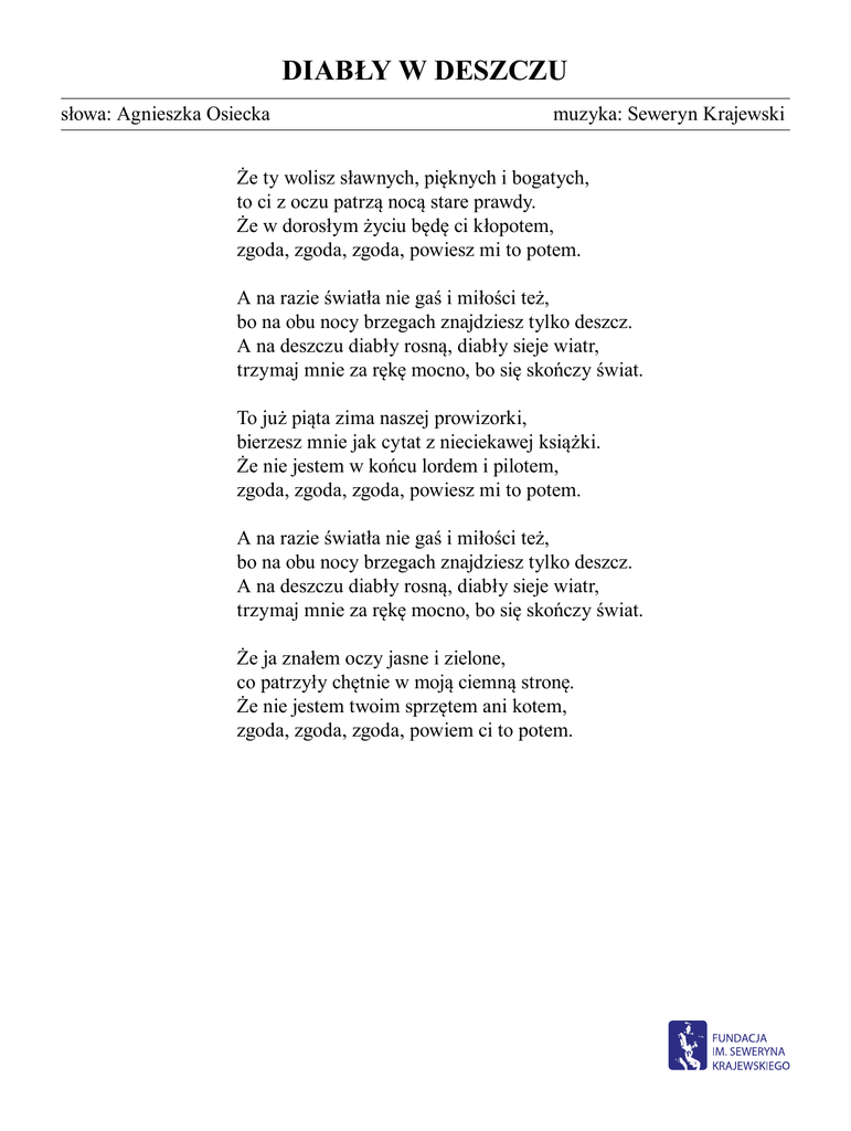 DIABŁY W DESZCZU słowa: Agnieszka Osiecka muzyka: Seweryn Krajewski Że ty wolisz sławnych, pięknych i bogatych, to ci z oczu patrzą nocą stare prawdy. Że w dorosłym życiu będę ci kłopotem, zgoda, zgoda, zgoda, powiesz mi to potem. A na razie światła nie gaś i miłości też, bo na obu nocy brzegach znajdziesz tylko deszcz. A na deszczu diabły rosną, diabły sieje wiatr, trzymaj mnie za rękę mocno, bo się skończy świat. To już piąta zima naszej prowizorki, bierzesz mnie jak cytat z nieciekawej książki. Że nie jestem w końcu lordem i pilotem, zgoda, zgoda, zgoda, powiesz mi to potem. A na razie światła nie gaś i miłości też, bo na obu nocy brzegach znajdziesz tylko deszcz. A na deszczu diabły rosną, diabły sieje wiatr, trzymaj mnie za rękę mocno, bo się skończy świat. Że ja znałem oczy jasne i zielone, co patrzyły chętnie w moją ciemną stronę. Że nie jestem twoim sprzętem ani kotem, zgoda, zgoda, zgoda, powiem ci to potem.